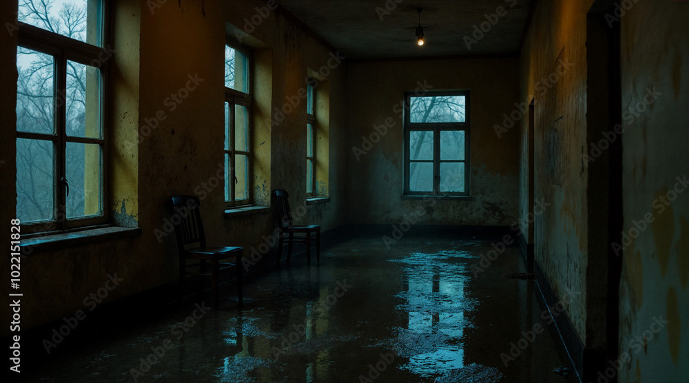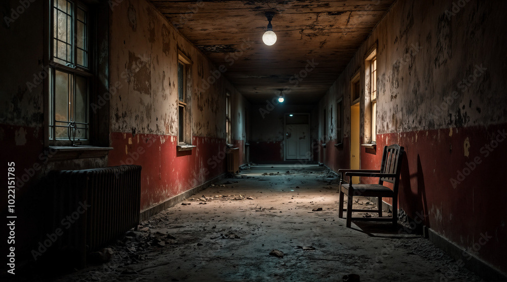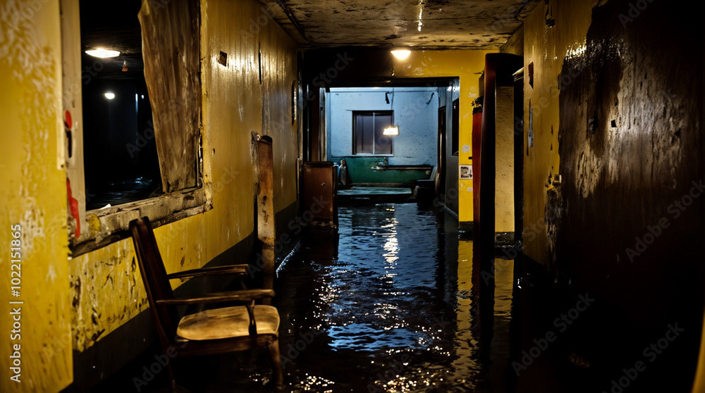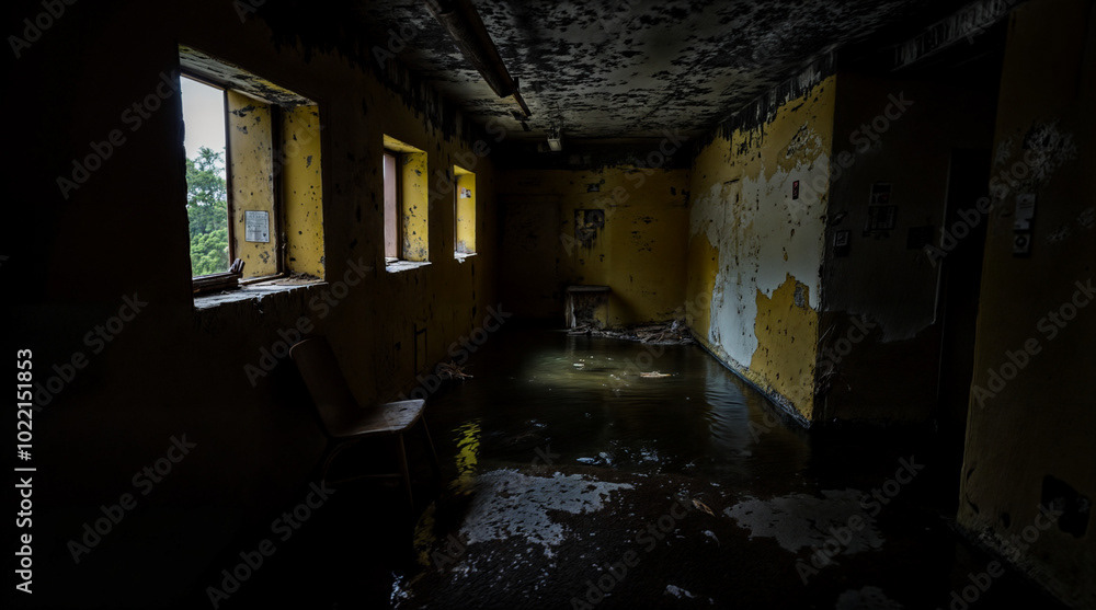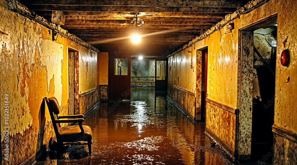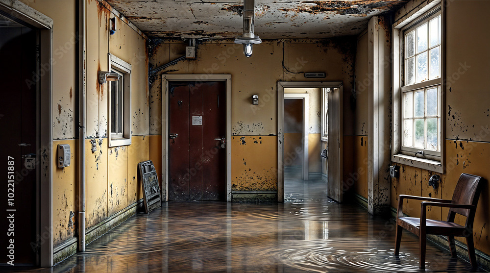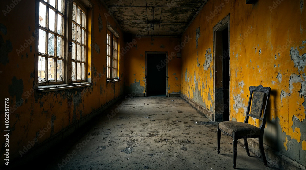 This image captures a haunting and atmospheric scene of an abandoned hallway with peeling yellow paint, dim lighting, and a single chair positioned against the wall. The floor is wet, reflecting the overhead light, adding an eerie feel to the space. The old doors and scattered notices give the impression of a once-busy area now left to decay.