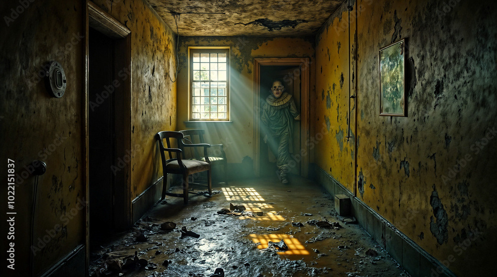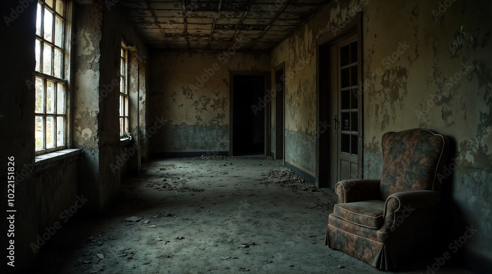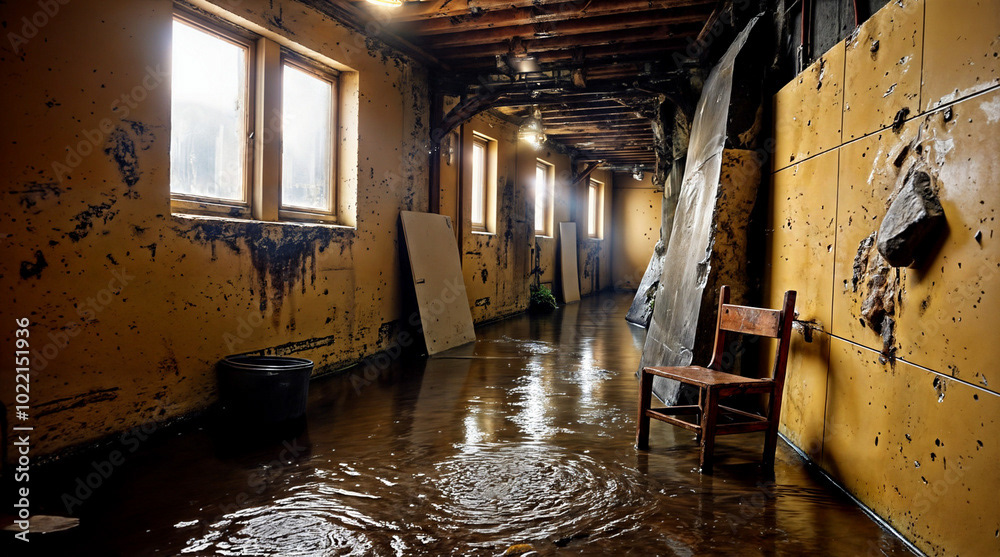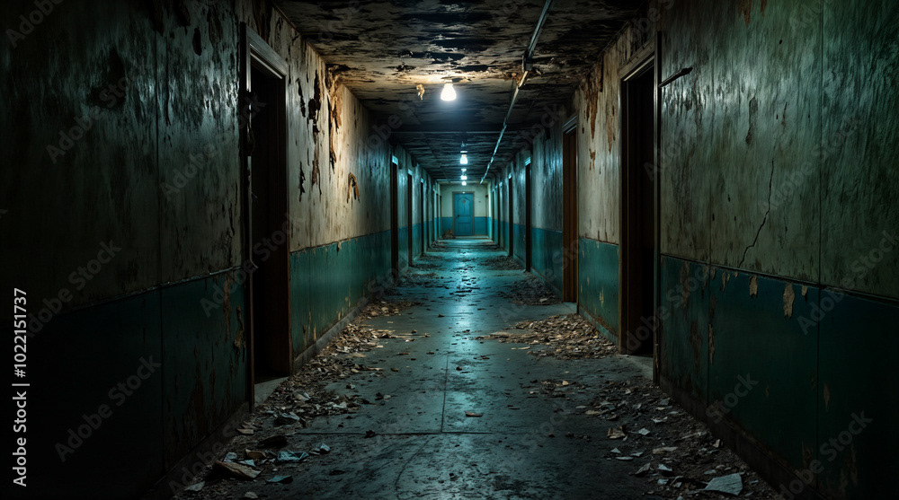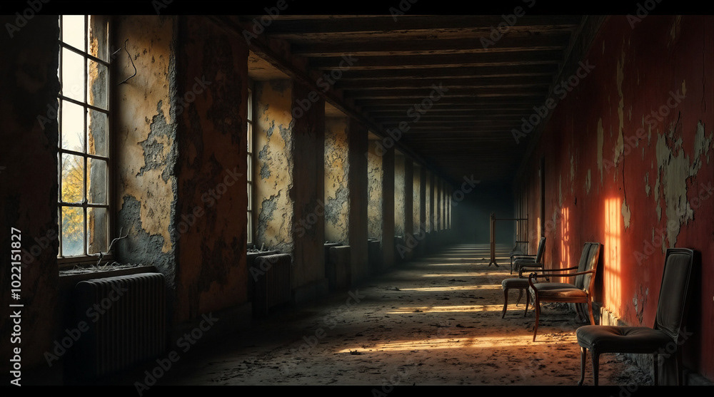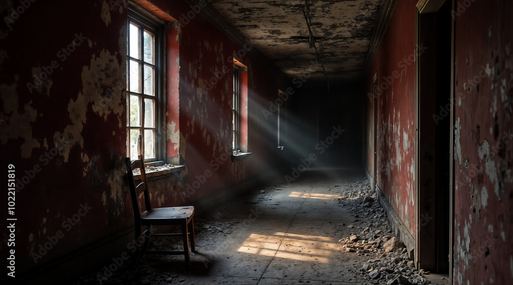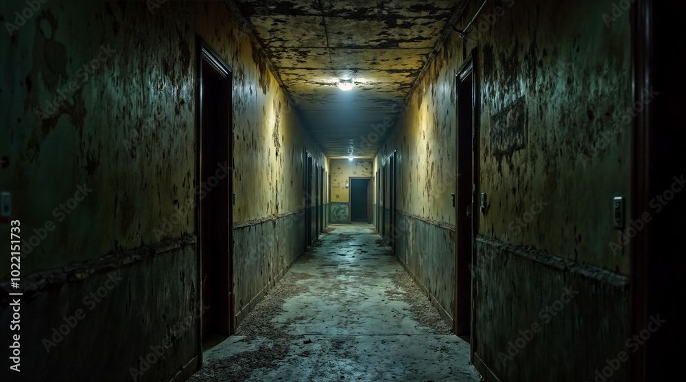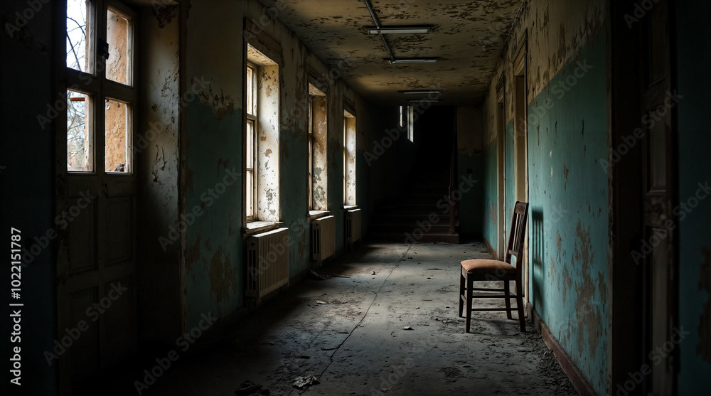 This image captures a haunting and atmospheric scene of an abandoned hallway with peeling yellow paint, dim lighting, and a single chair positioned against the wall. The floor is wet, reflecting the overhead light, adding an eerie feel to the space. The old doors and scattered notices give the impression of a once-busy area now left to decay.
