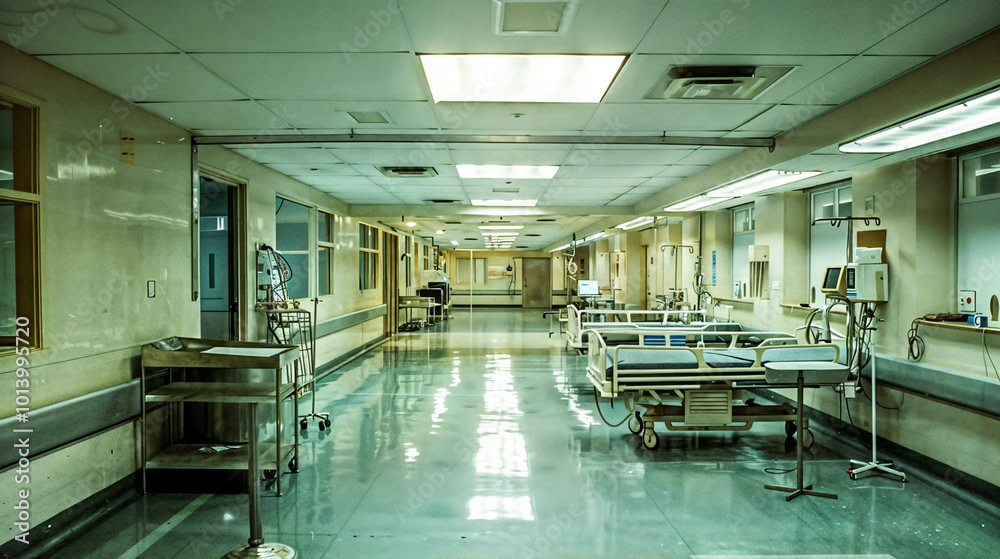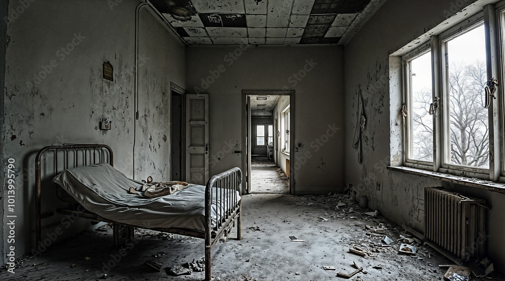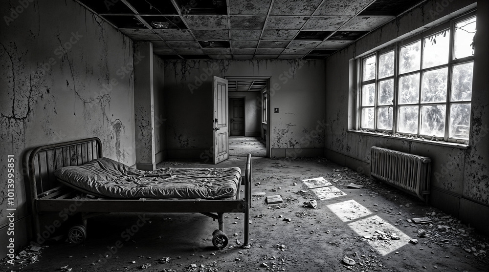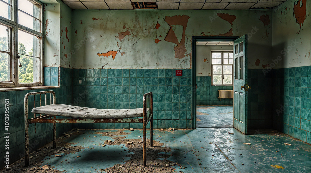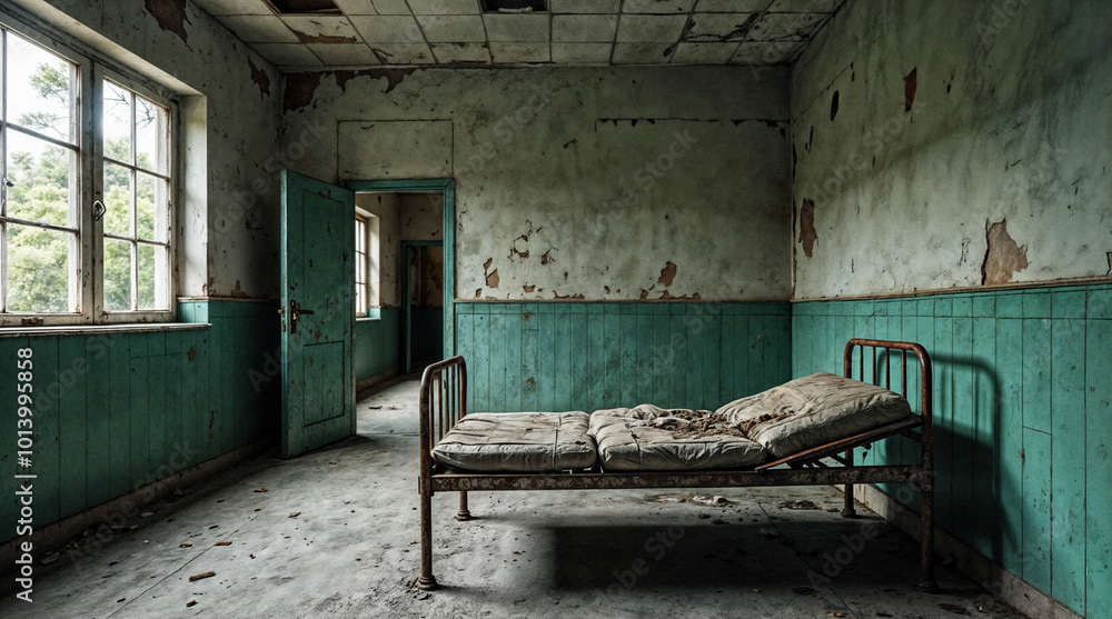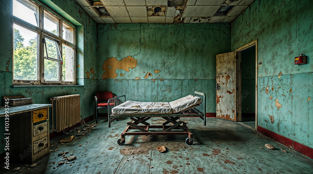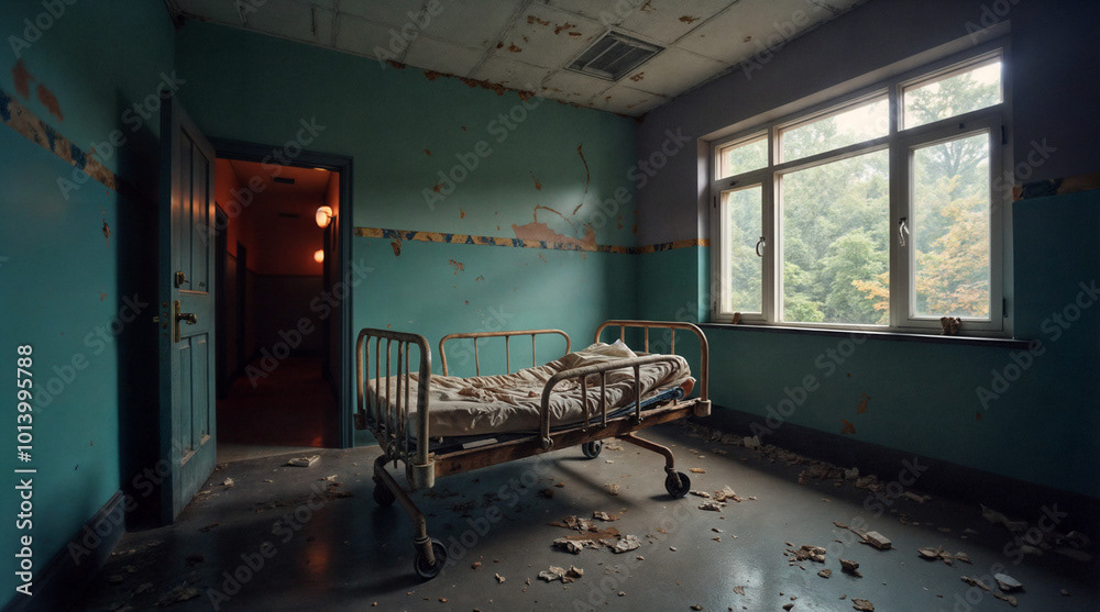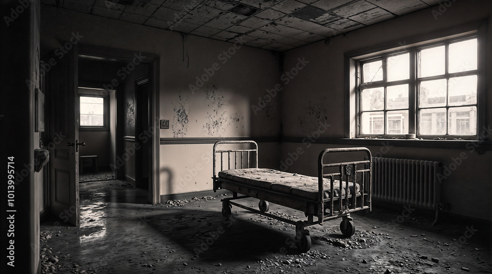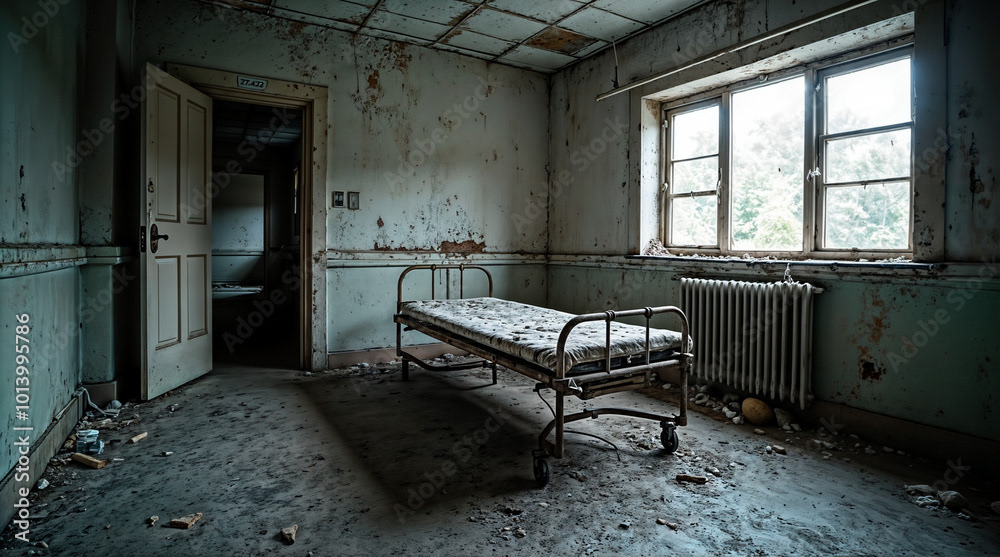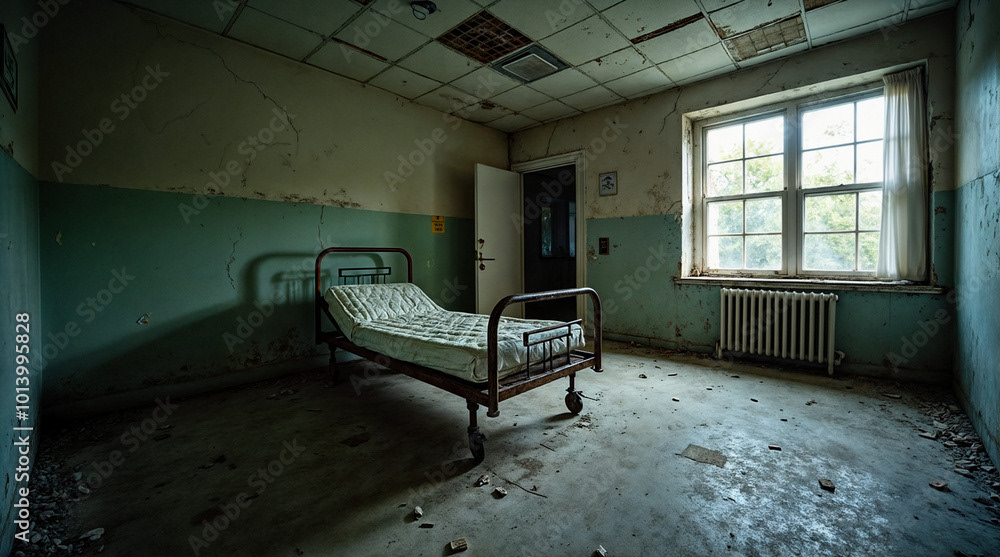An eerie and atmospheric image of an abandoned hospital room, featuring a rusty bed on wheels, cracked walls with peeling paint, and a desolate, decaying interior. The window lets in soft natural light, casting shadows that emphasize the forgotten and deteriorated state of the room.