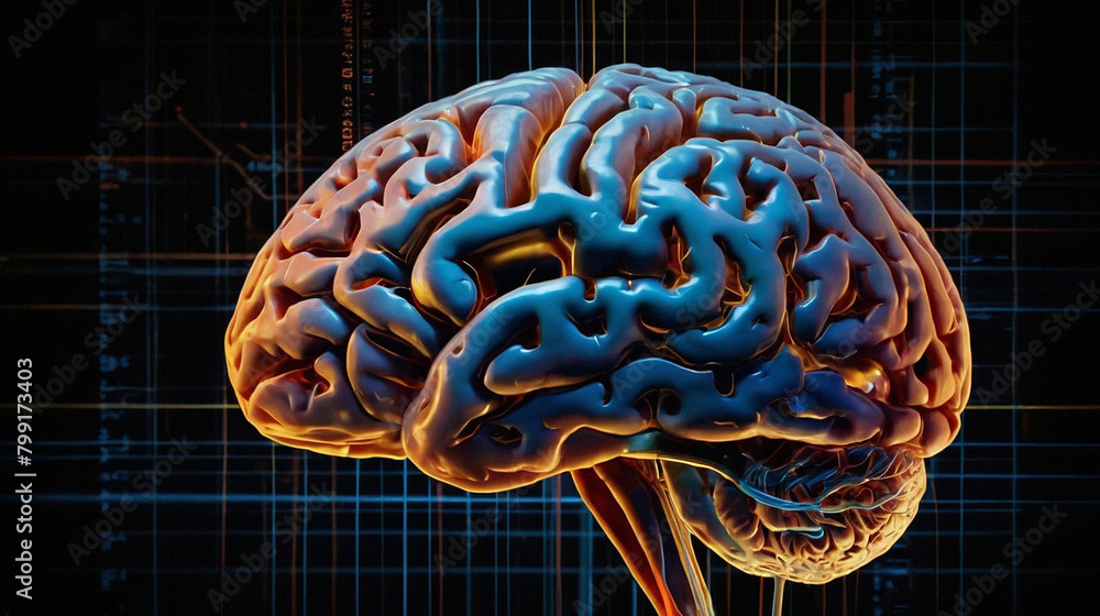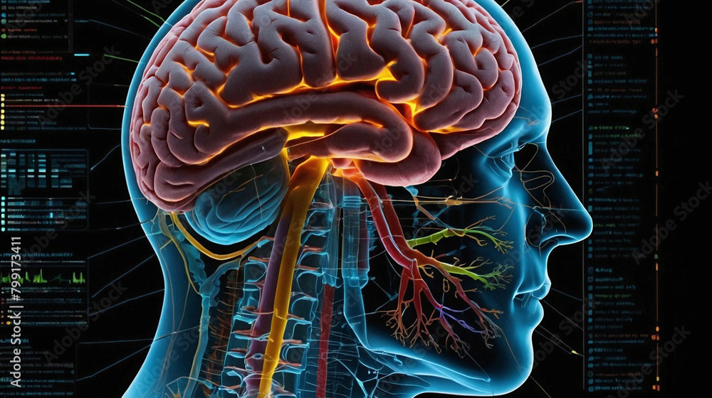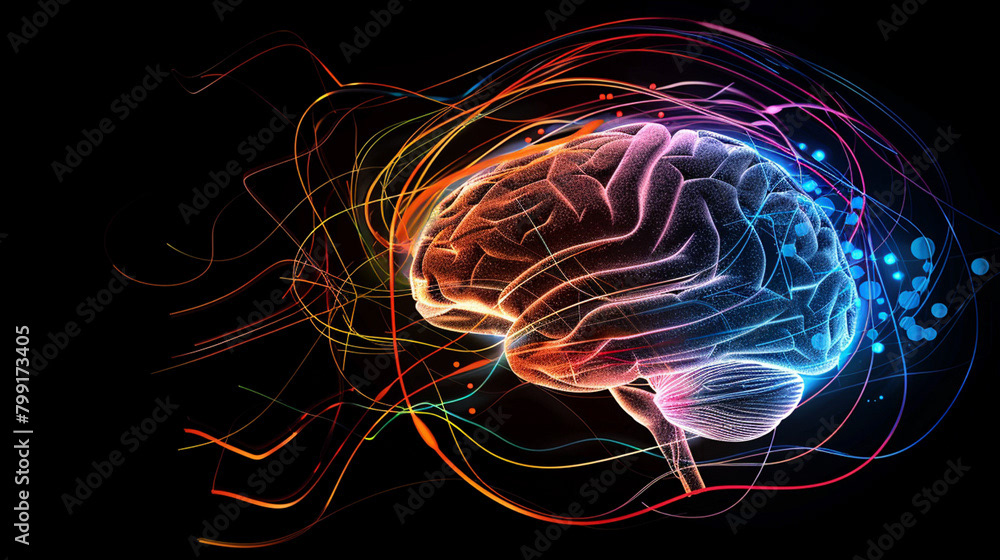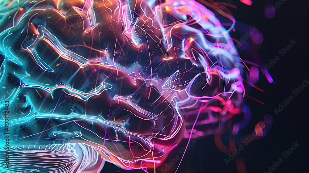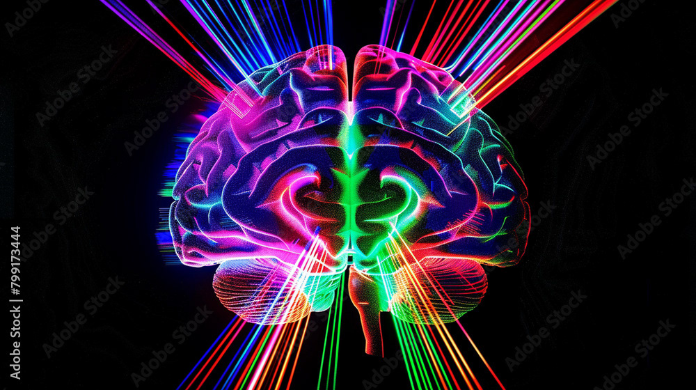 This striking image features a vibrant, abstract representation of the human brain, illuminated with an array of colorful laser beams radiating from its structure. The brain is depicted in a neon-like style, with bold, glowing colors that highlight the intricate pathways and connections within.