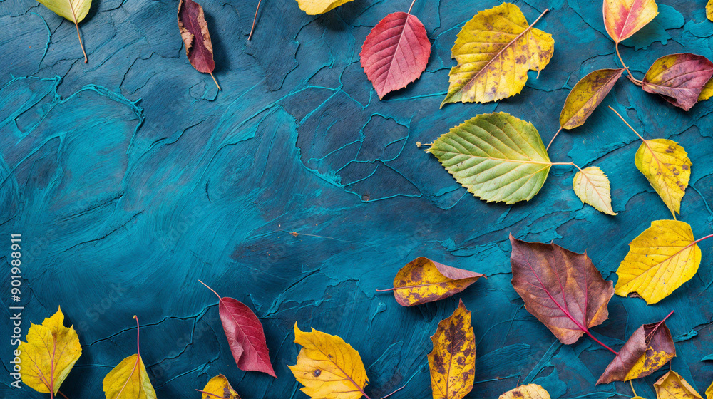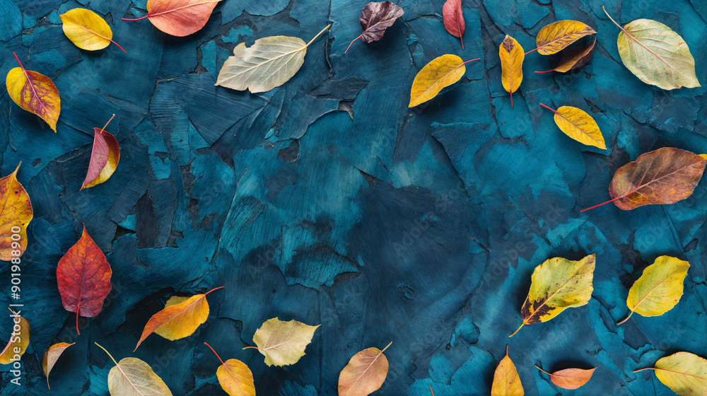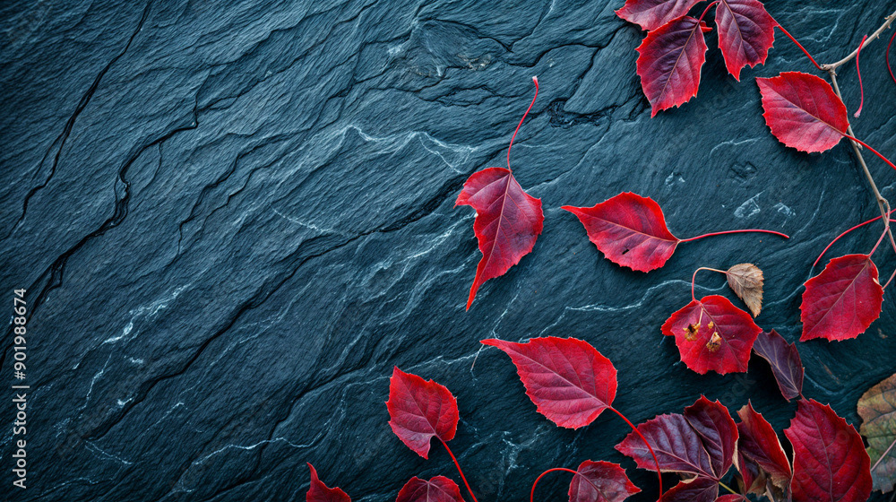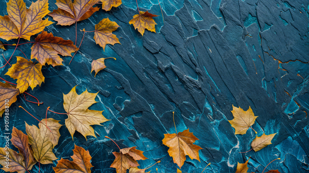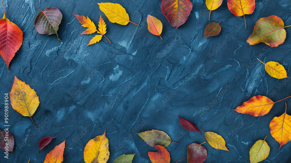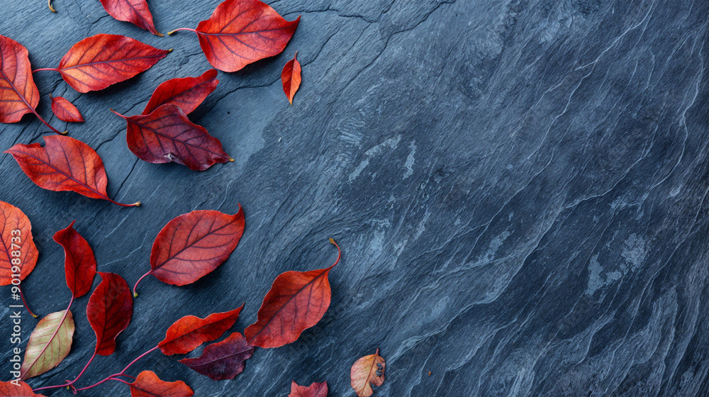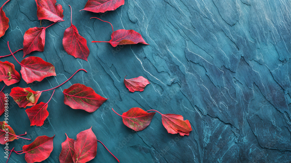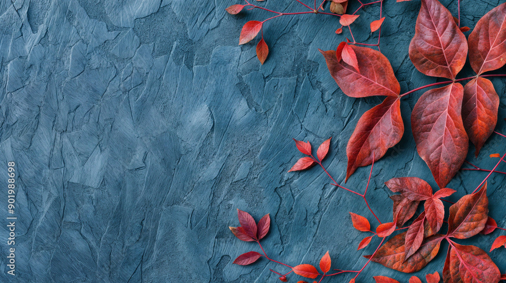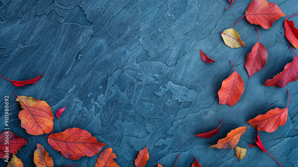 Autumn background with colored red leaves on blue slate background. Top view, copy space