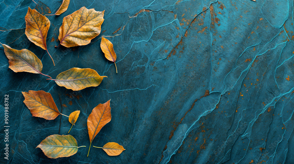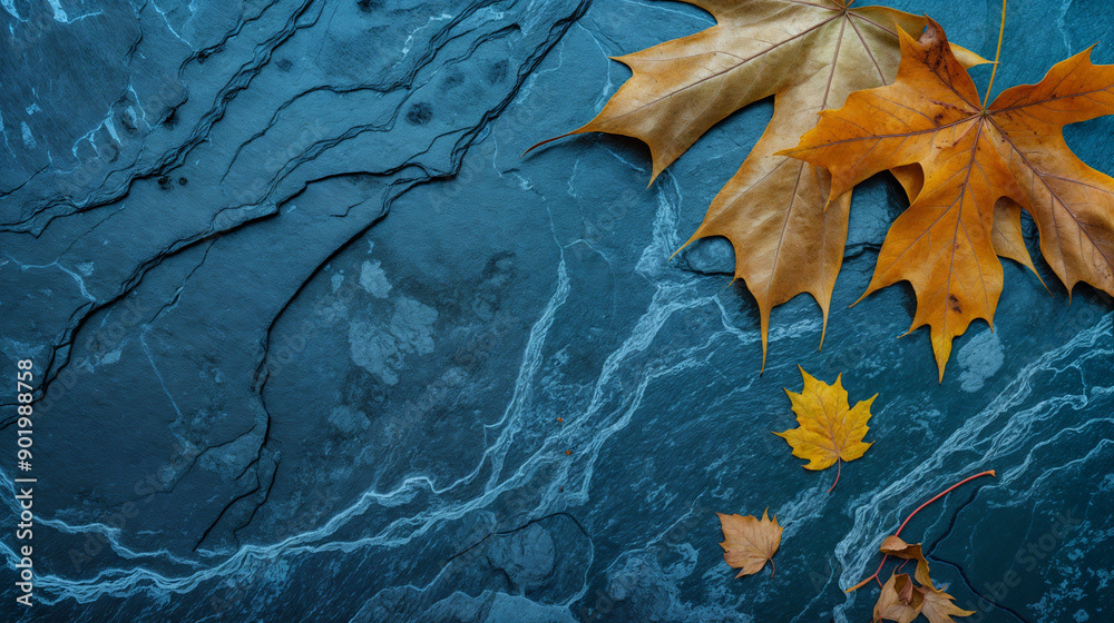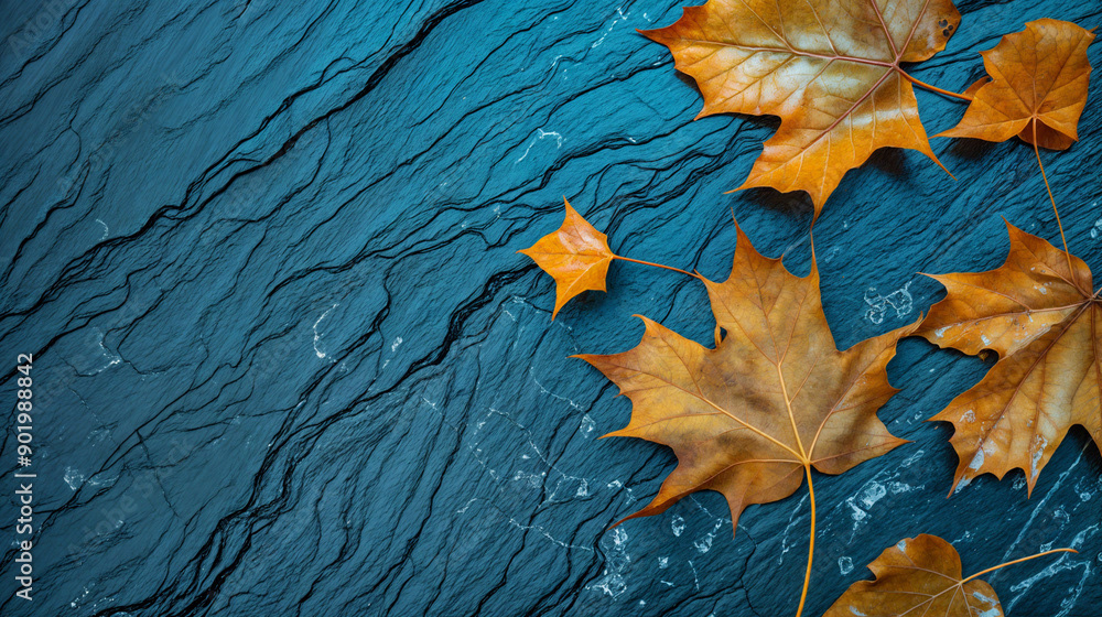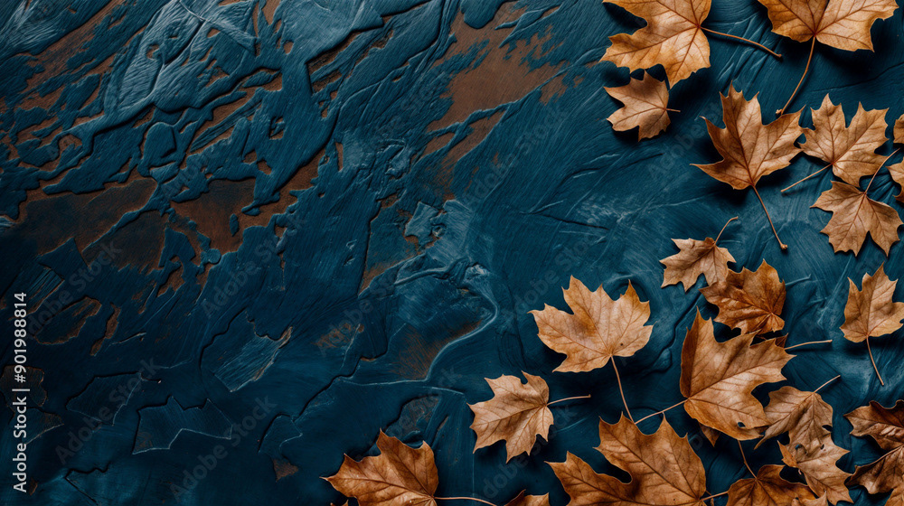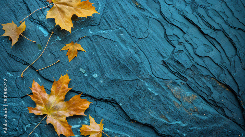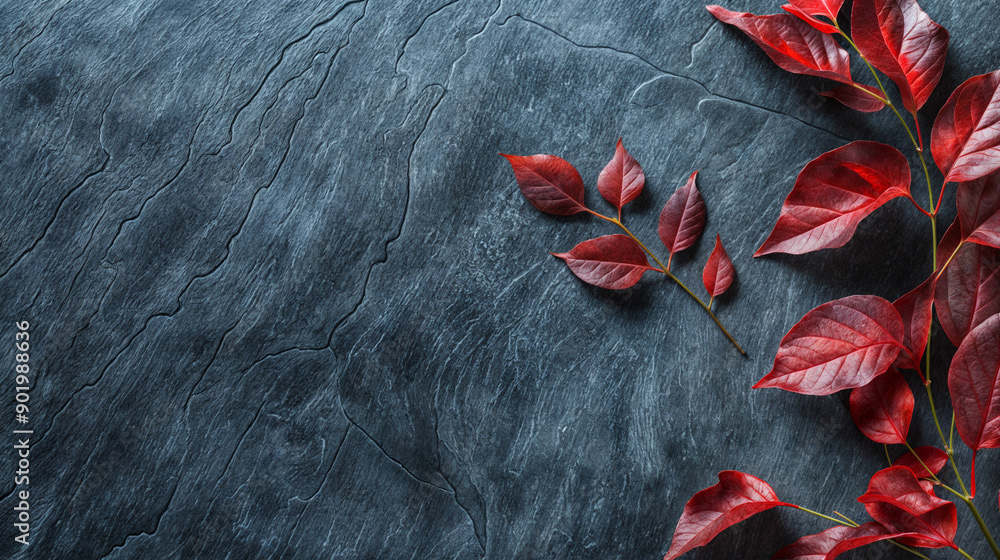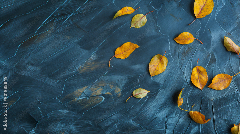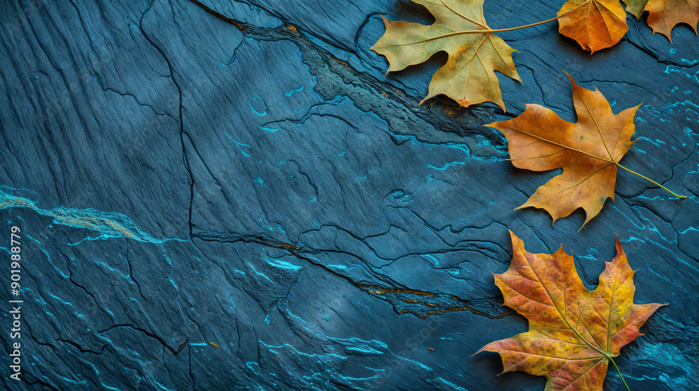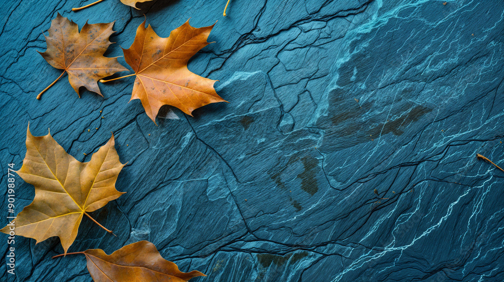 Autumn background with colored red leaves on blue slate background. Top view, copy space