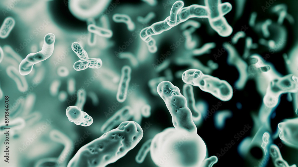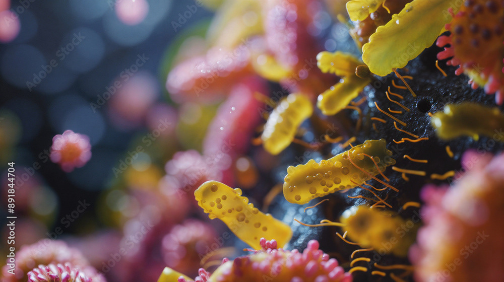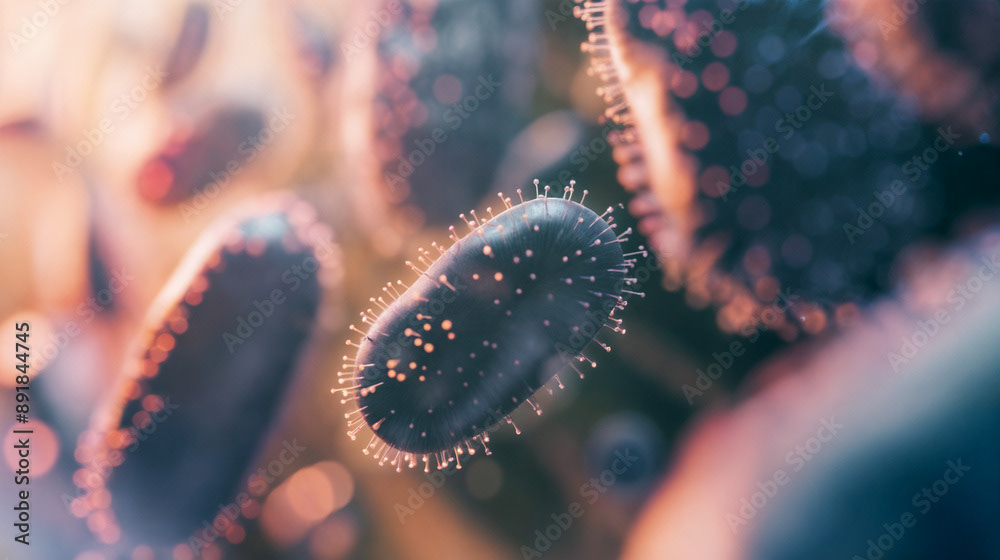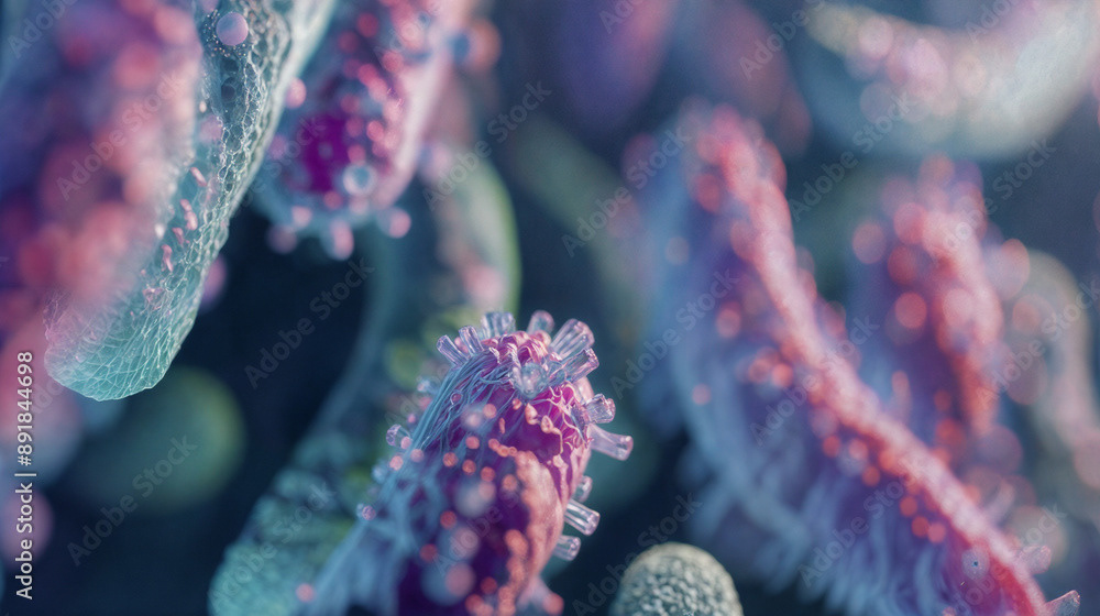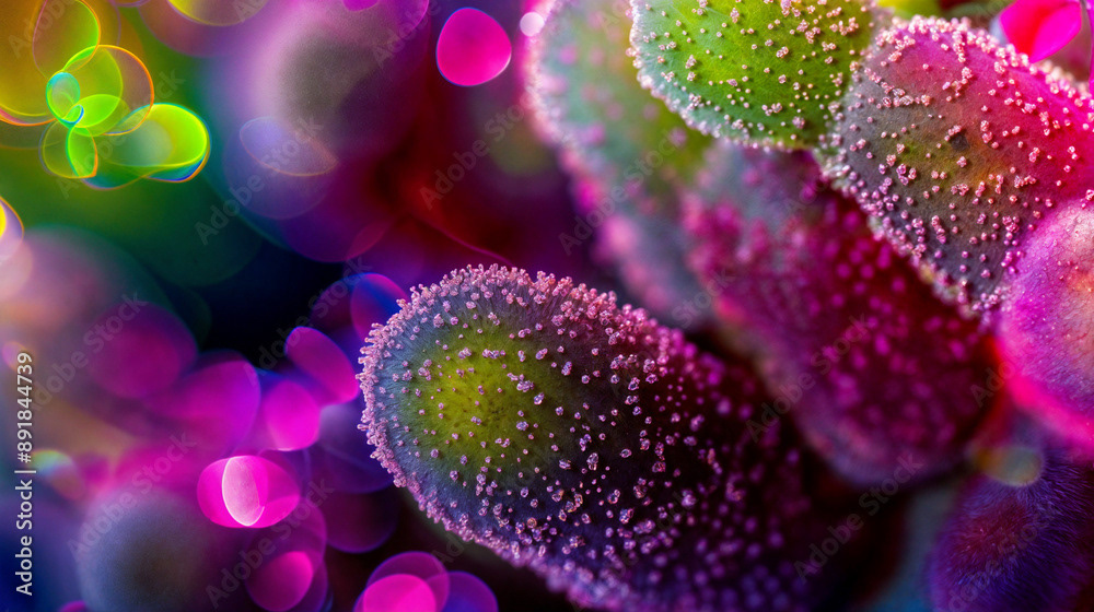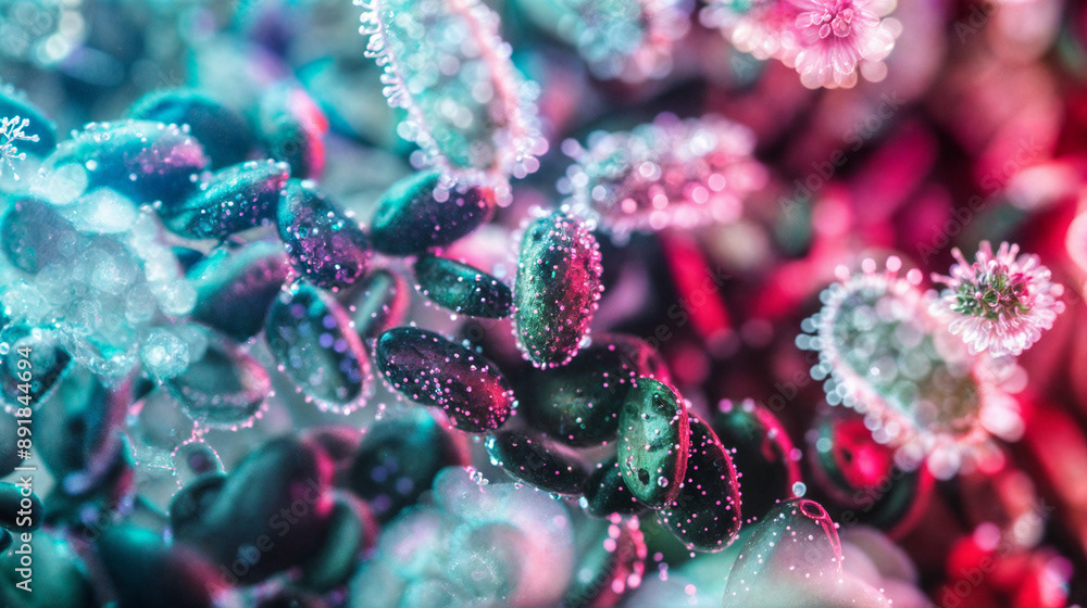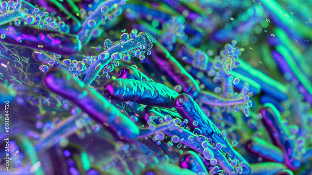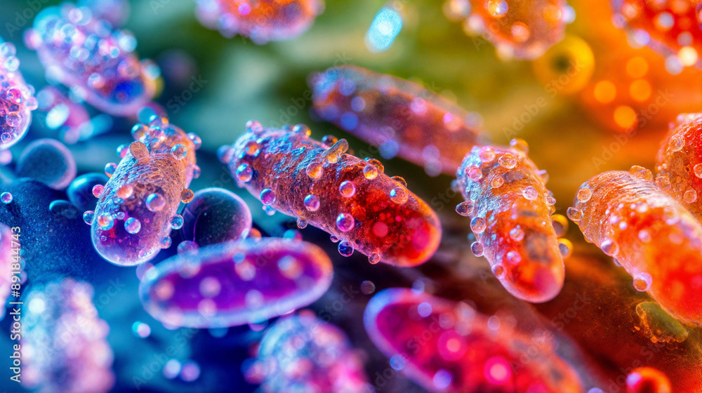 This striking macro photograph offers an ultra-realistic view of bacteria, showcasing the vibrant and intricate world of microorganisms.