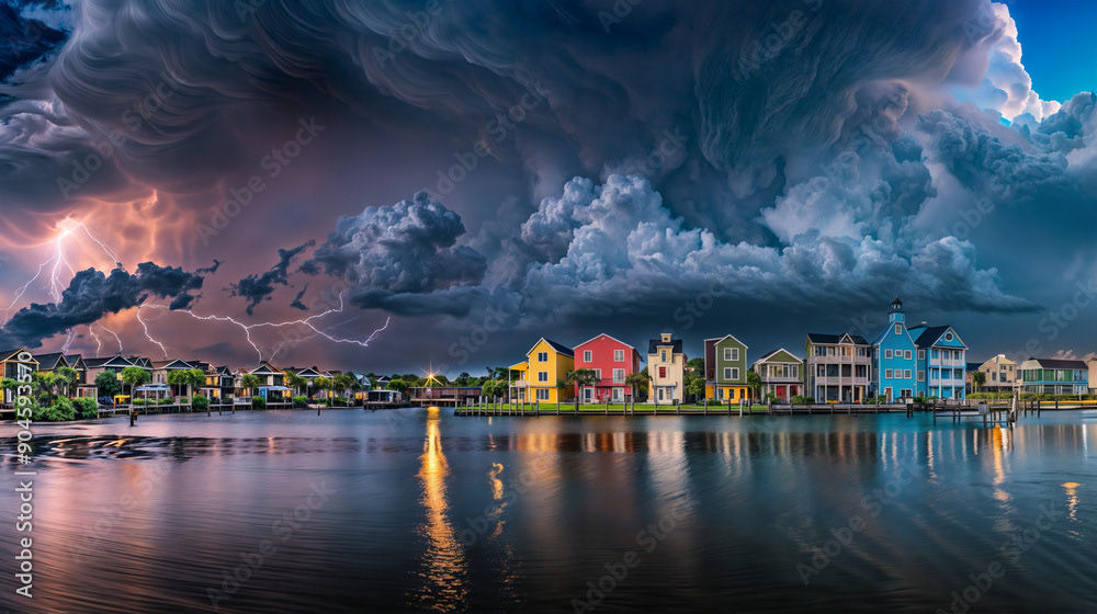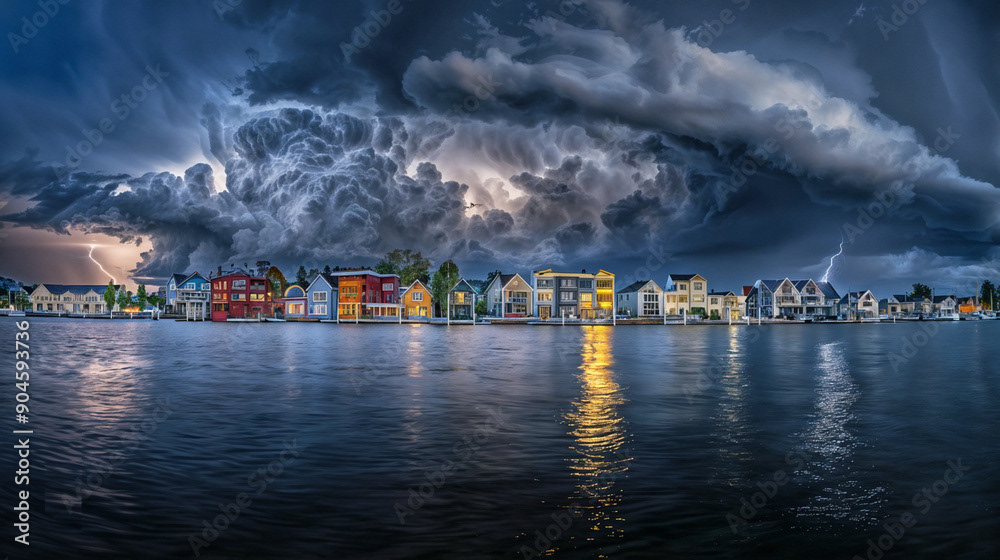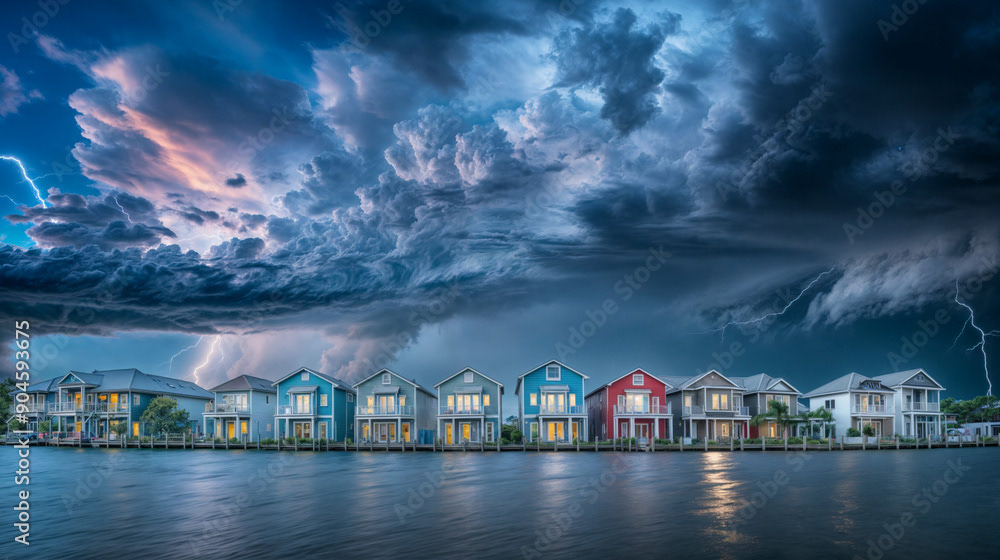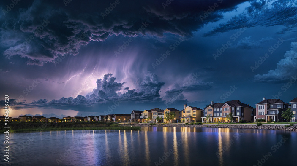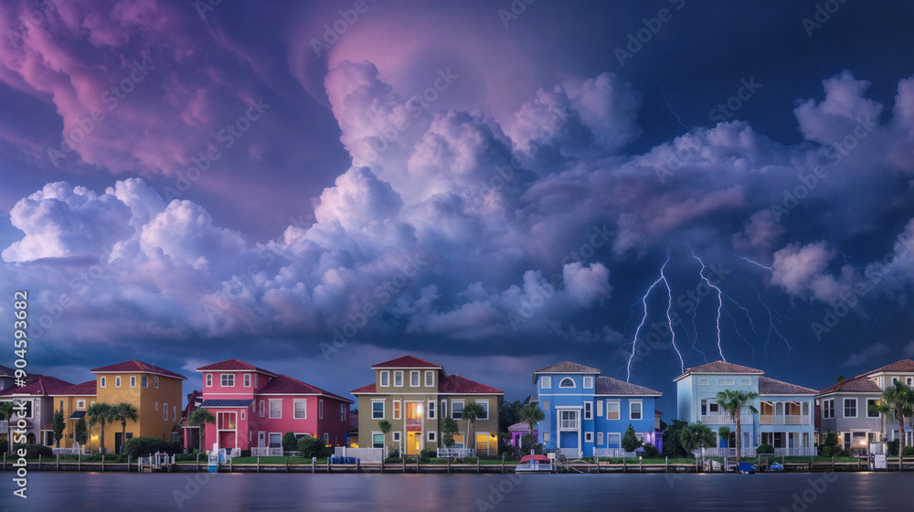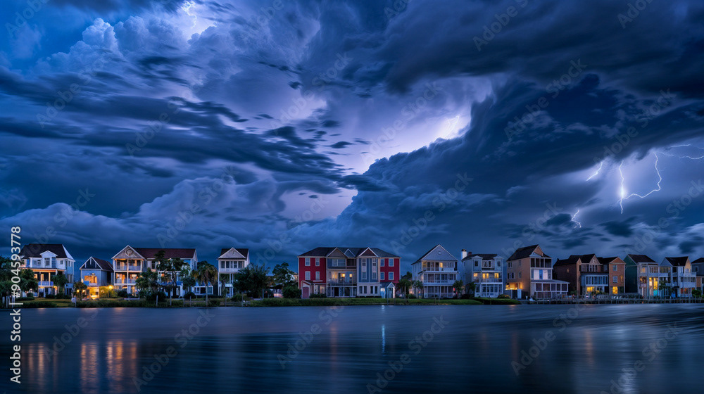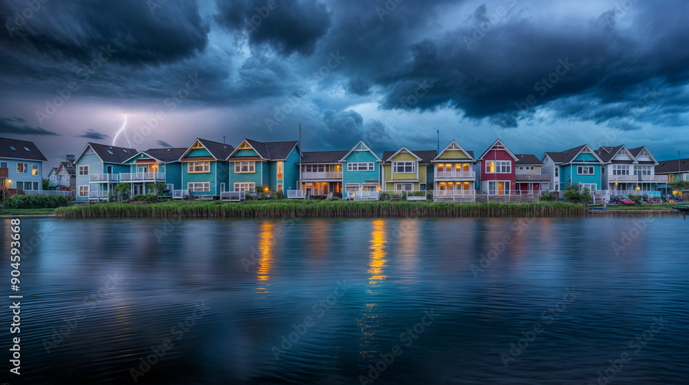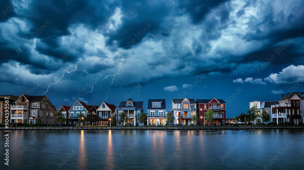 Waterfront homes, lightning storm, dramatic sky, colorful houses, night photography, weather, stormy night, reflections, nature, architecture, suburban neighborhood