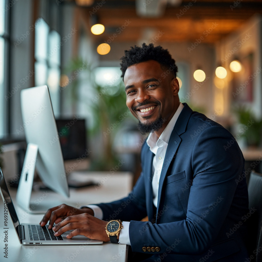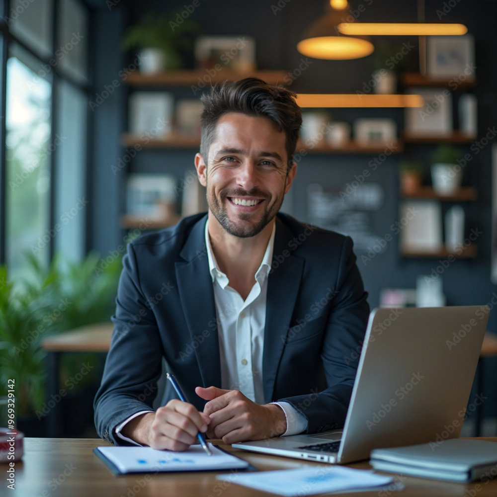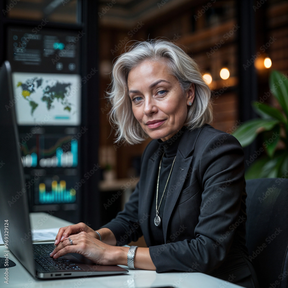 A professional executive sits confidently at a desk, working on a laptop in a modern office setting.