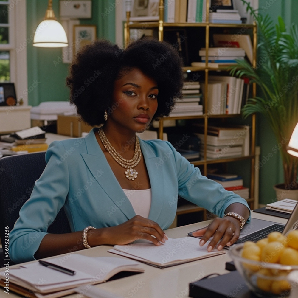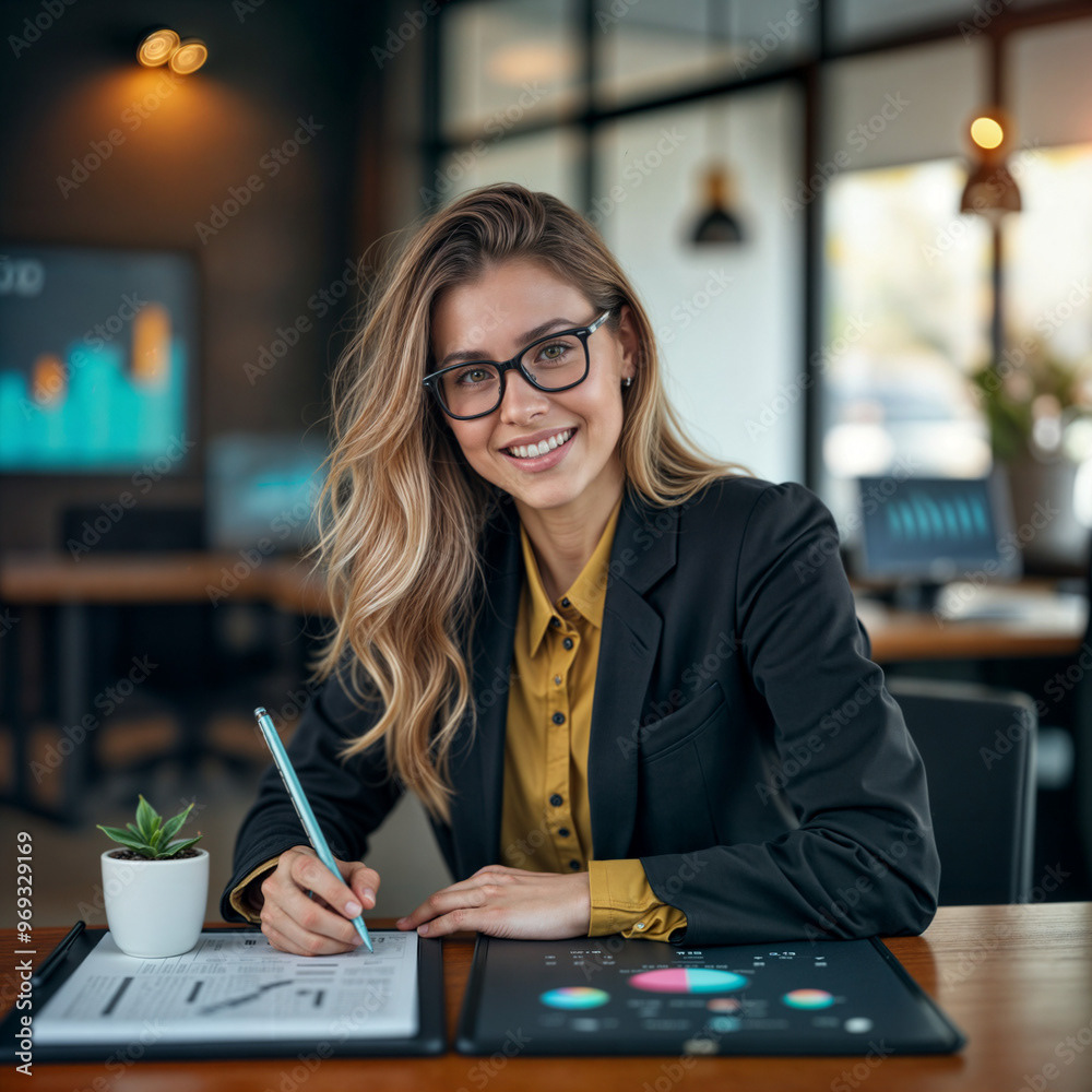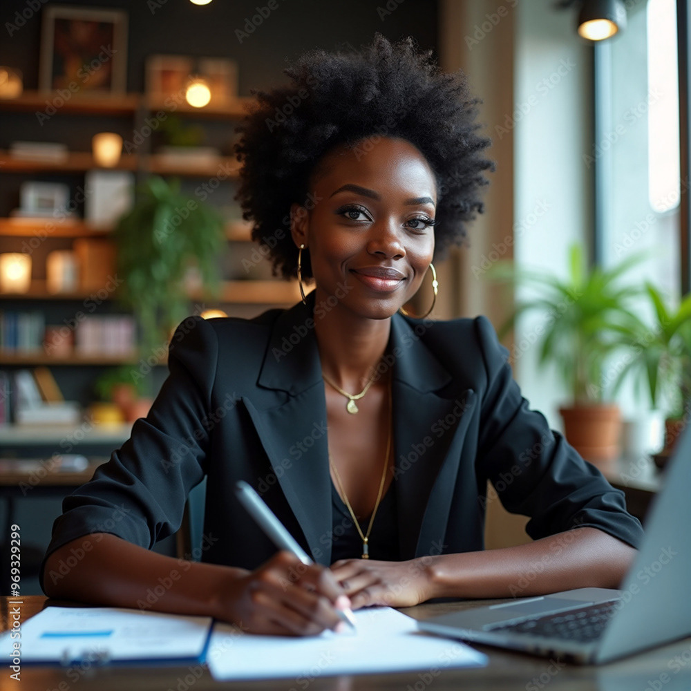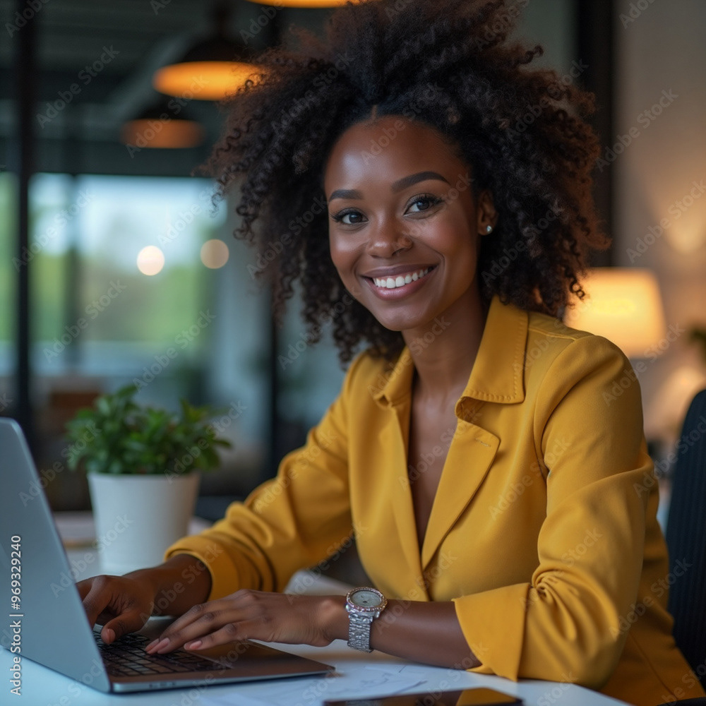 A professional executive sits confidently at a desk, working on a laptop in a modern office setting.