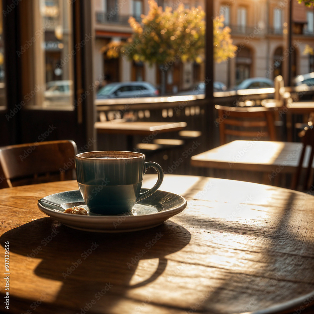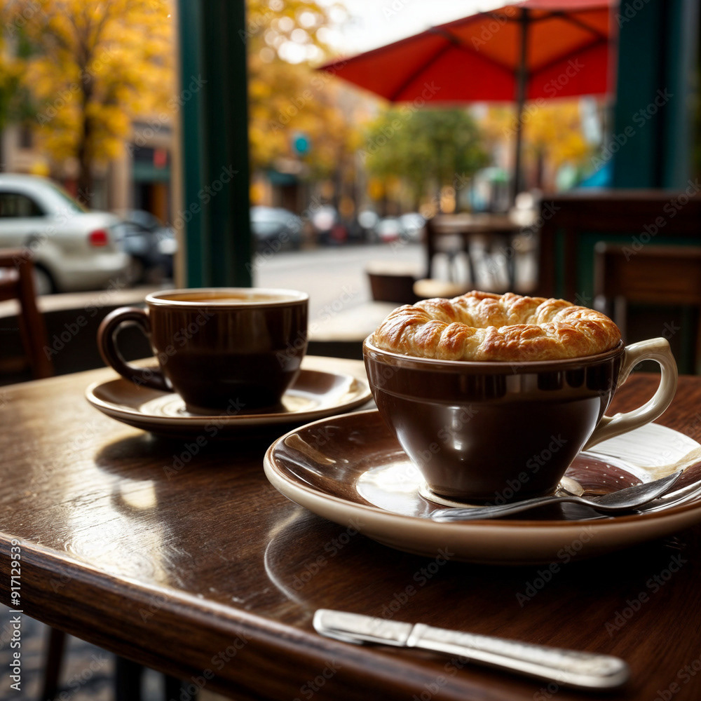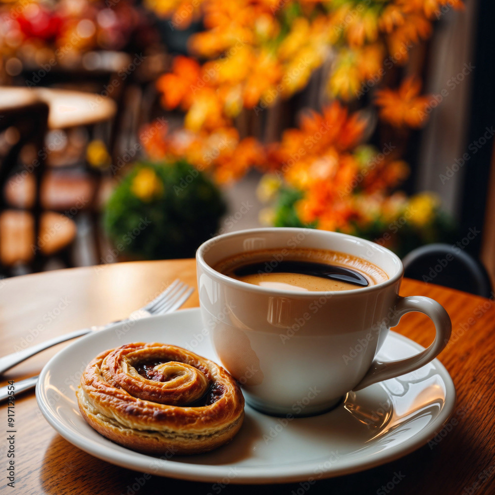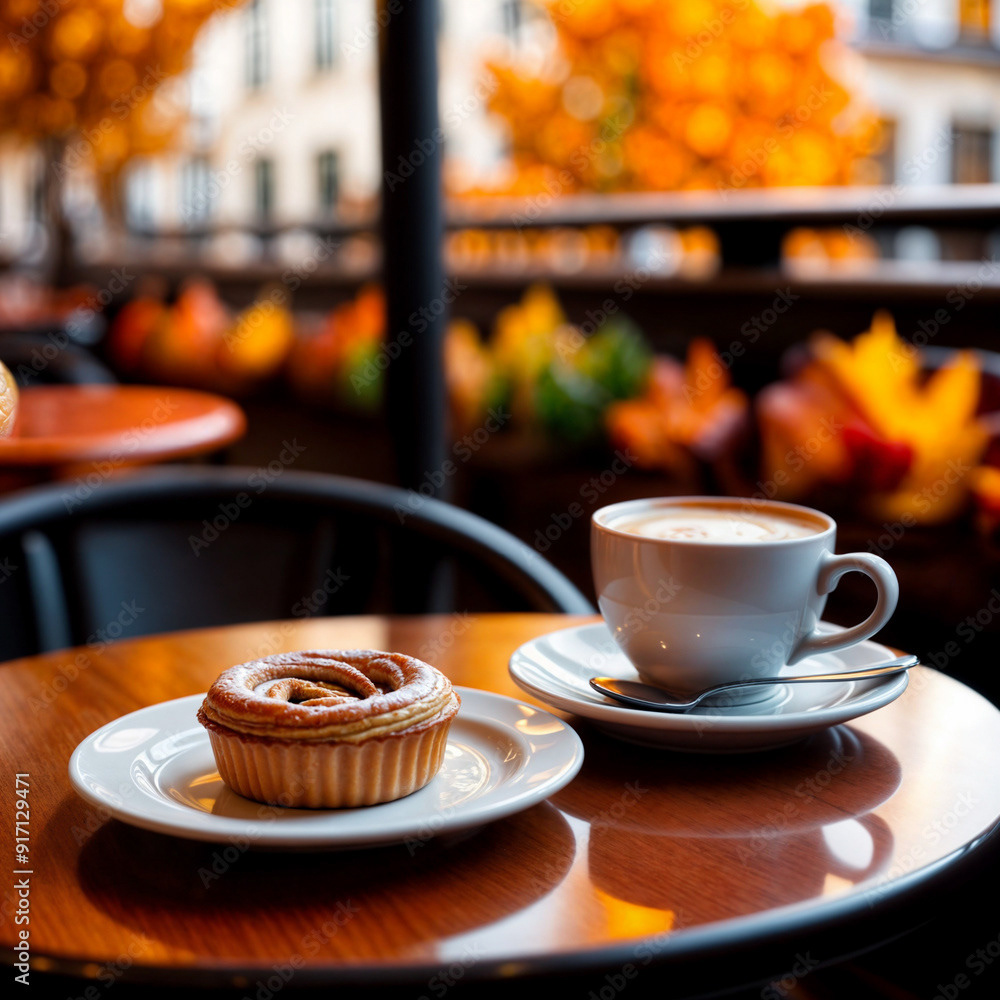 Close-up of a bistro cafe table with a cup of coffee and a pastry on a plate. The scene is bathed in inviting late afternoon sunlight, and warm autumn colors, capturing the cozy ambiance of the season.