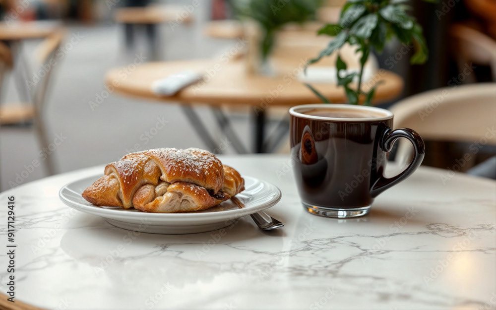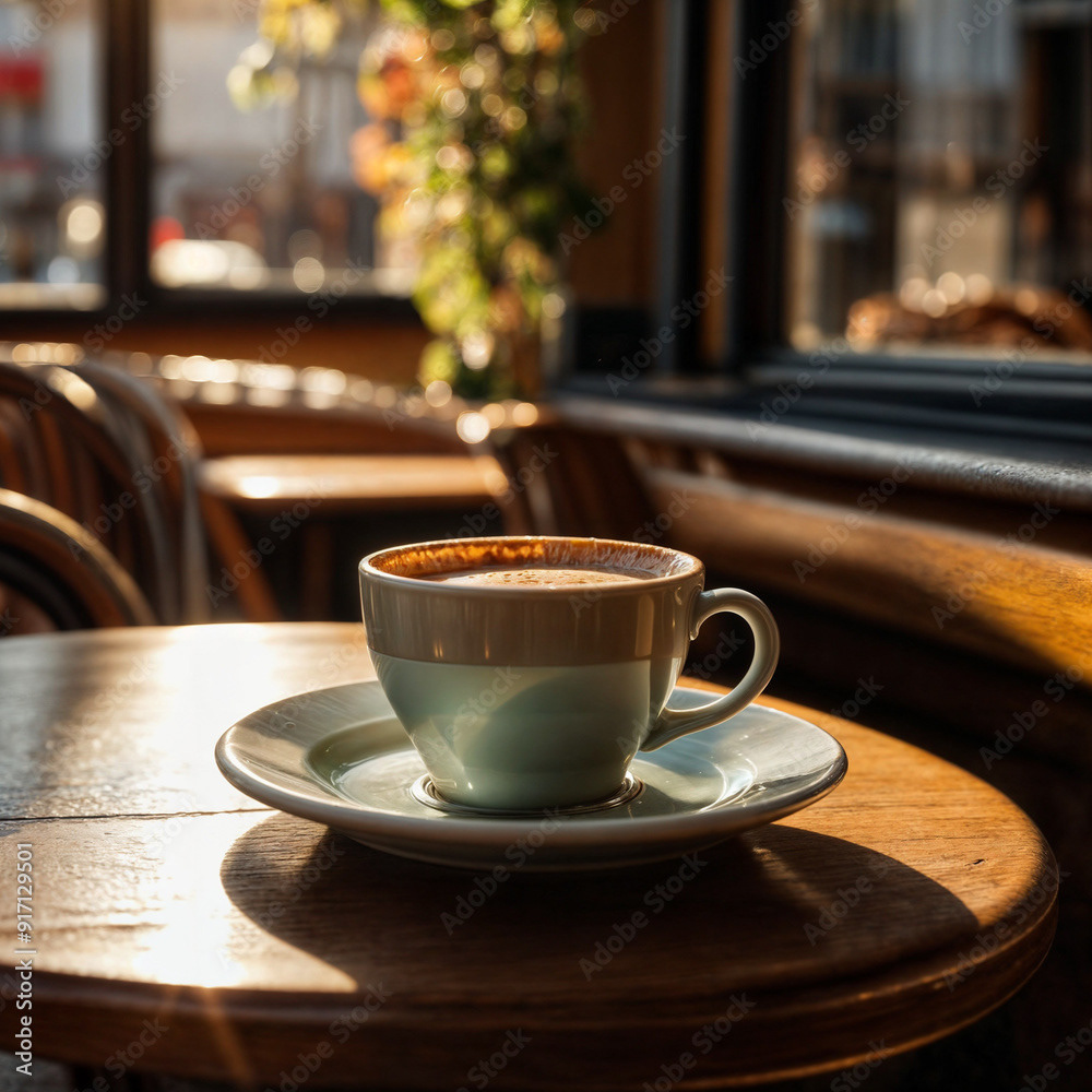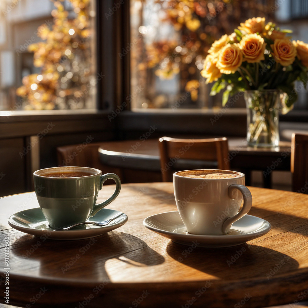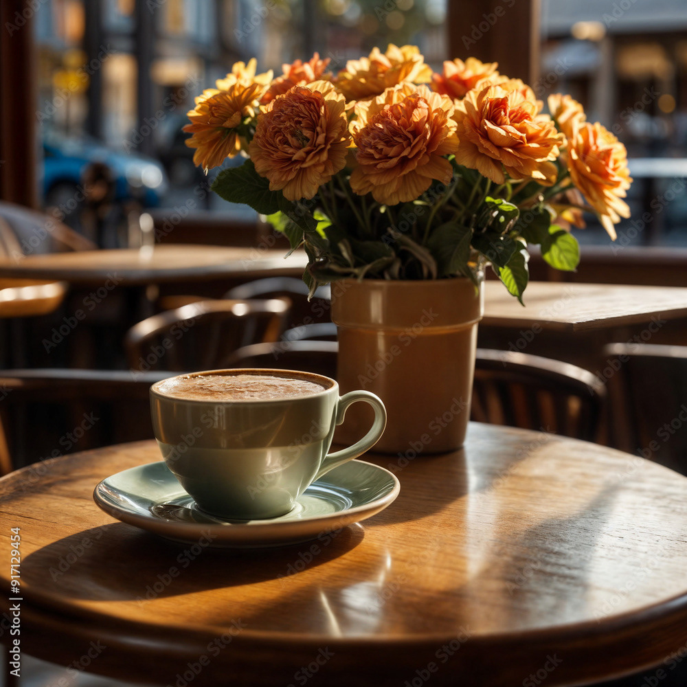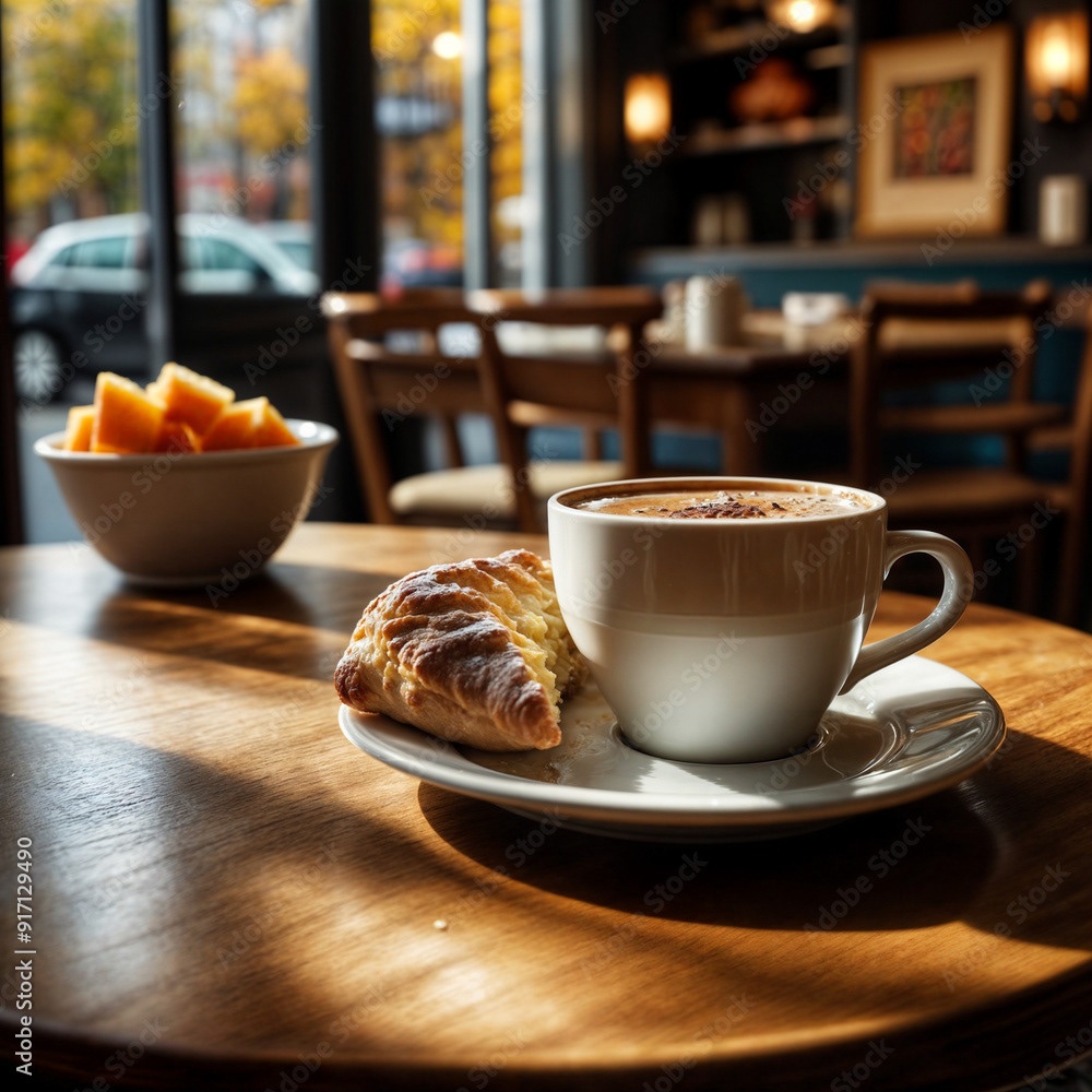 Close-up of a bistro cafe table with a cup of coffee and a pastry on a plate. The scene is bathed in inviting late afternoon sunlight, and warm autumn colors, capturing the cozy ambiance of the season.
