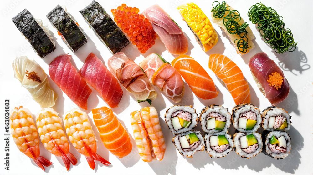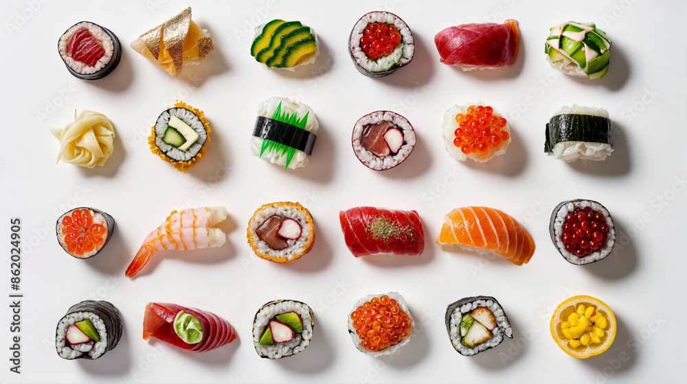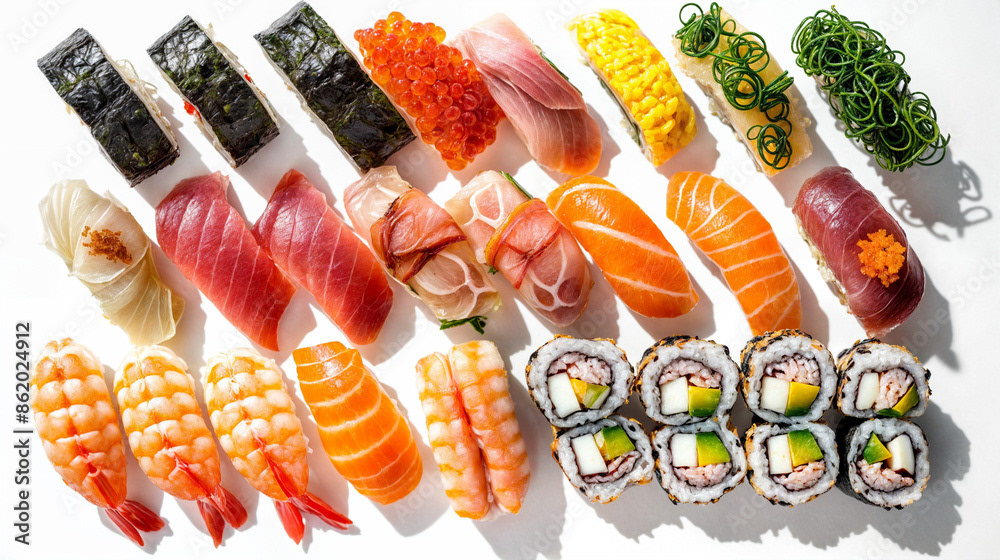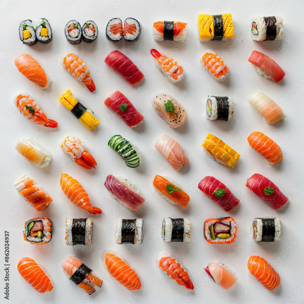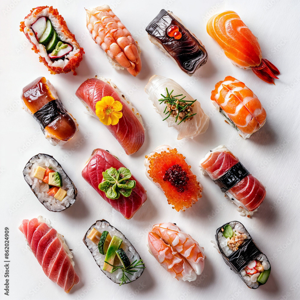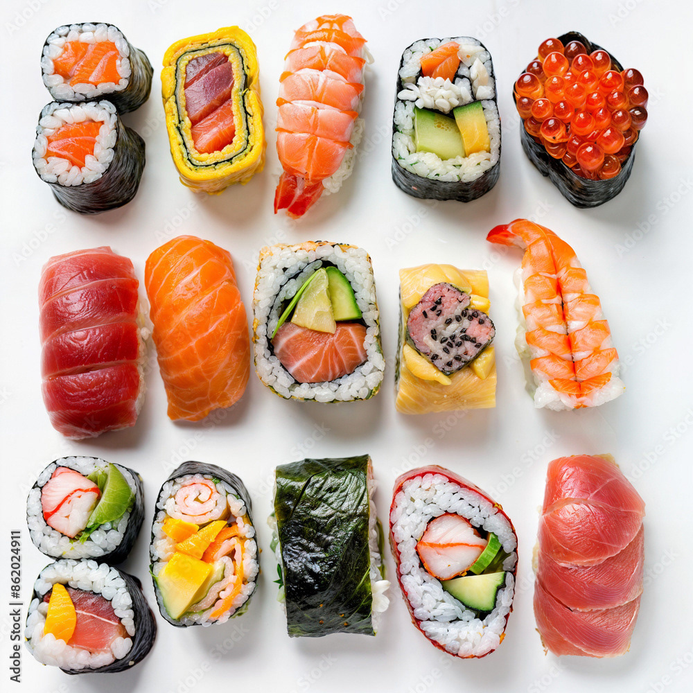 A vibrant and delicious assortment of various sushi pieces is laid on a clean white background.