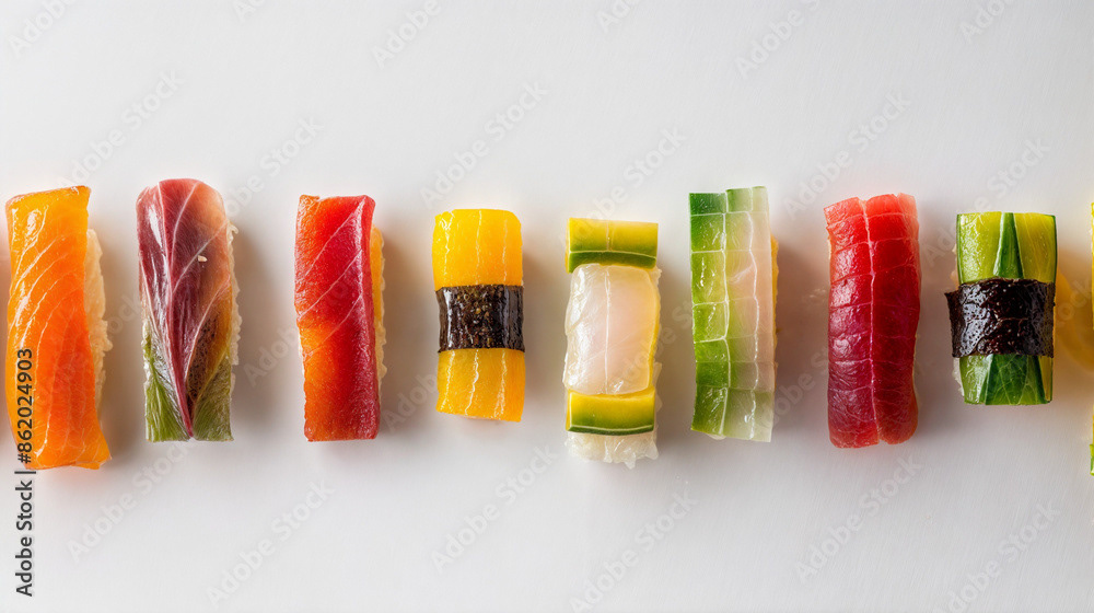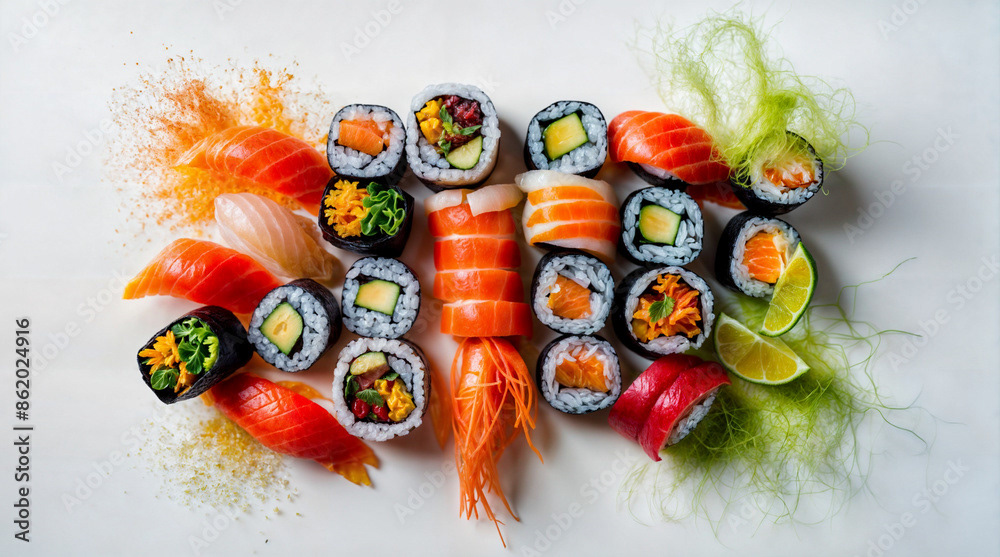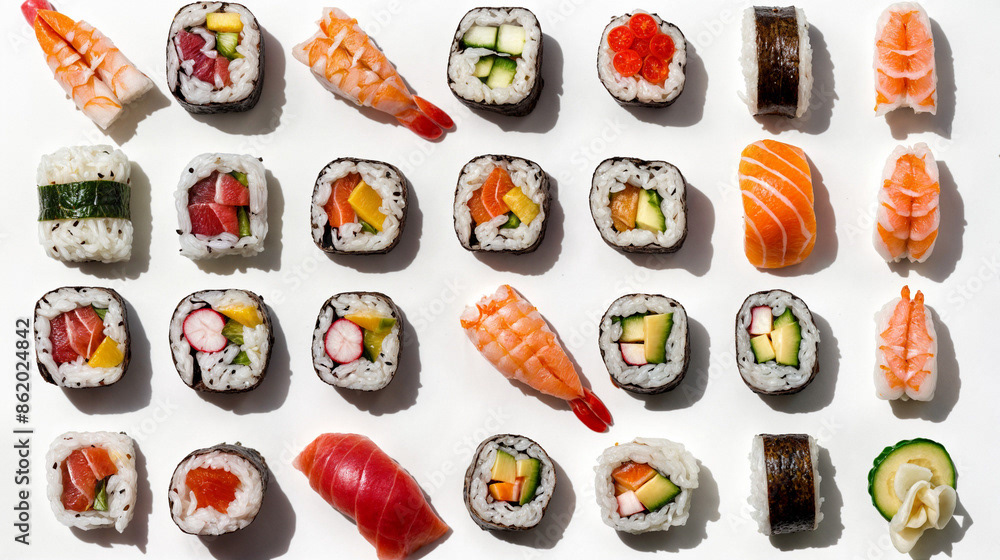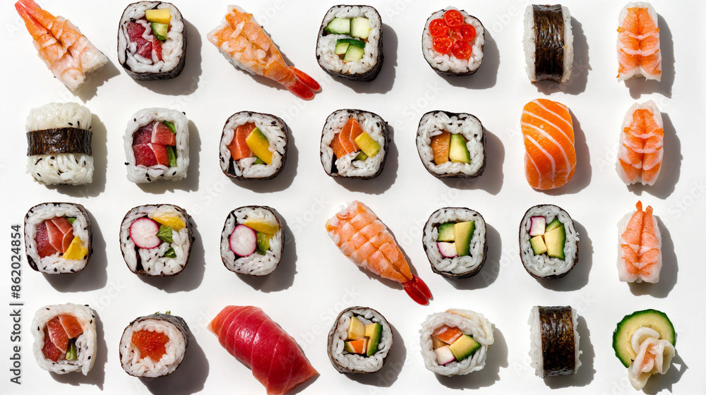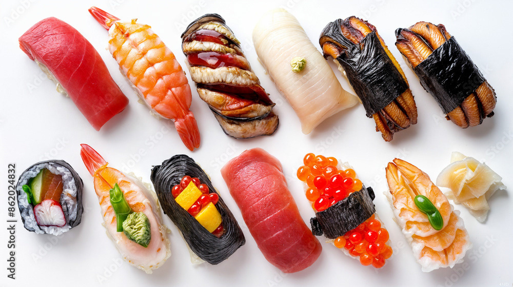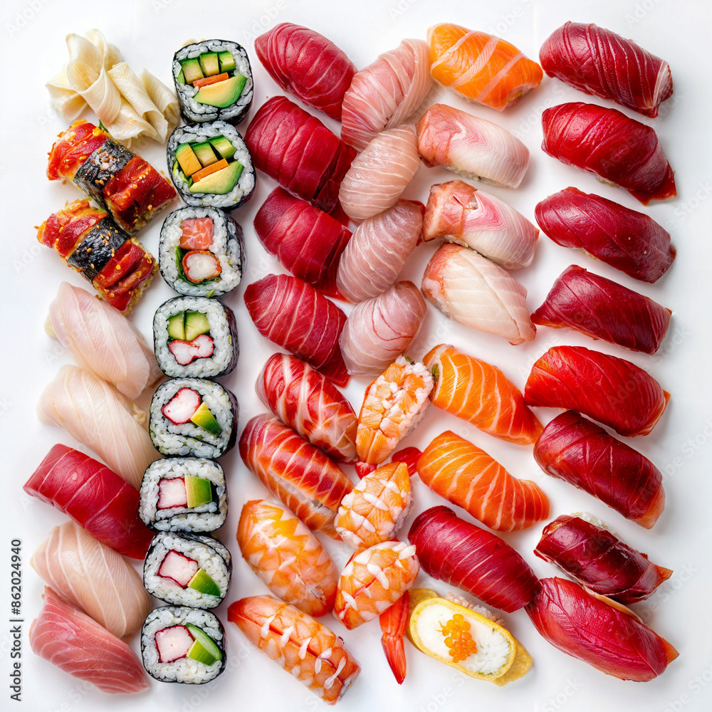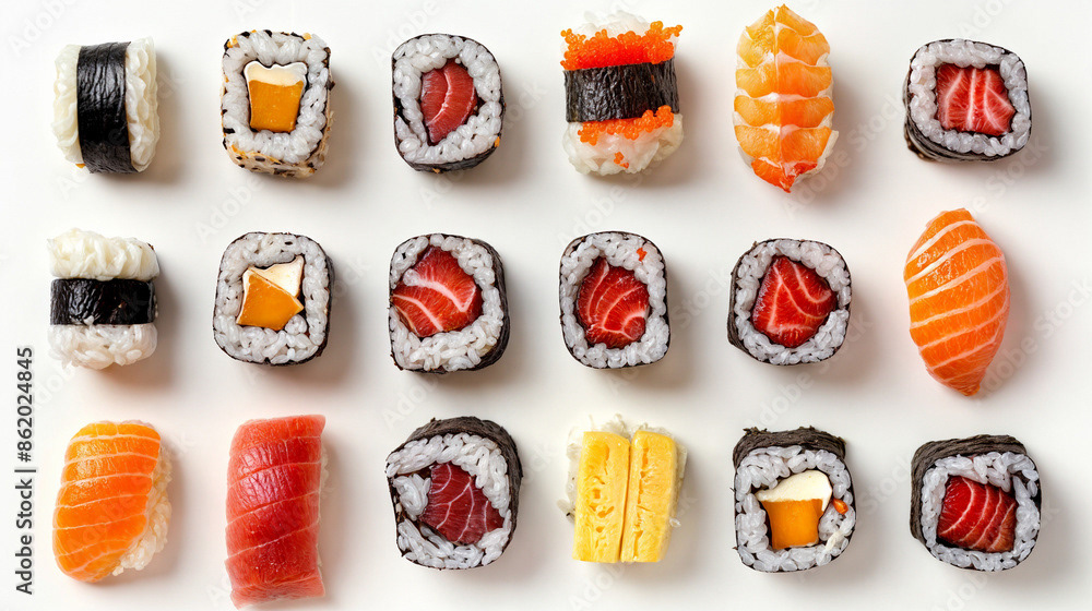 A vibrant and delicious assortment of various sushi pieces is laid on a clean white background.