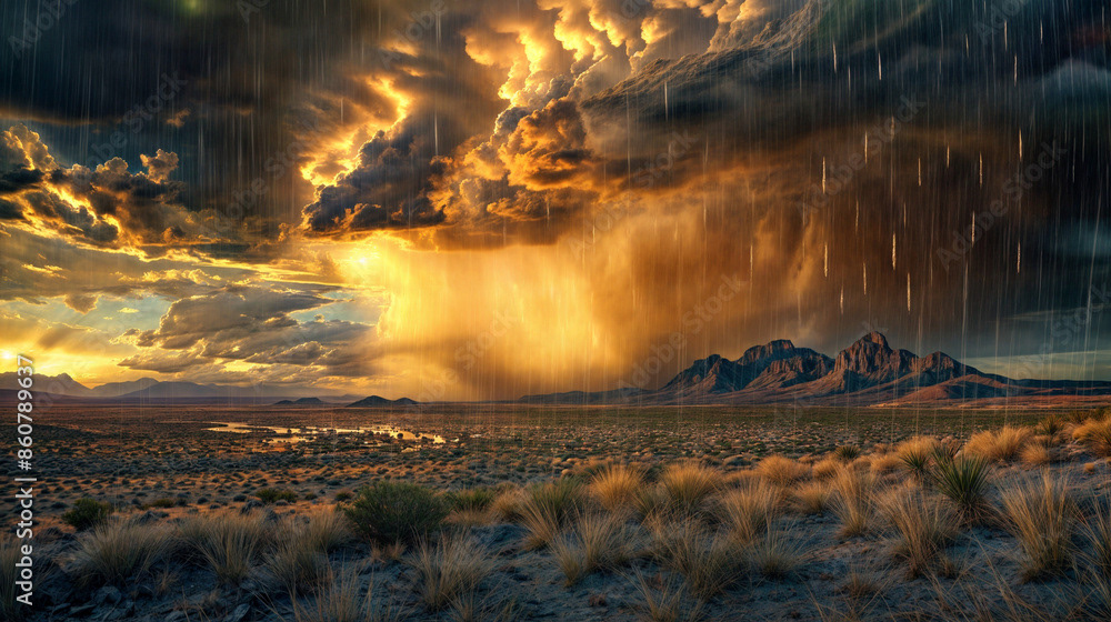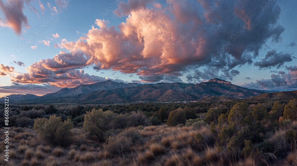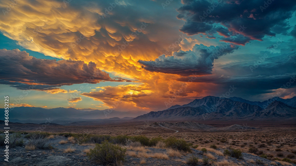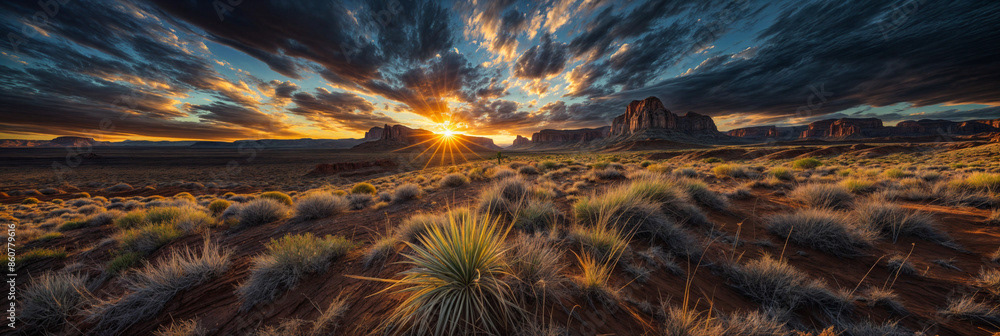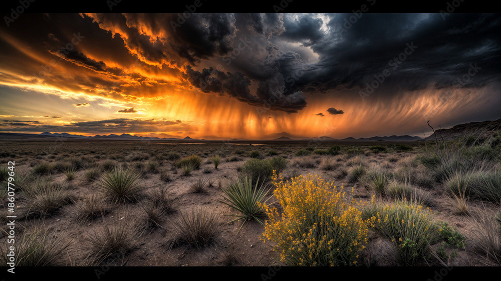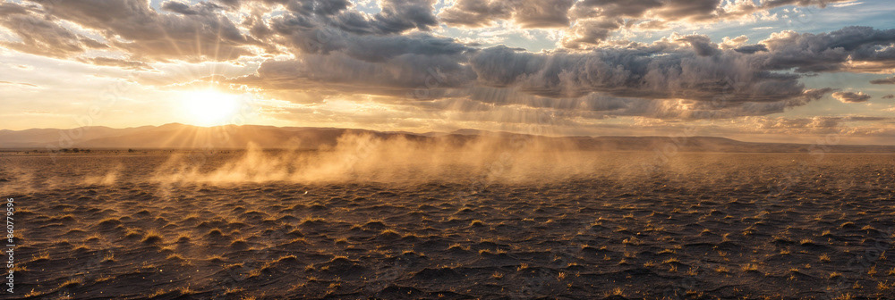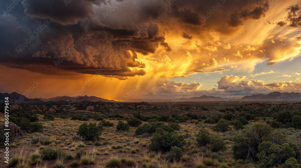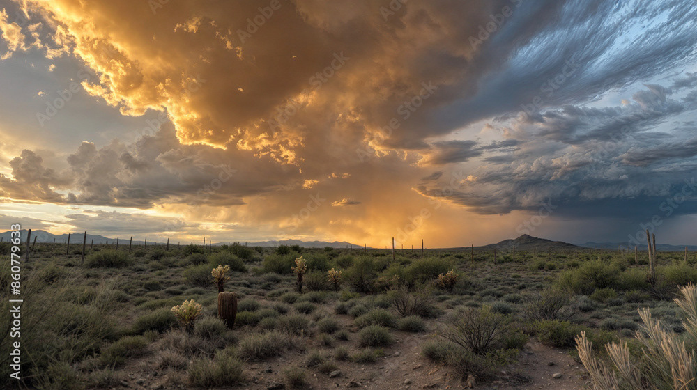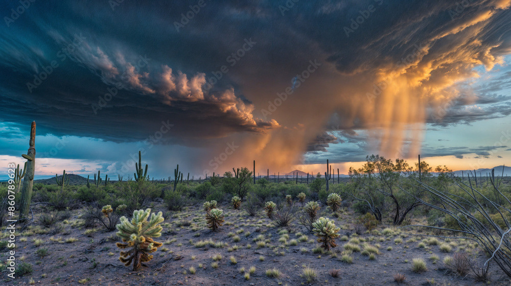 This breathtaking image captures the raw beauty of a desert landscape at sunset, as a dramatic storm rolls in.