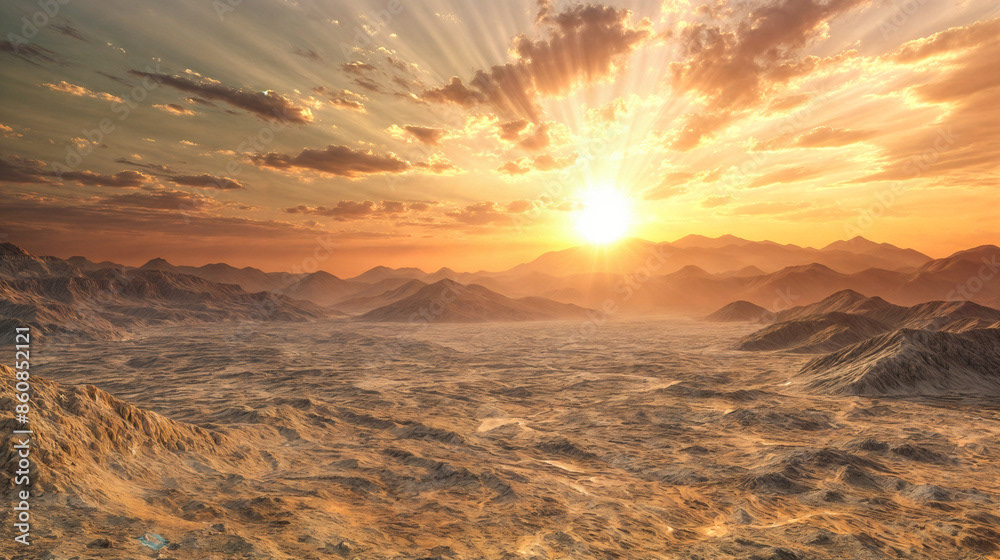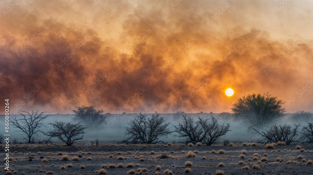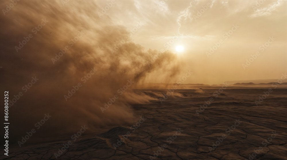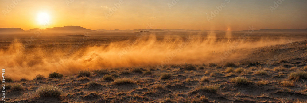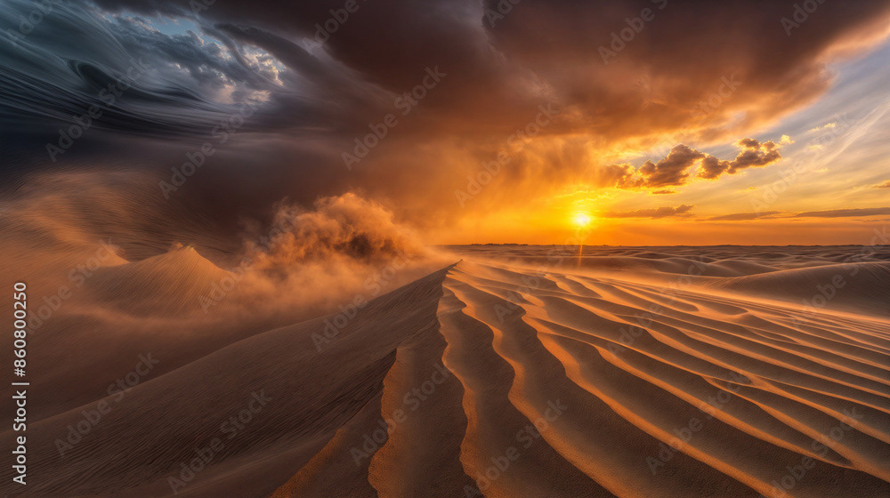 Golden Sunset Over Desert Dunes with Sandstorm