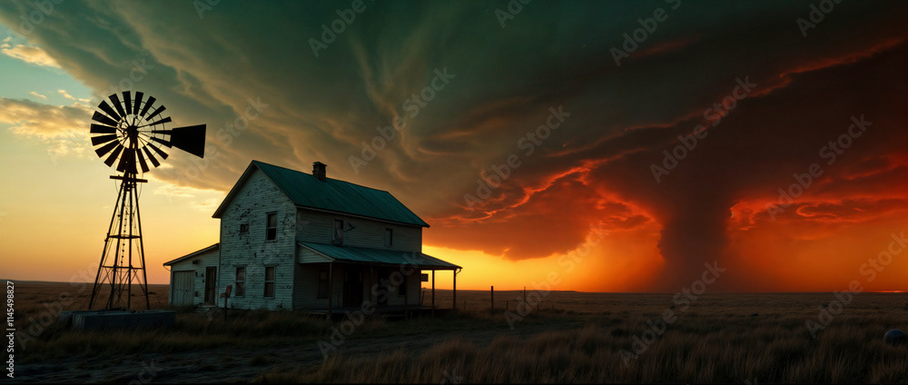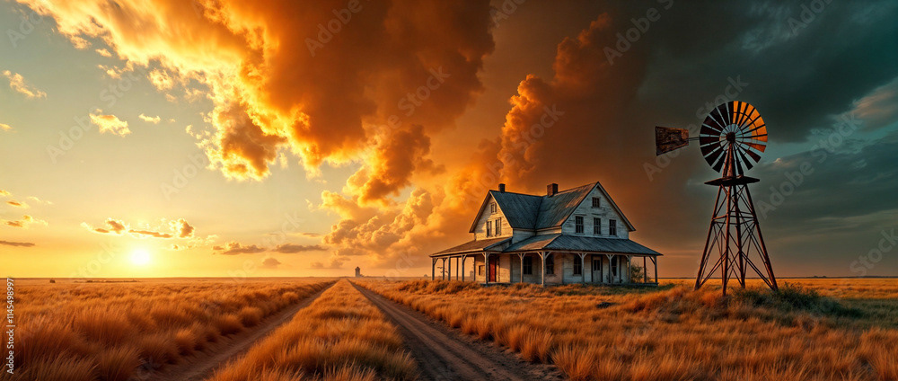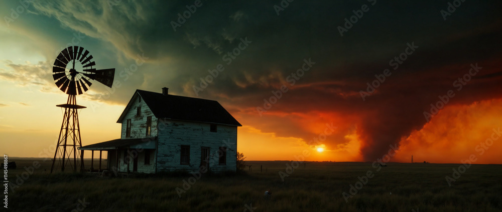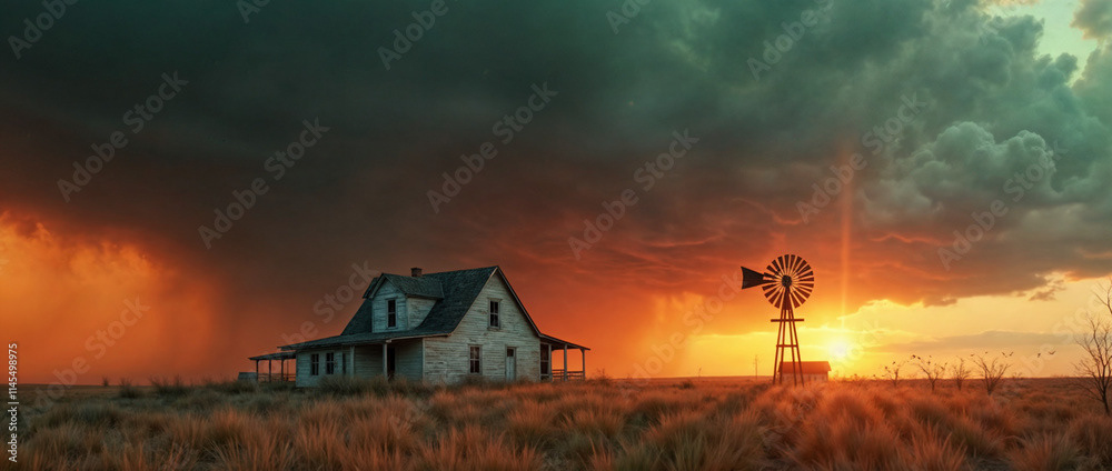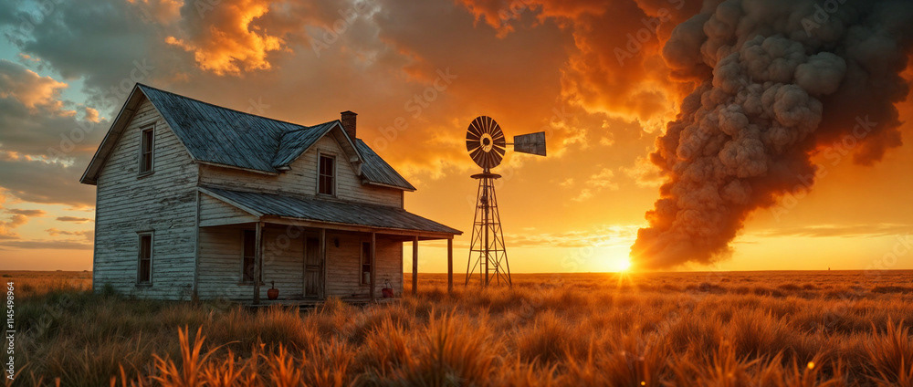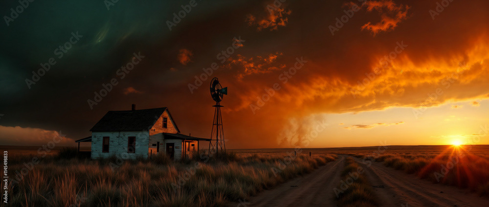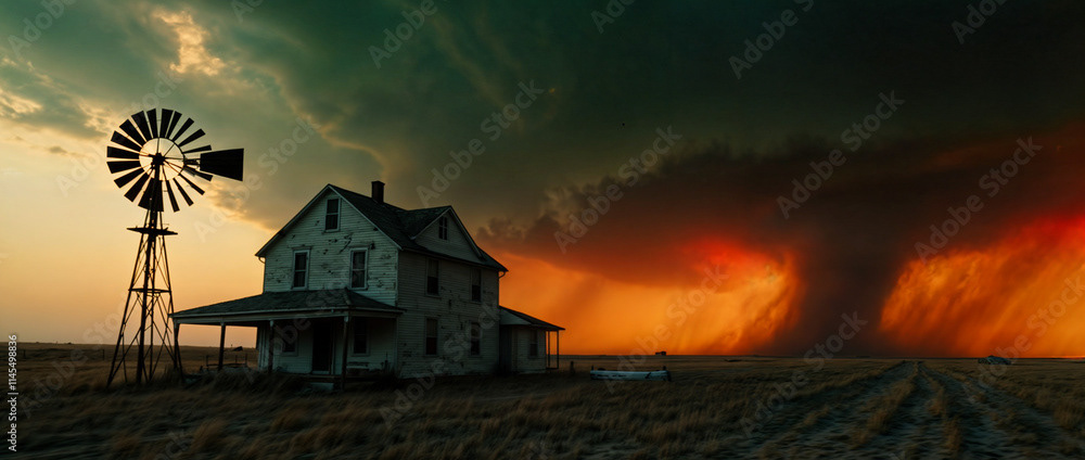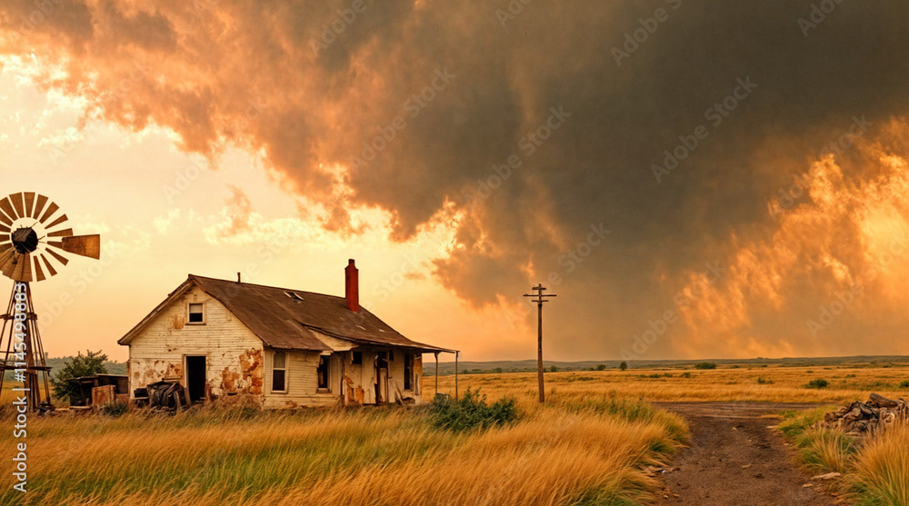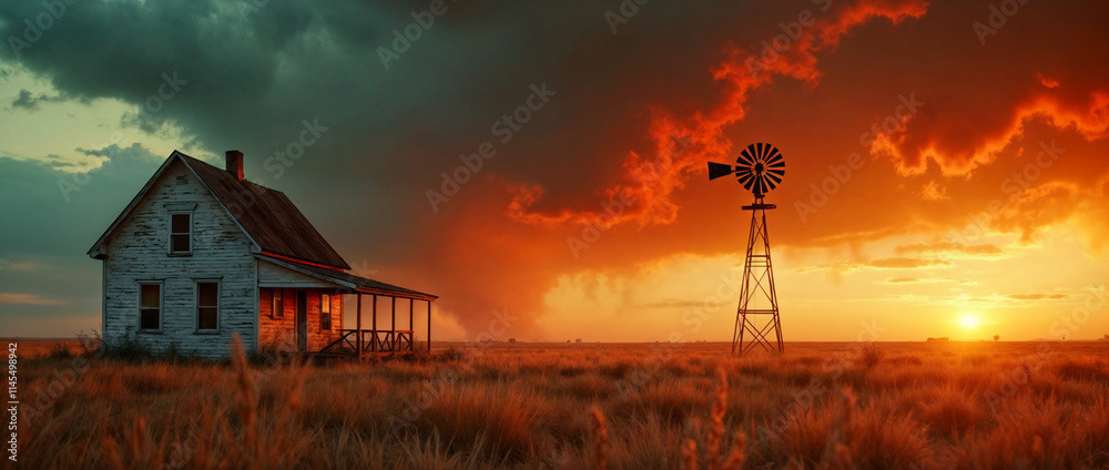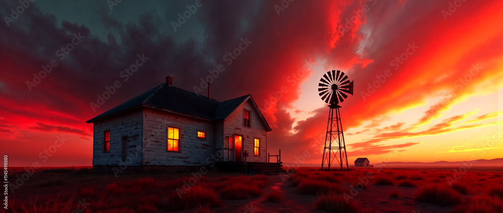 A rustic scene featuring an abandoned farmhouse and a classic windmill set against a stunning prairie sunset. The vibrant orange and red hues blend with ominous storm clouds, creating a dramatic and moody atmosphere that evokes both serenity and mystery.