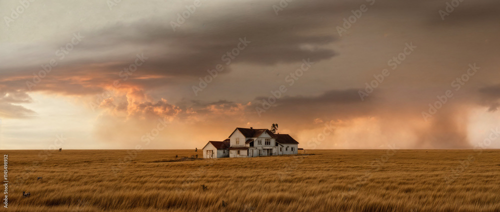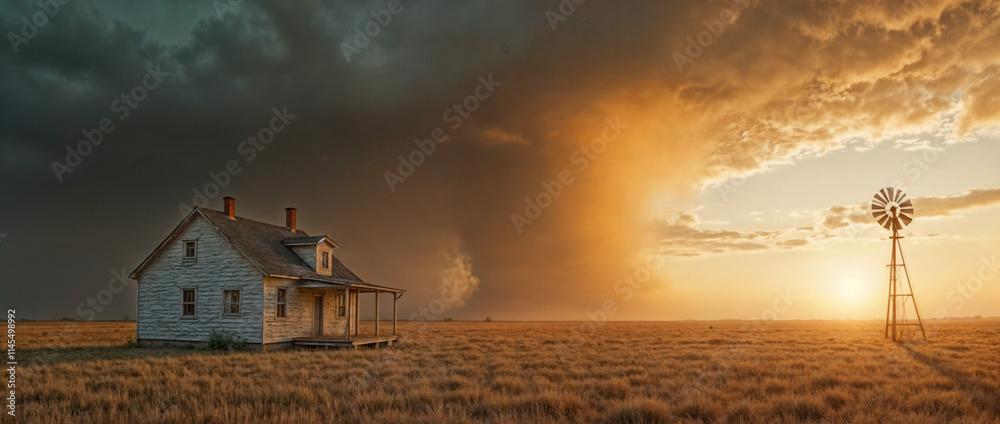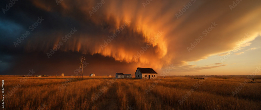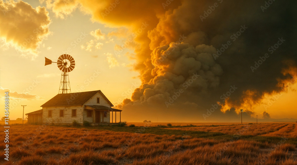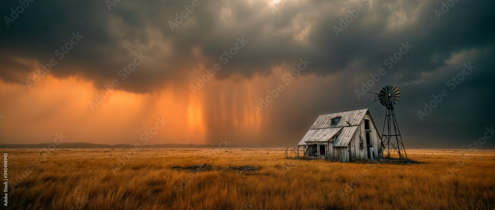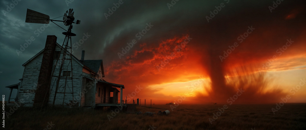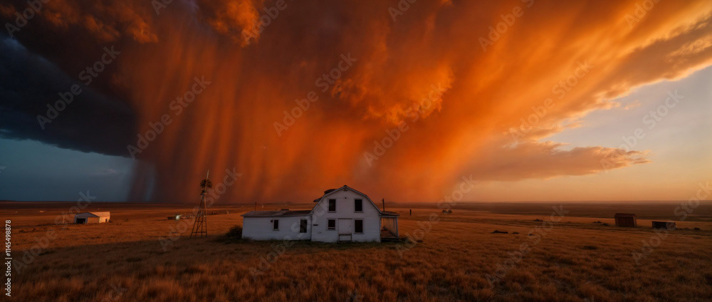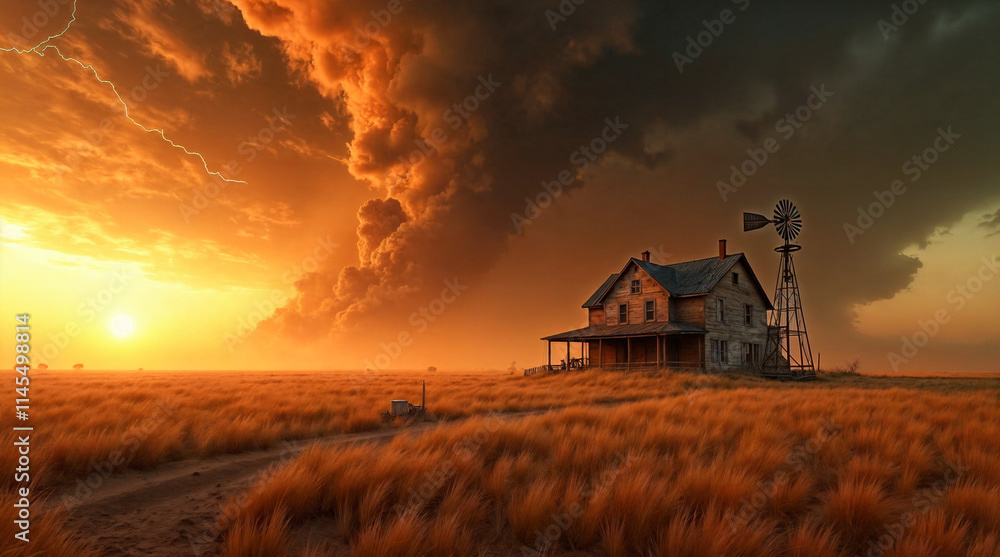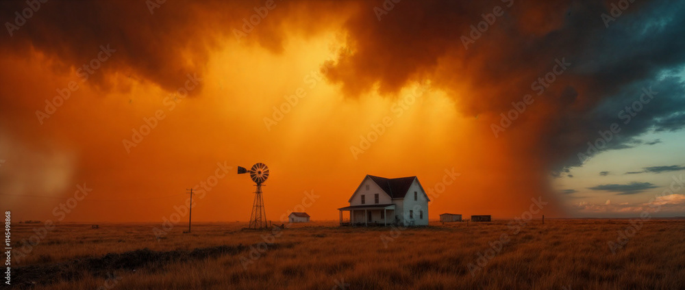 A rustic scene featuring an abandoned farmhouse and a classic windmill set against a stunning prairie sunset. The vibrant orange and red hues blend with ominous storm clouds, creating a dramatic and moody atmosphere that evokes both serenity and mystery.