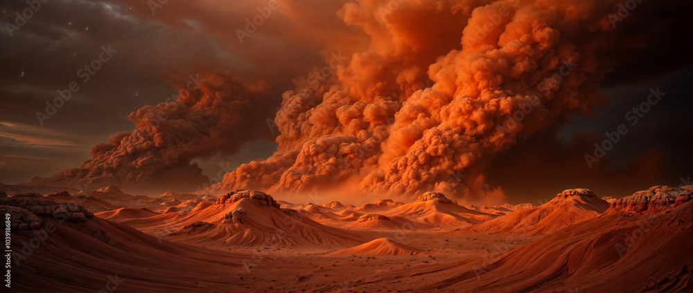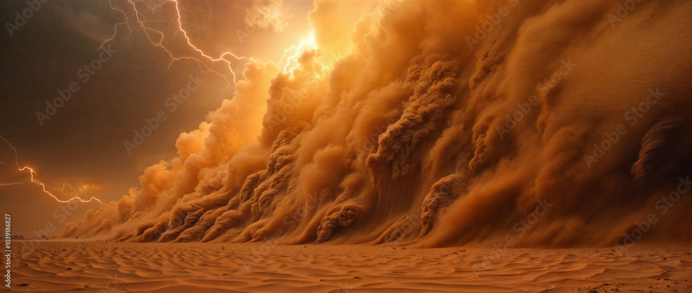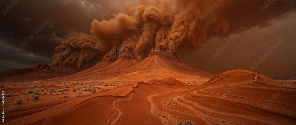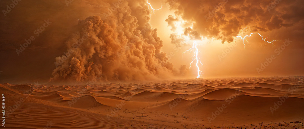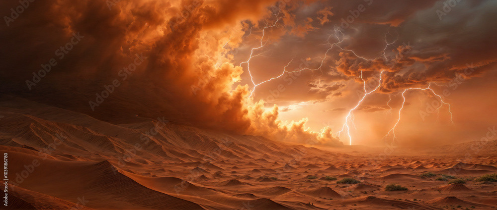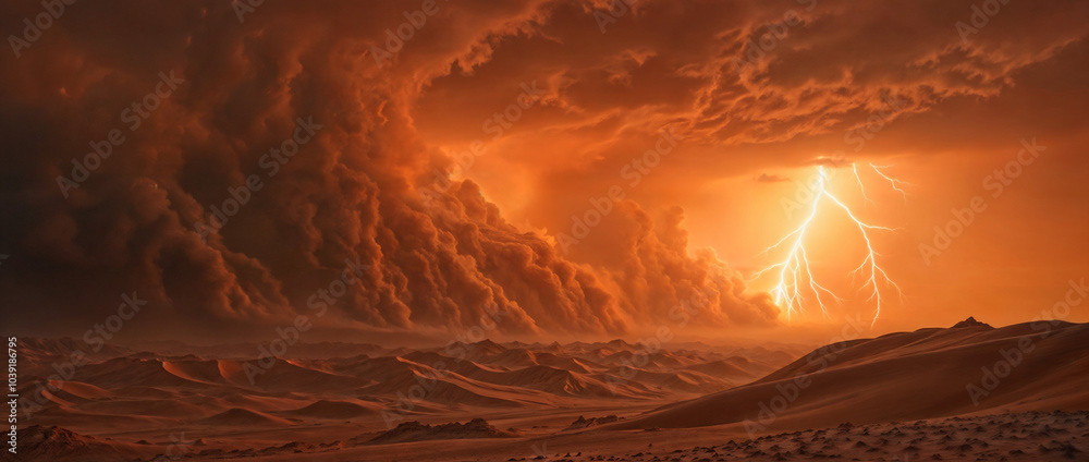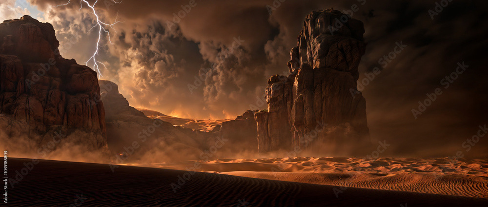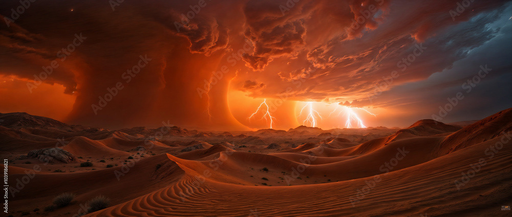 Epic Desert Thunderstorm Illuminating Monumental Sandstone Buttes. A dramatic scene unfolds in a vast desert landscape as lightning illuminates towering sandstone buttes under dark, stormy skies. The red dunes and rock formations are bathed in the eerie glow of a desert storm at dusk, with thick clouds rolling in.