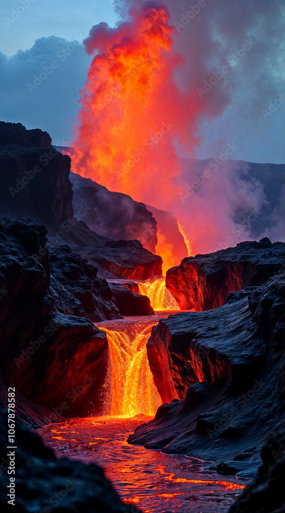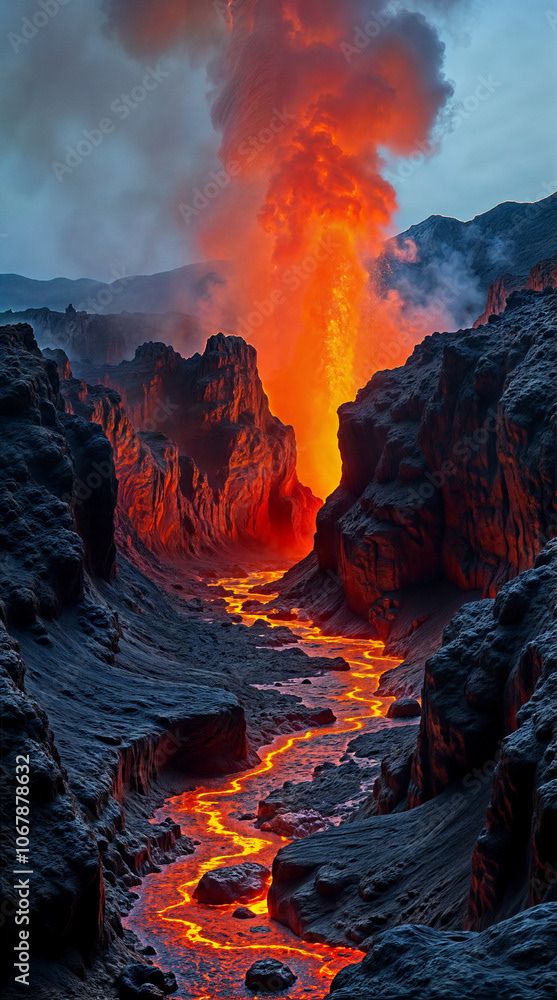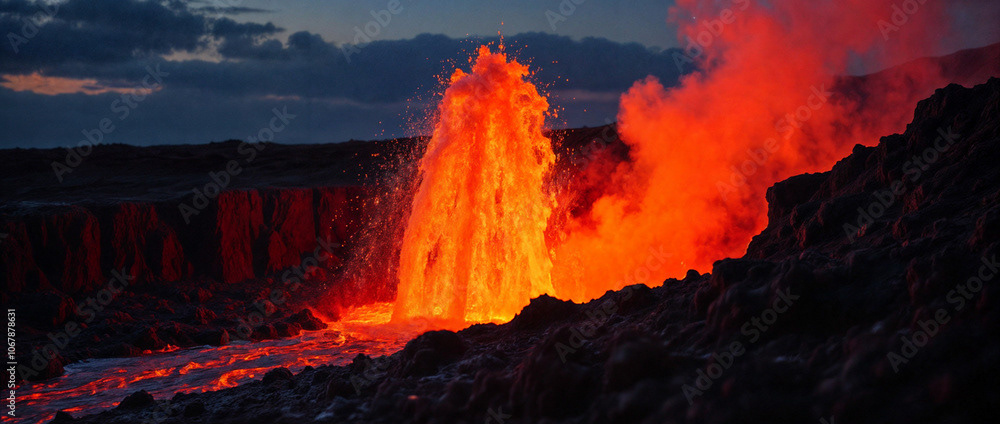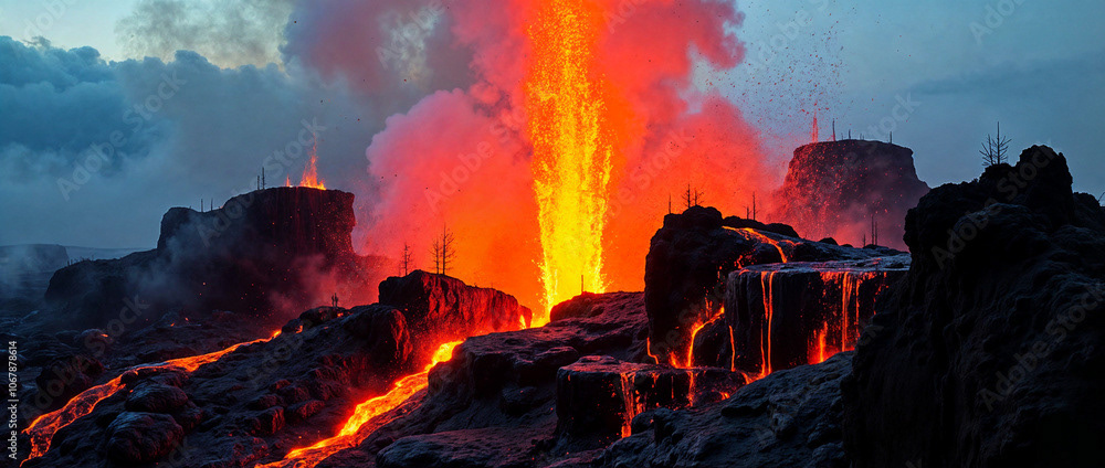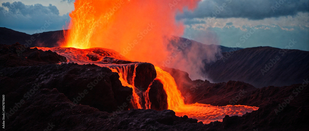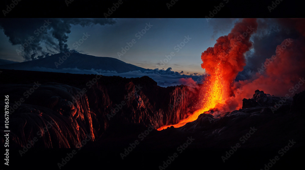 a powerful volcanic eruption against a dramatic landscape, with vivid lava spouting high into the air and casting a fiery glow on the surrounding dark, rocky terrain. The central plume of lava erupts intensely, spilling molten lava down through winding channels, illuminating the area in intense red and orange hues.