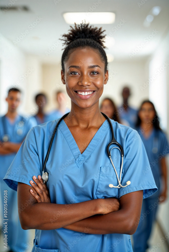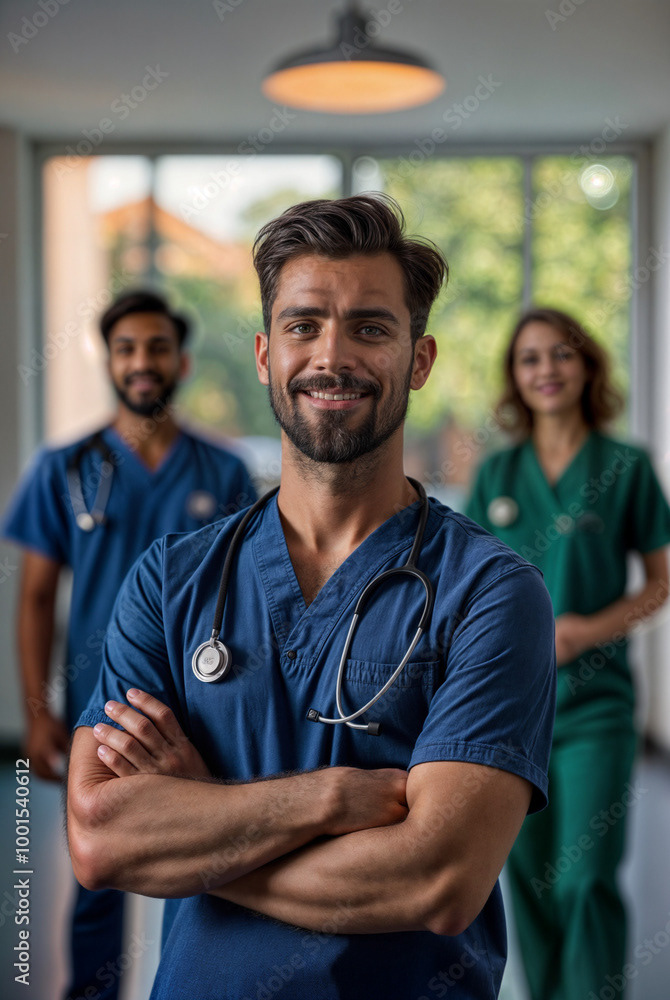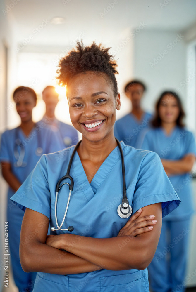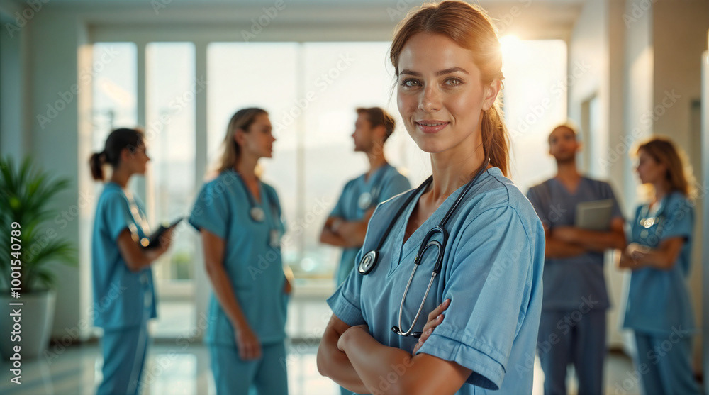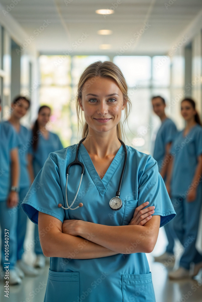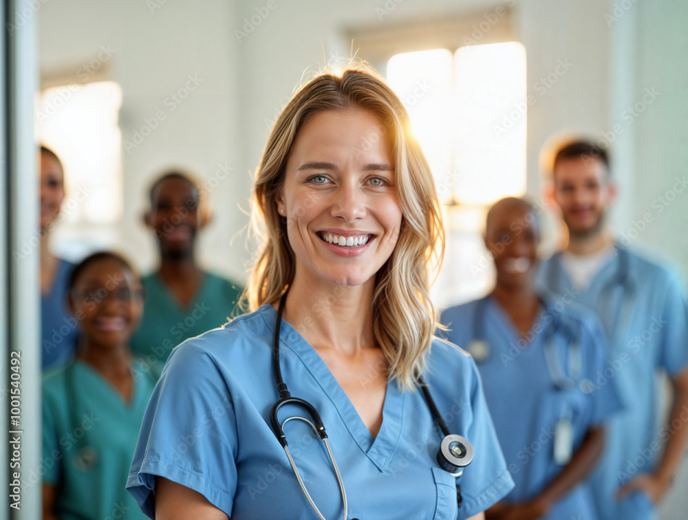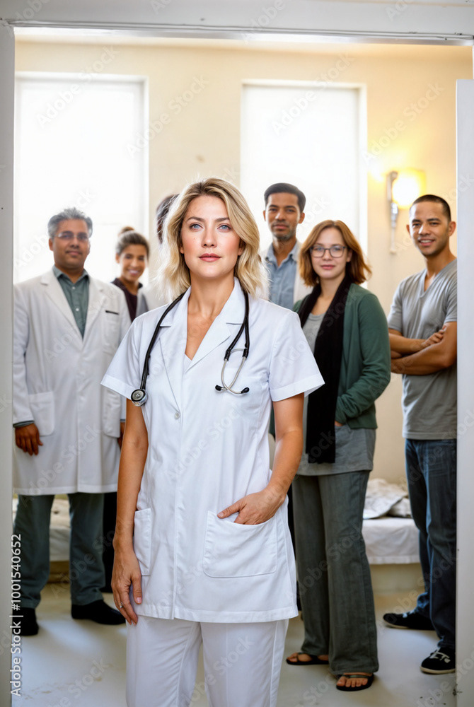 A confident female doctor in a white coat stands at the forefront of a diverse healthcare team, showcasing unity, professionalism, and dedication to patient care.