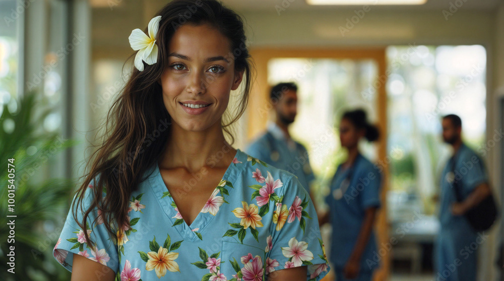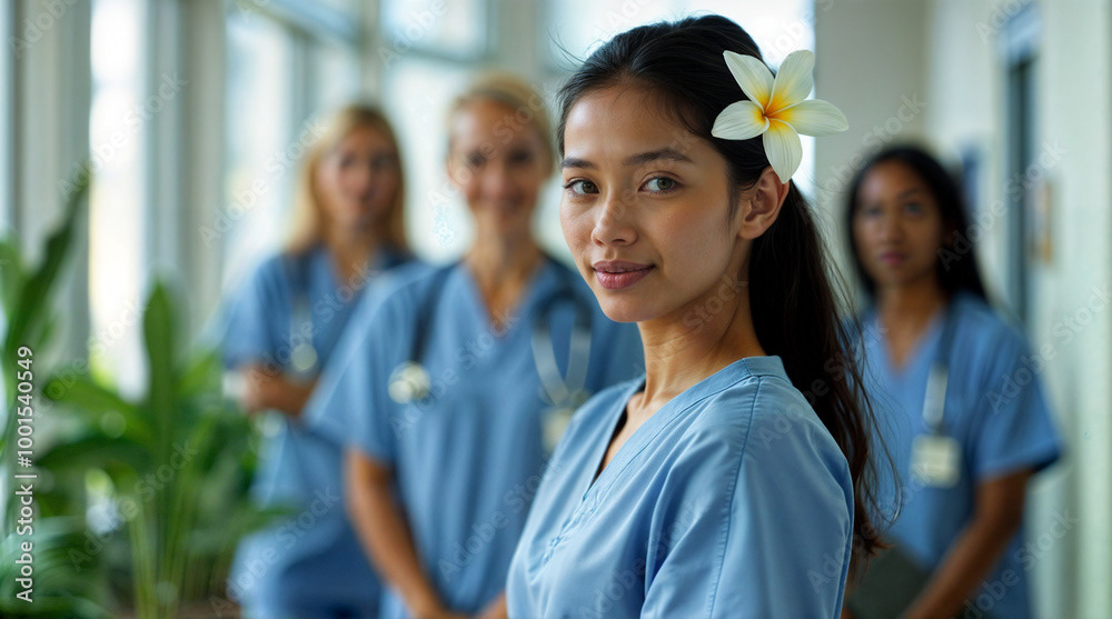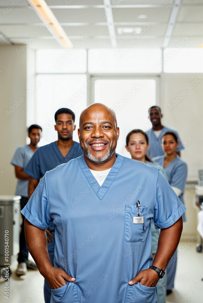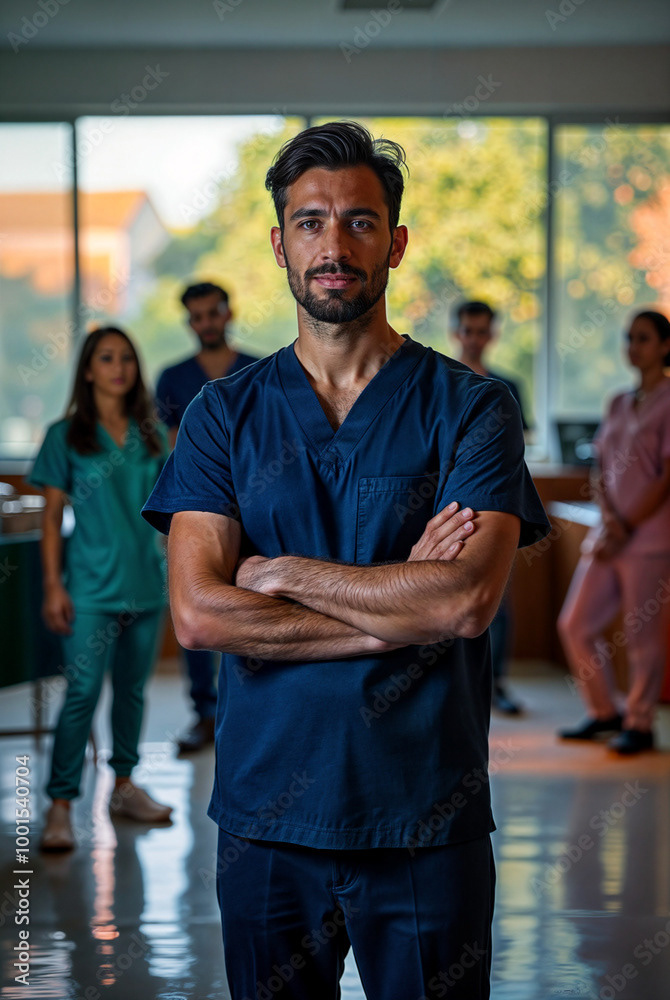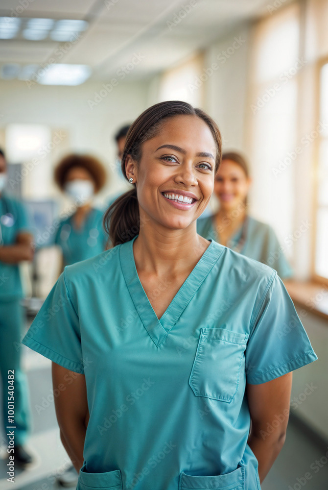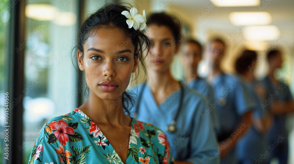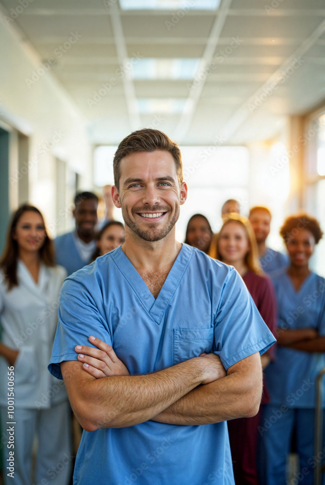 A confident female doctor in a white coat stands at the forefront of a diverse healthcare team, showcasing unity, professionalism, and dedication to patient care.