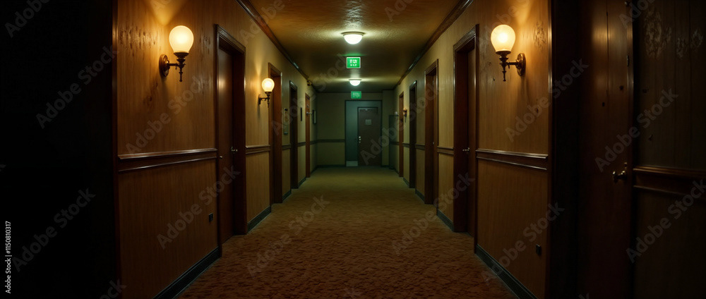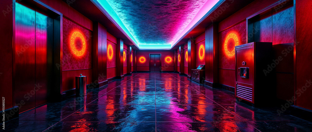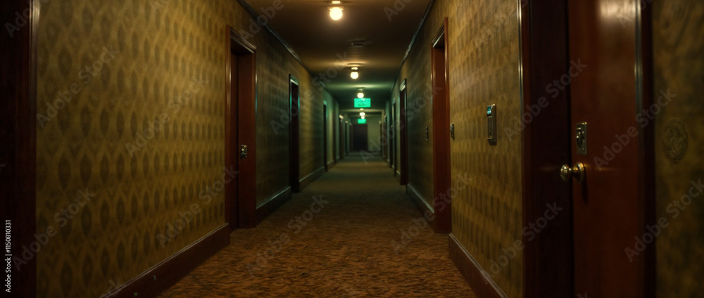 classic hotel interior, retro hotel design, opulent decor, resort architecture, vibrant colors, elegant lighting, interior design, carpeted corridor, vintage hotel vibe, architectural photography, and hospitality interiors.