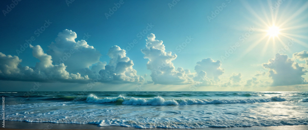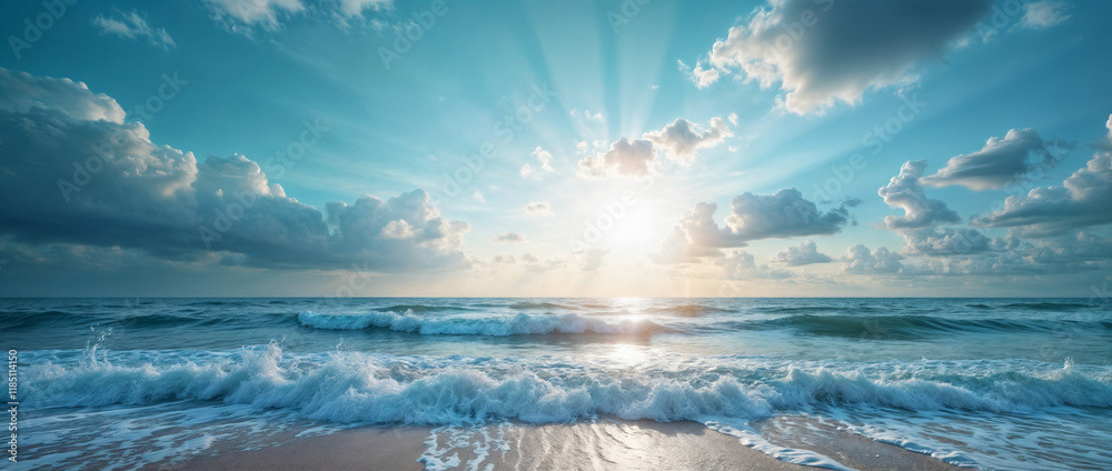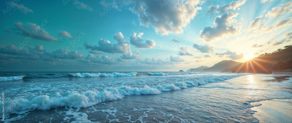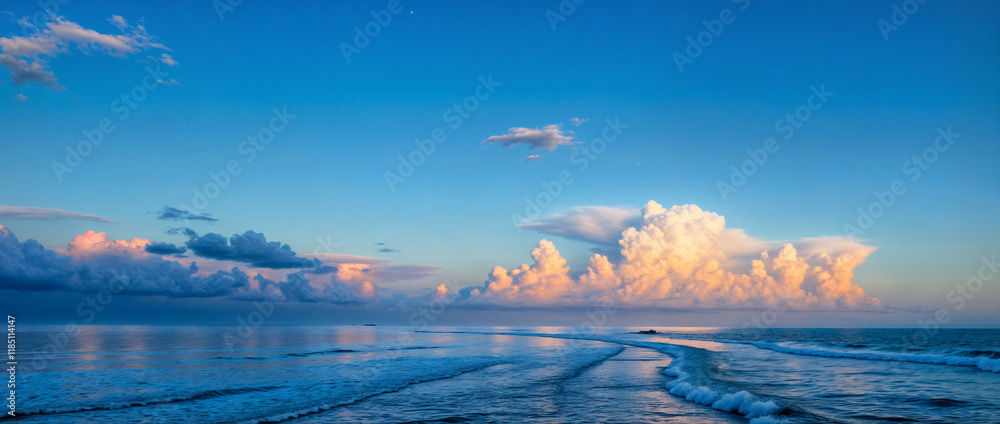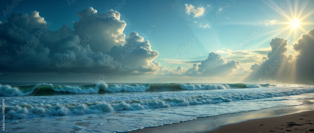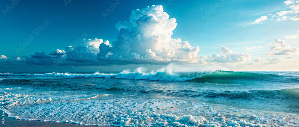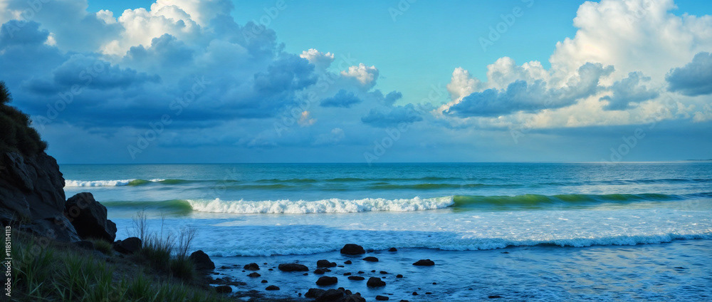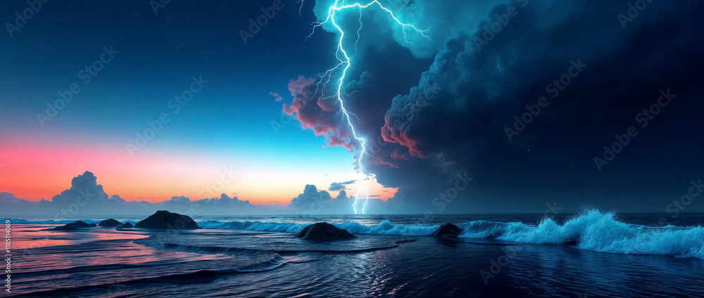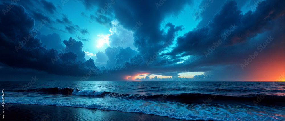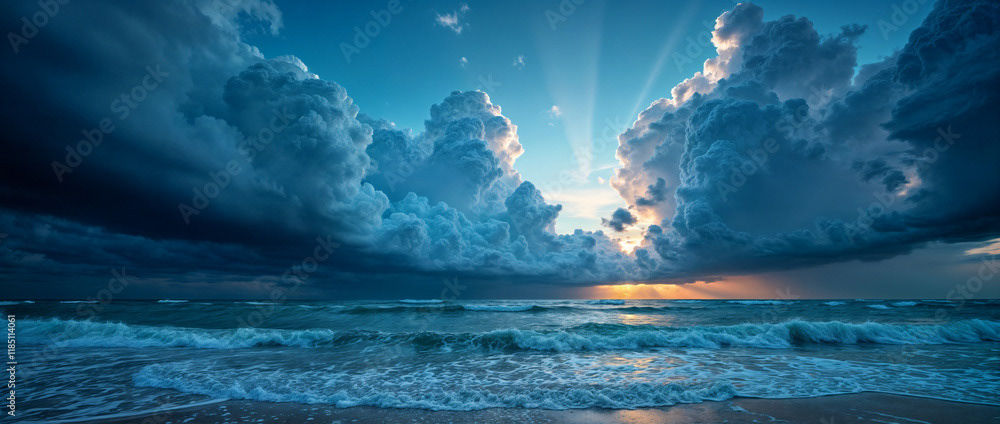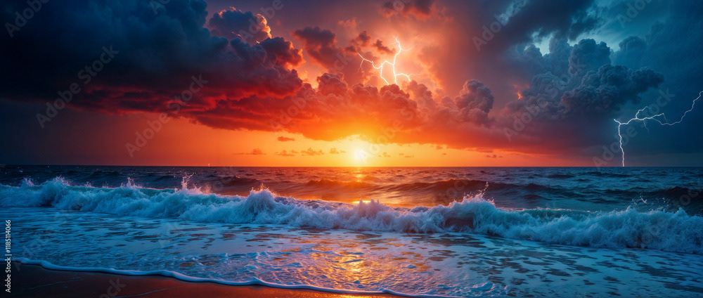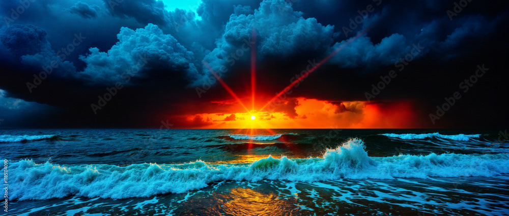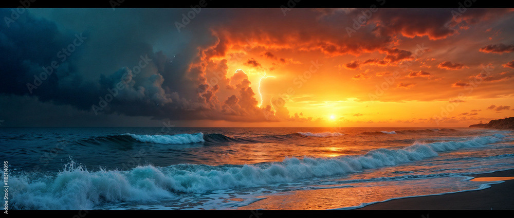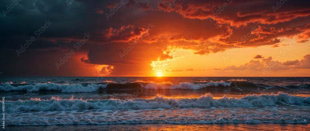 A stunning panoramic ocean view captured under a vibrant sunset, with dramatic storm clouds dominating the horizon and waves crashing against the shore.