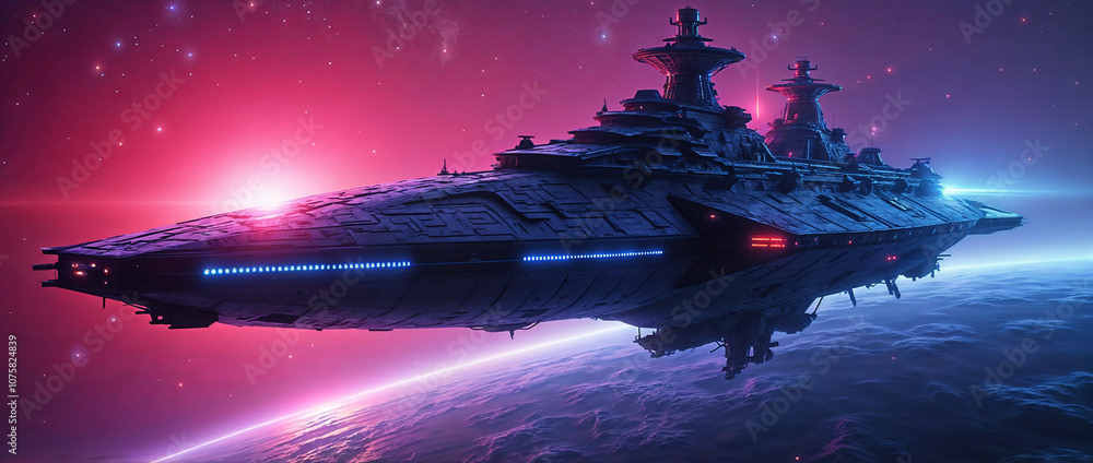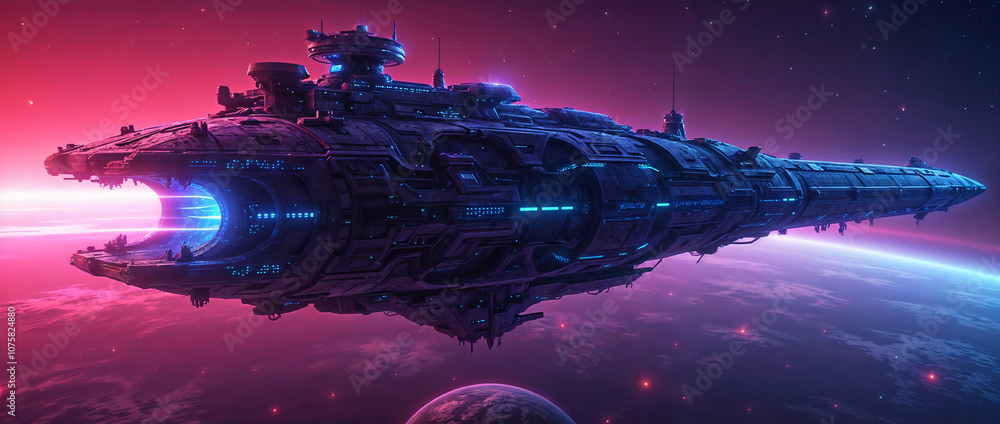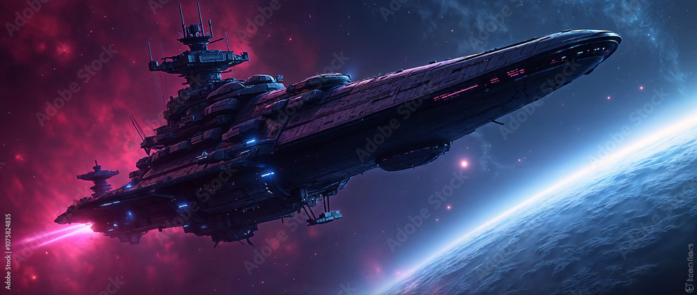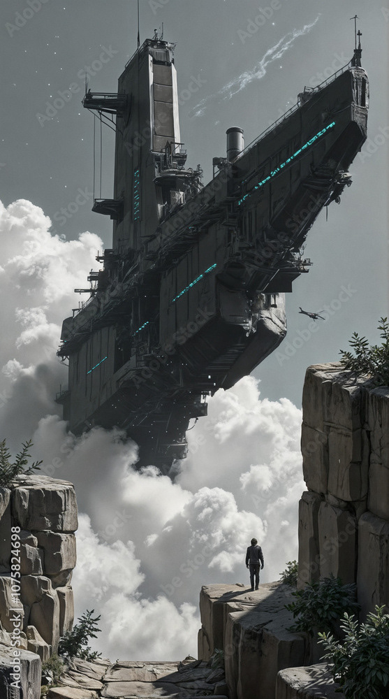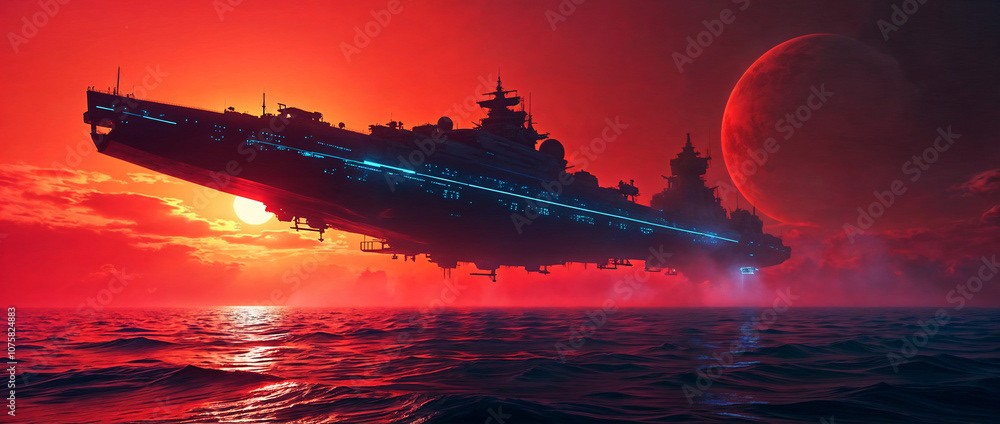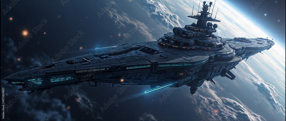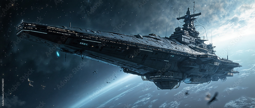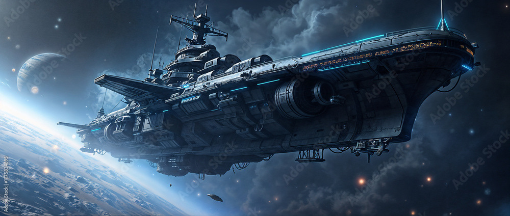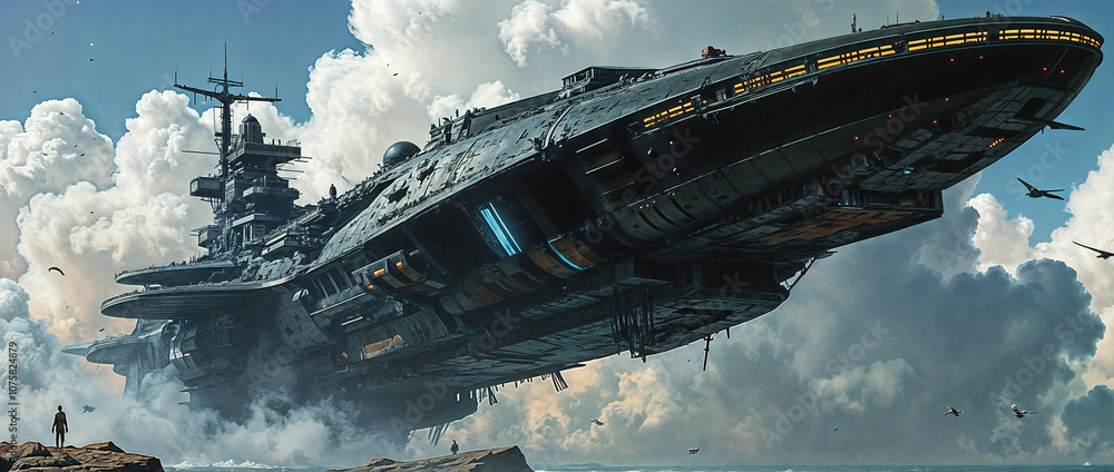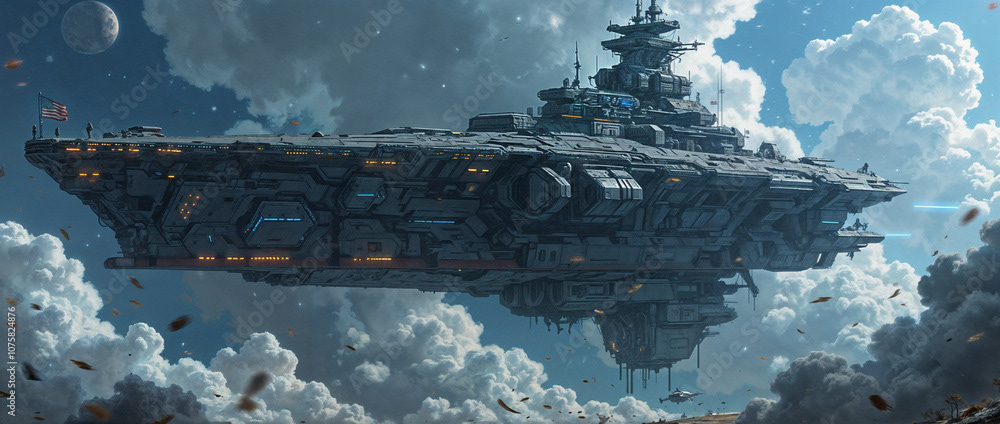 An awe-inspiring image of a colossal, futuristic battle cruiser floating through the sky, surrounded by clouds. The vessel's intricate design and heavy armor are highlighted by glowing lights, while small figures and an American flag provide scale and grandeur. A distant moon adds a touch of the cosmic, emphasizing the ship's otherworldly technology and mission. Ideal for concepts of sci-fi, space exploration, and military prowess in a futuristic world.