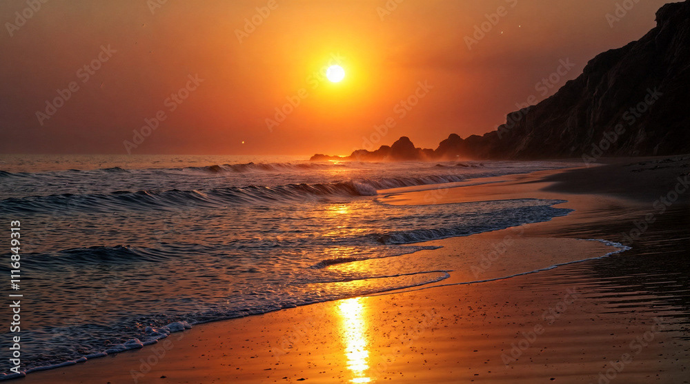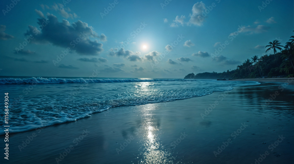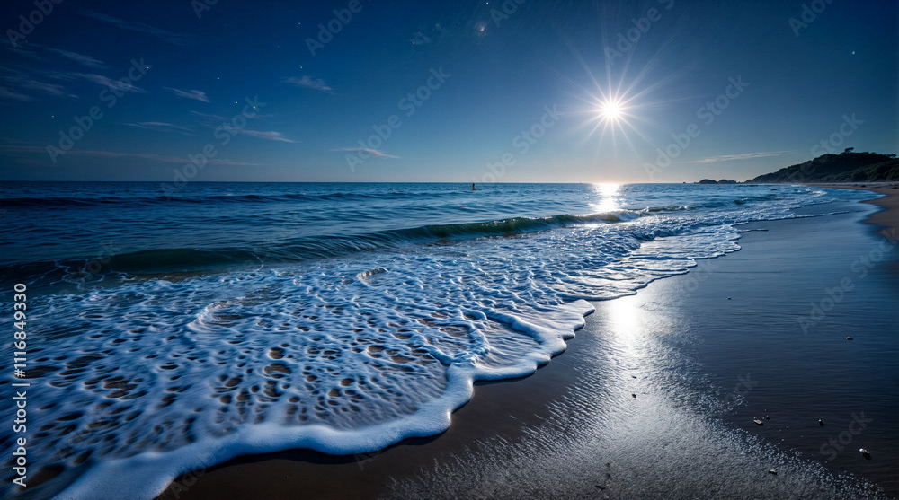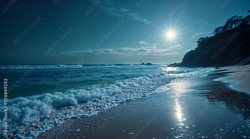 A serene moonlit beach scene with gentle waves lapping at the shore under a clear, starry night sky. The moonlight reflects on the calm ocean waters, creating a tranquil and picturesque view.