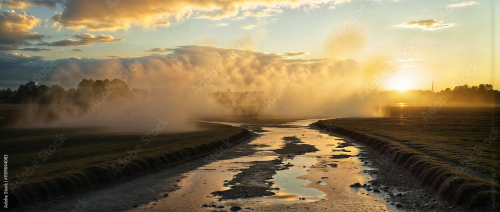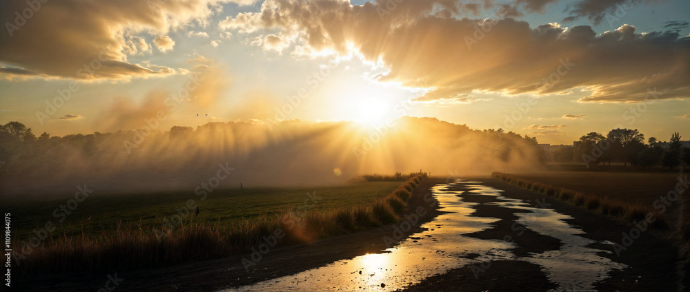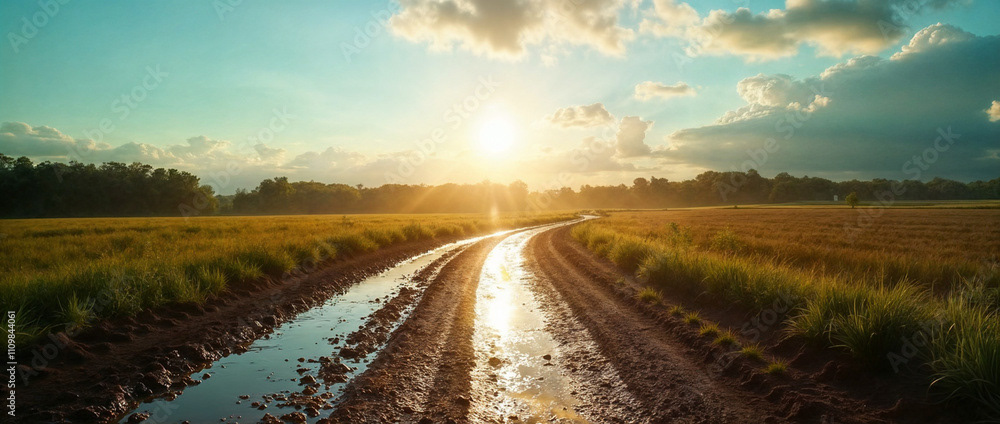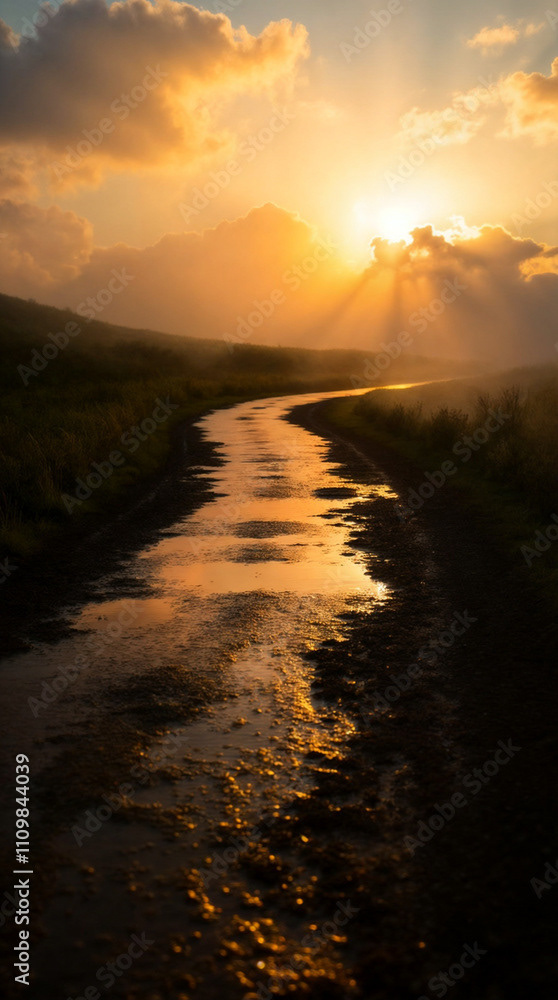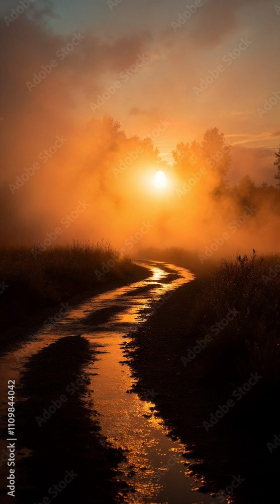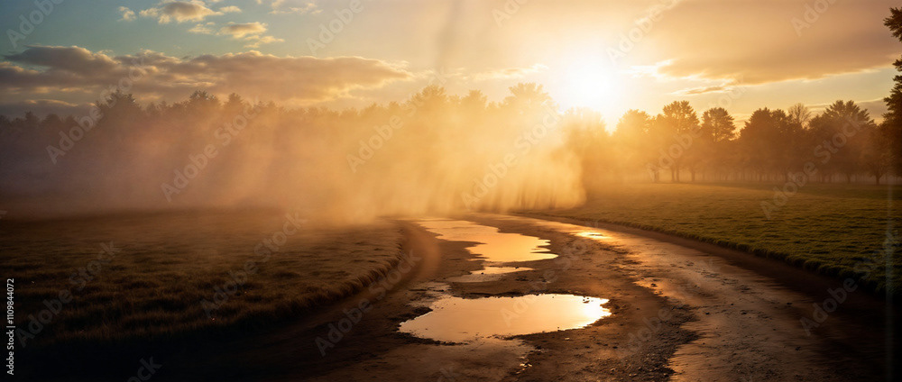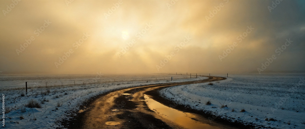 A serene rural scene showcasing a winding country road cutting through a snow-covered field under the soft, golden hues of sunrise. The sunlight pierces through the morning fog, casting a warm glow on the icy puddles along the path, creating a tranquil and reflective atmosphere. Perfect for themes of nature, solitude, and peaceful countryside living.