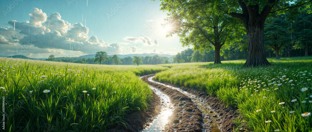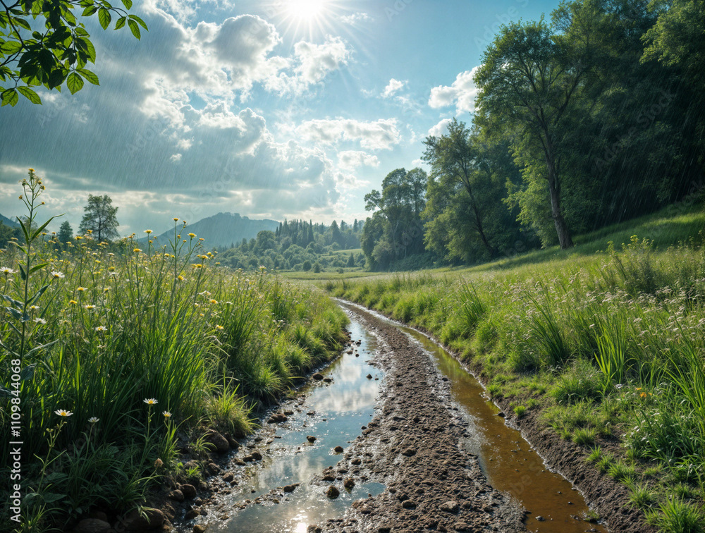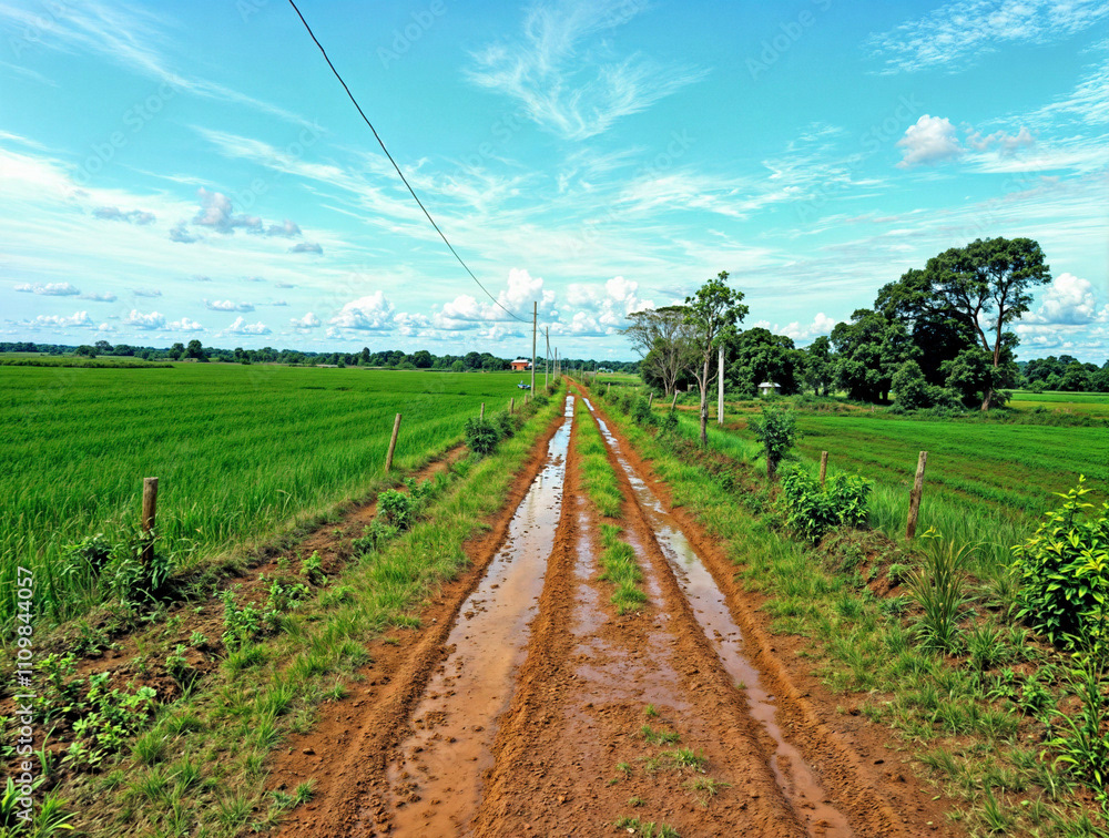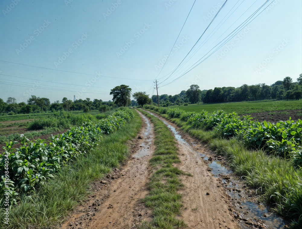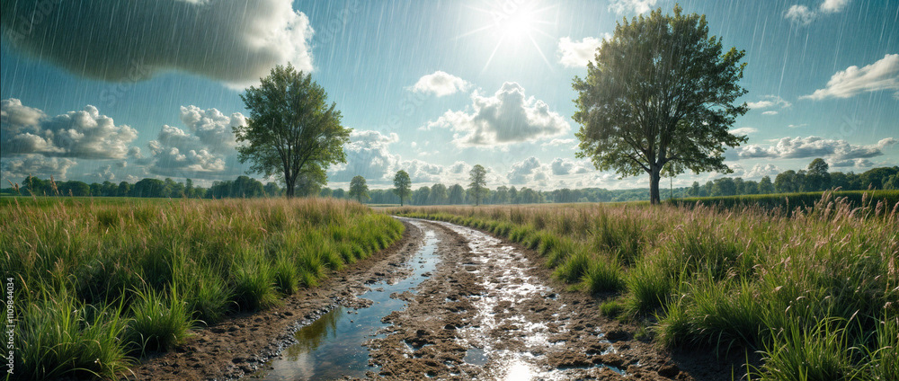 A serene rural scene showcasing a winding country road cutting through a snow-covered field under the soft, golden hues of sunrise. The sunlight pierces through the morning fog, casting a warm glow on the icy puddles along the path, creating a tranquil and reflective atmosphere. Perfect for themes of nature, solitude, and peaceful countryside living.