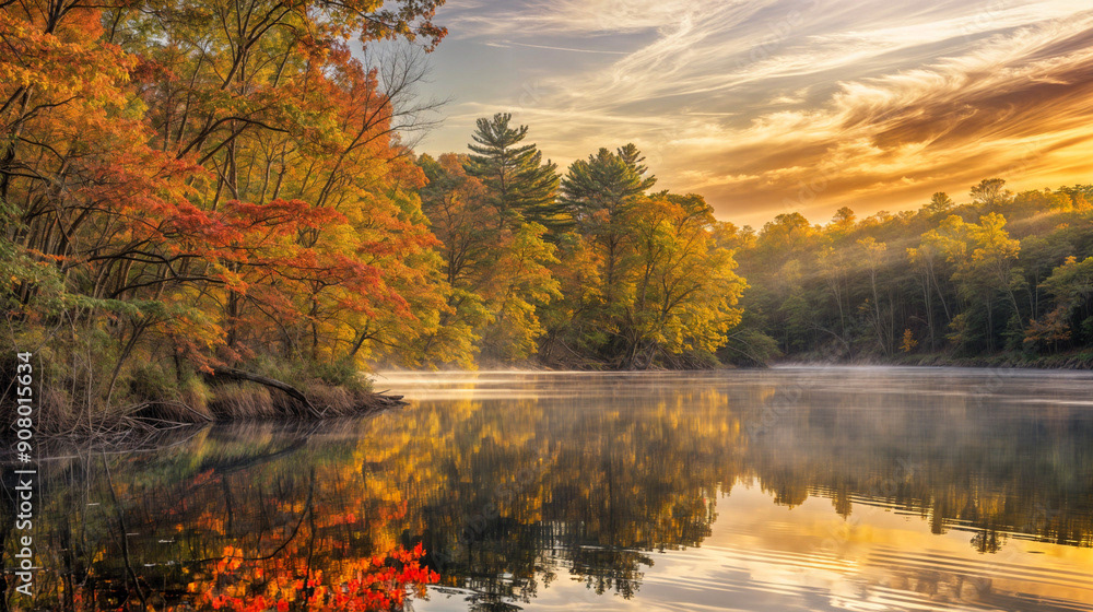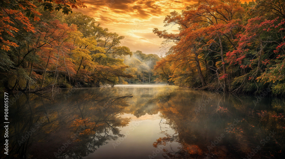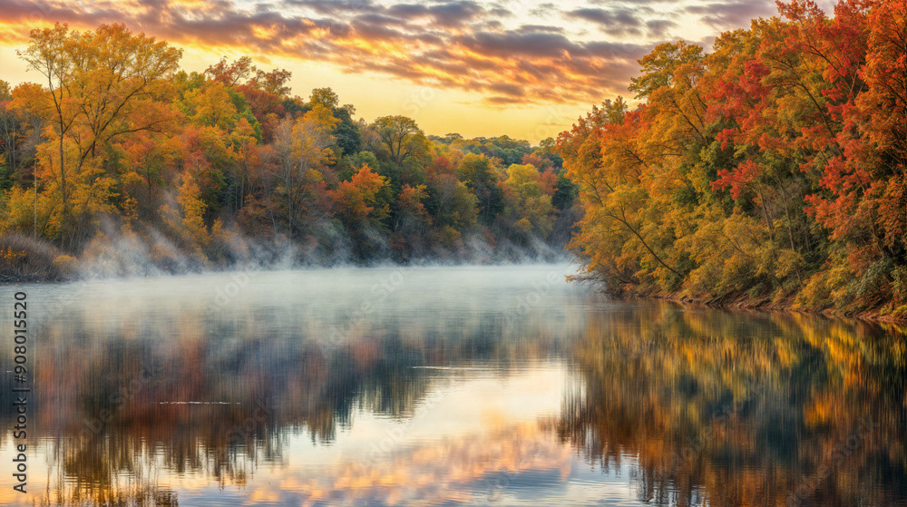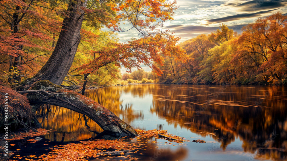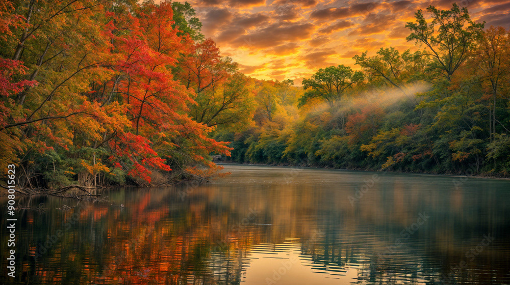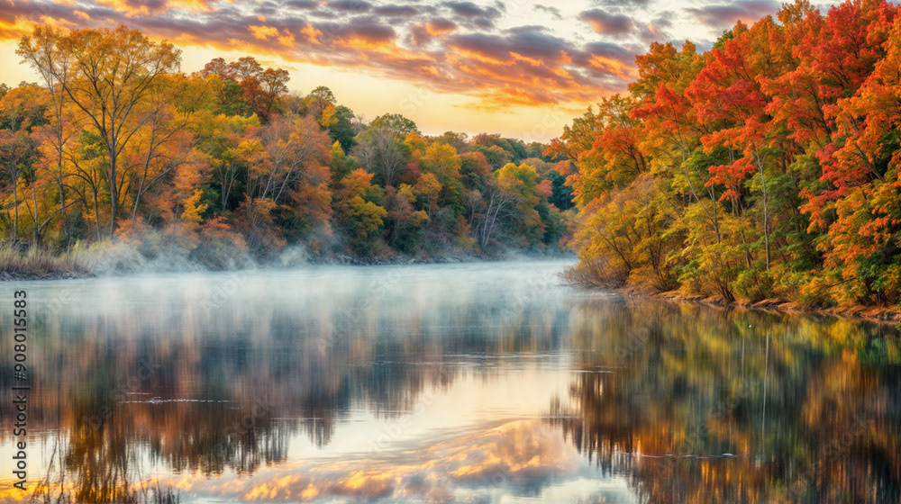 This image showcases a stunning autumn landscape, where vibrant fall foliage in shades of red, orange, yellow, and green reflects beautifully on the calm surface of a river.