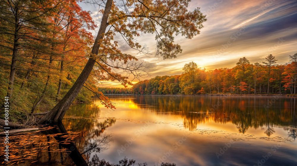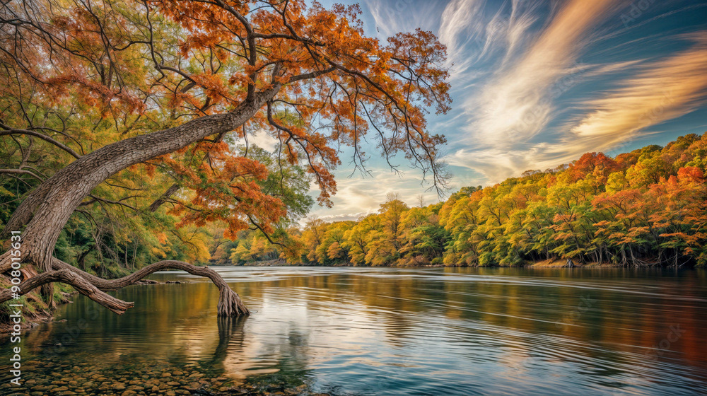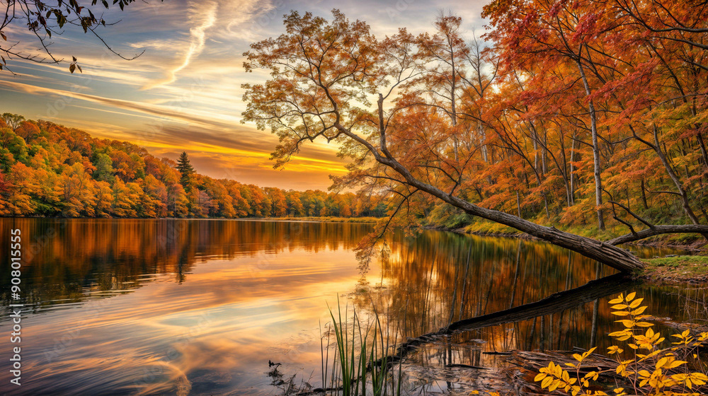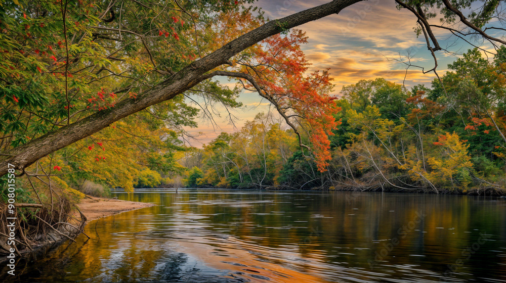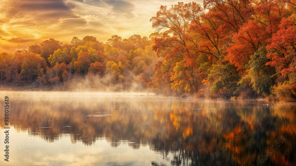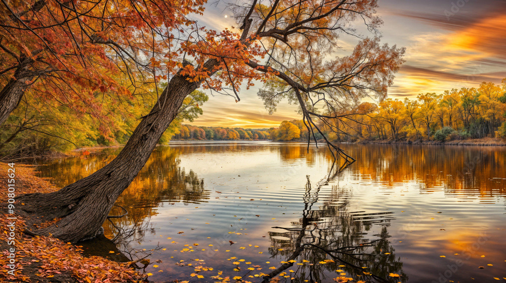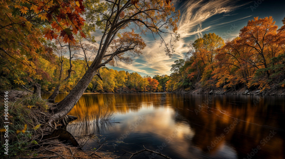 This image showcases a stunning autumn landscape, where vibrant fall foliage in shades of red, orange, yellow, and green reflects beautifully on the calm surface of a river.