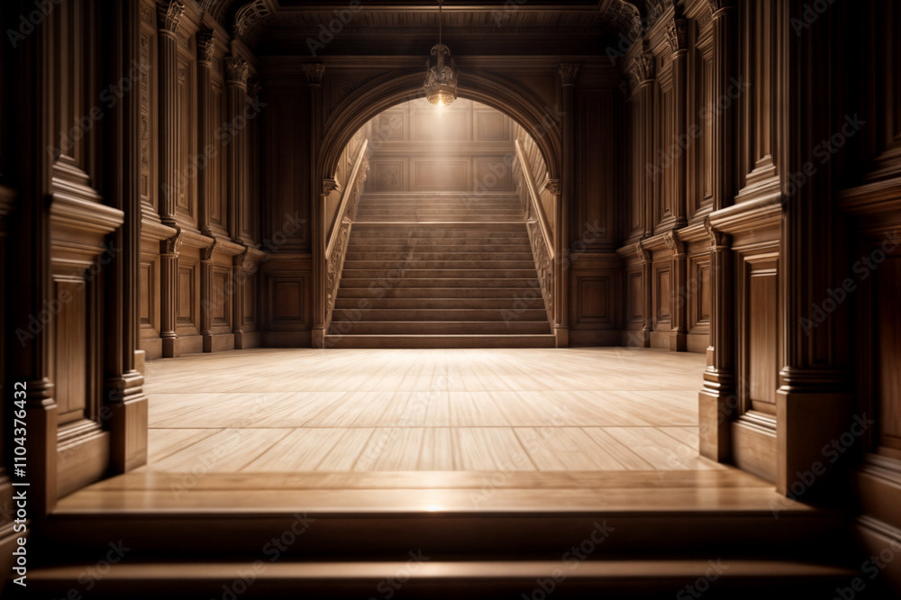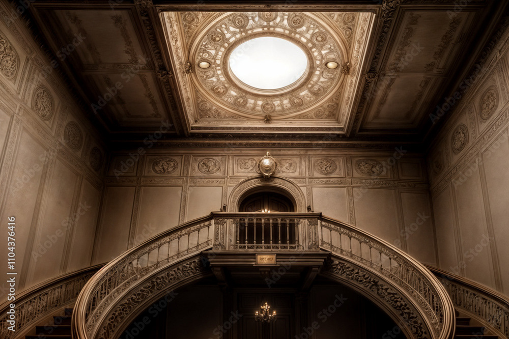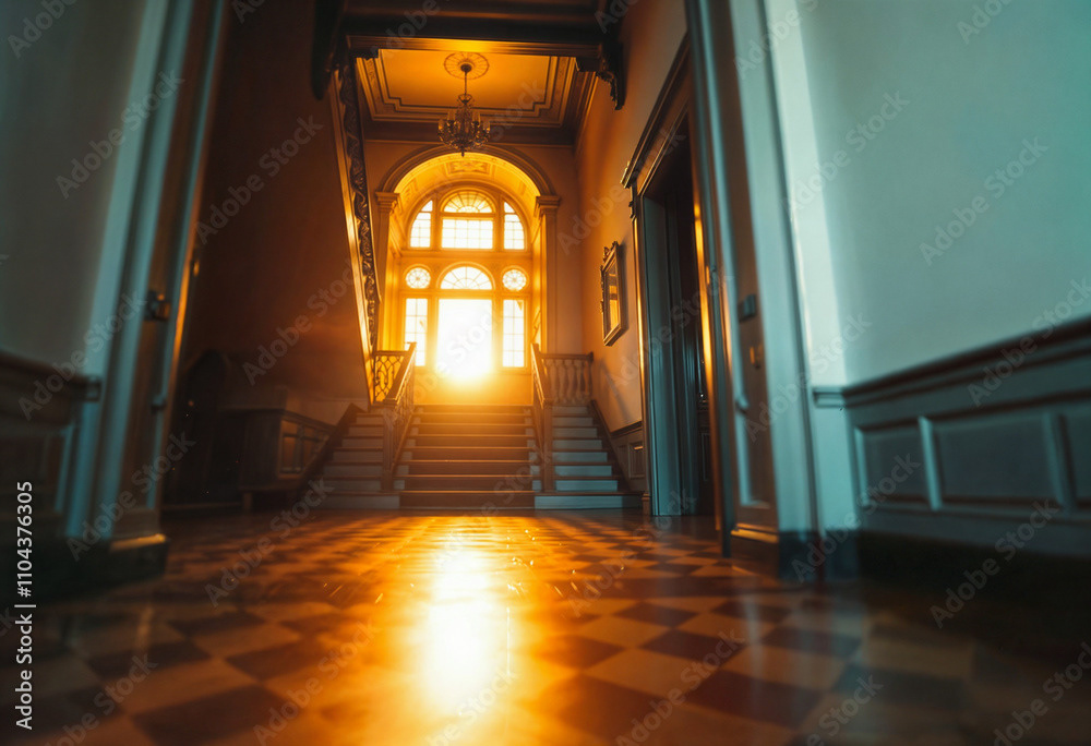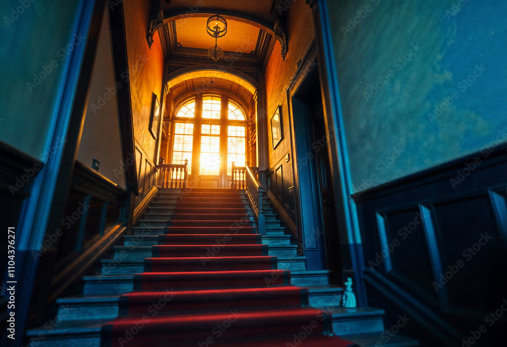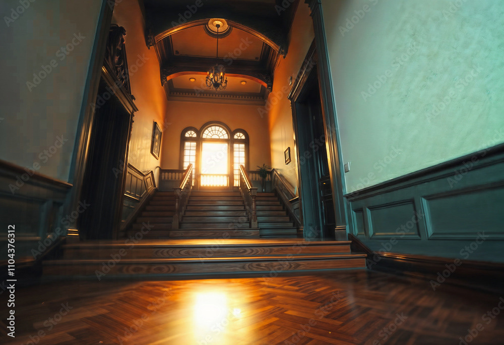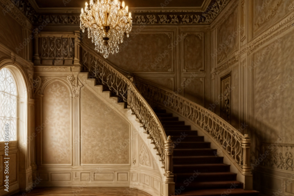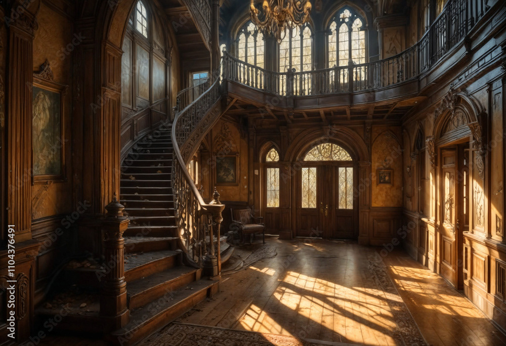 A grand wooden staircase in an abandoned mansion, bathed in soft sunlight streaming through ornate stained-glass windows. The rich architectural details, including the intricate balustrades and high ceilings, contrast beautifully with the peeling wallpaper and scattered debris on the hardwood floors.