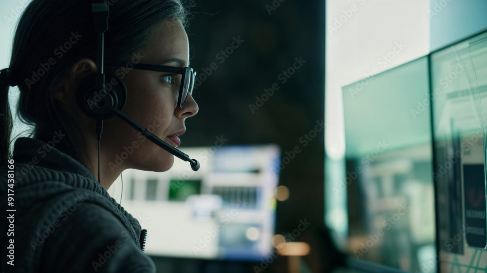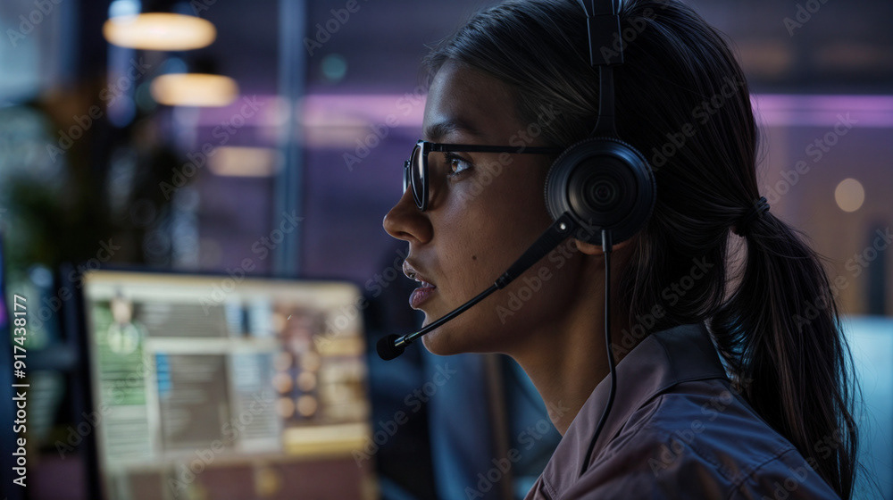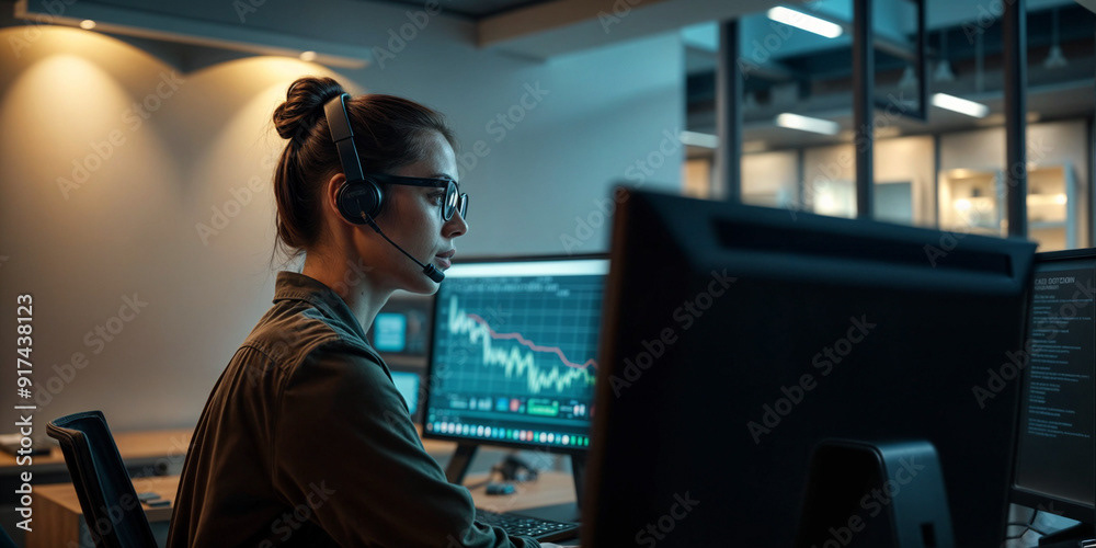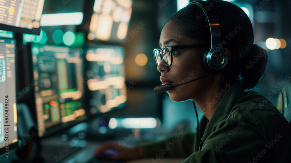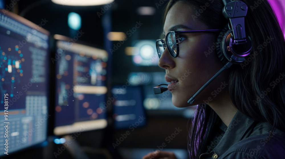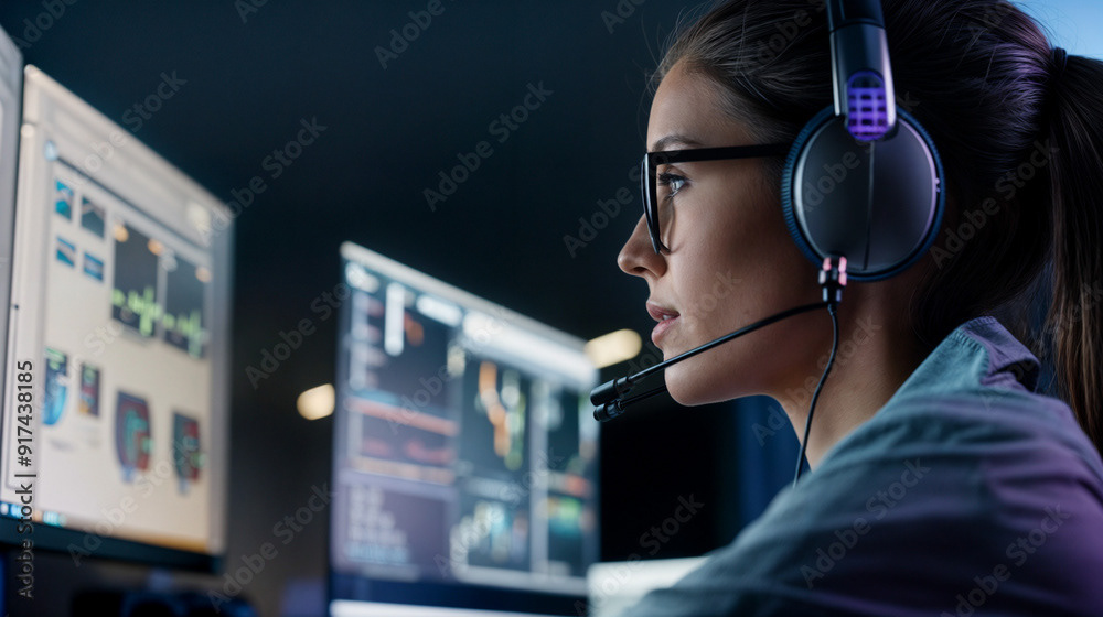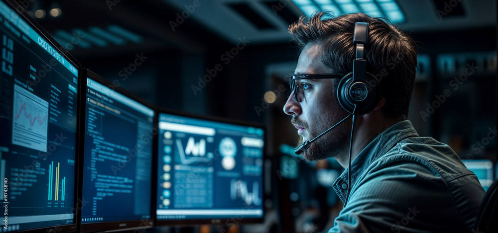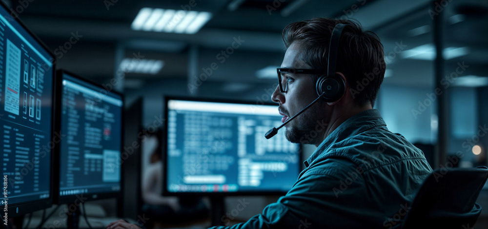 Image of a tech specialist wearing glasses, working on multiple computer screens, and speaking through a headset in a modern, dimly lit office.