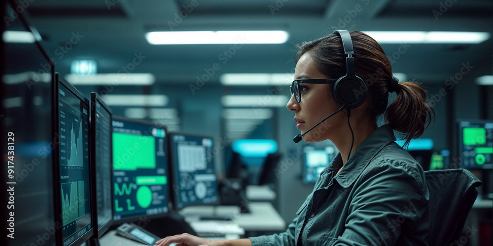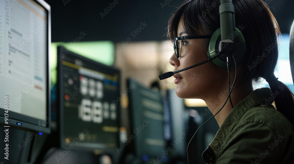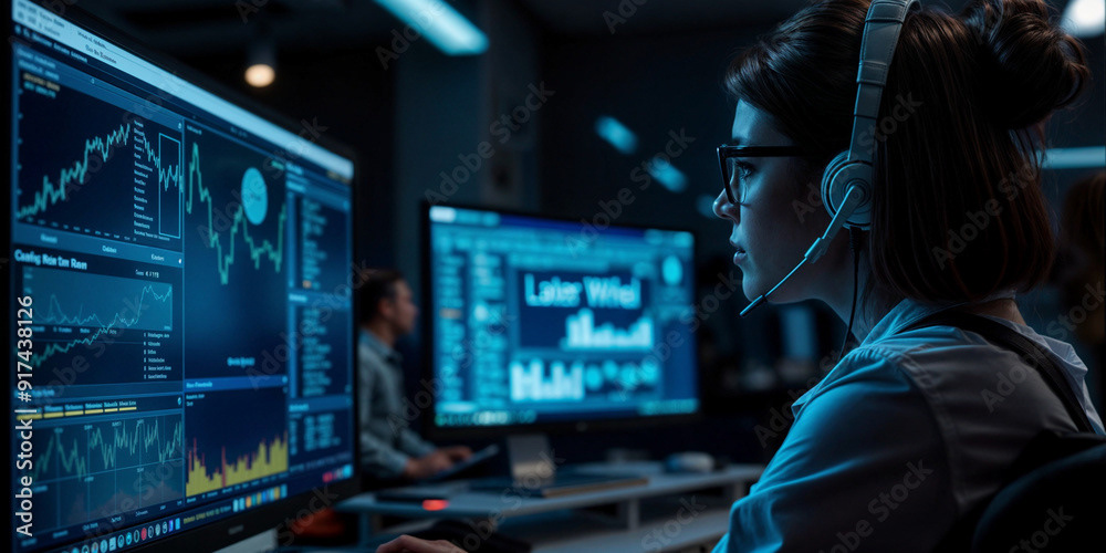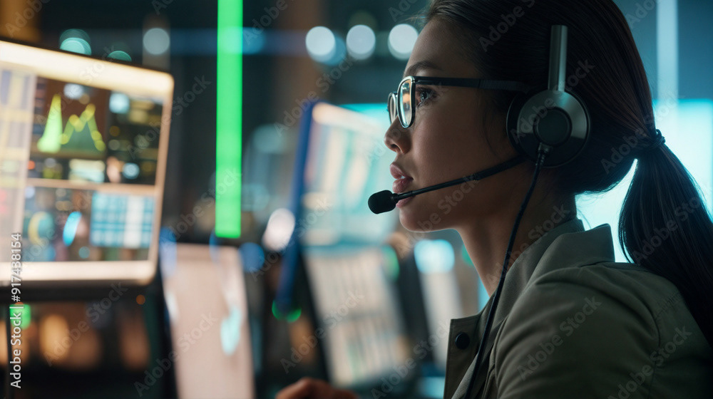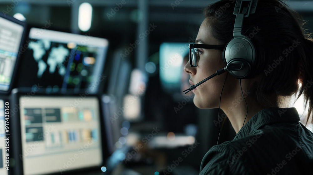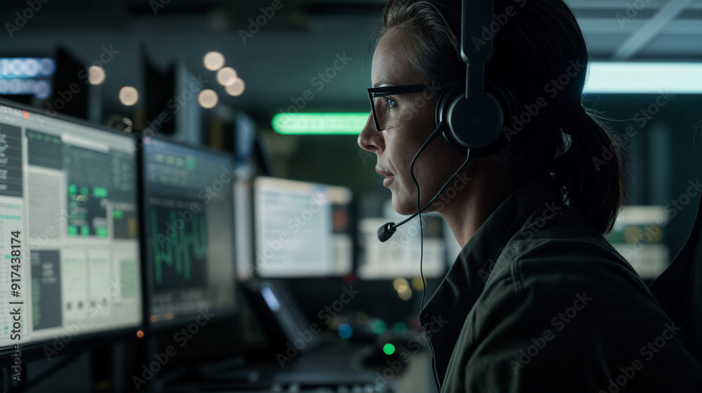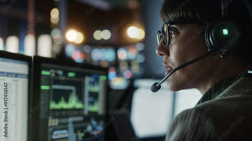 Image of a tech specialist wearing glasses, working on multiple computer screens, and speaking through a headset in a modern, dimly lit office.