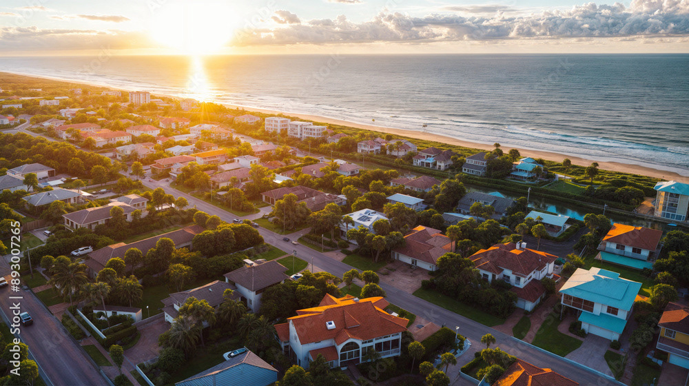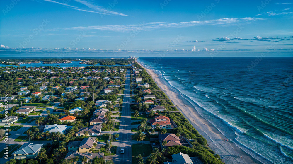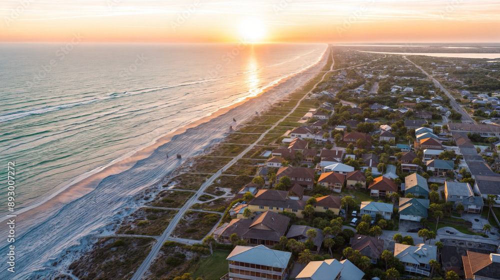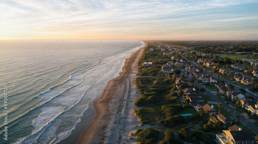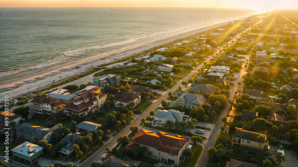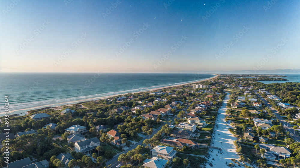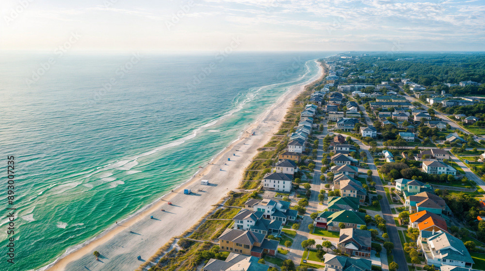Aerial drone shot of a beautiful beach home community, coastal area with homes, beach, and ocean, natural daylight, clear skies, vibrant colors