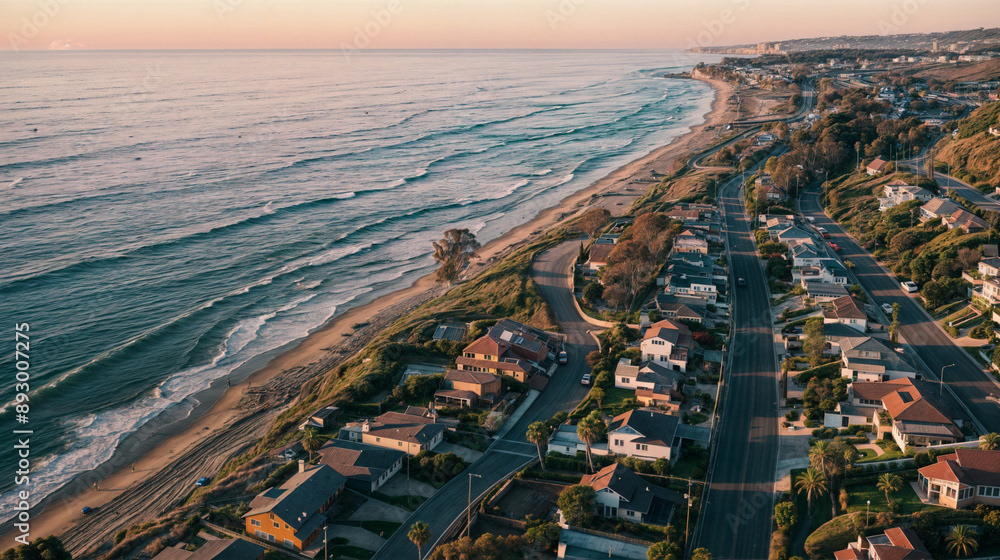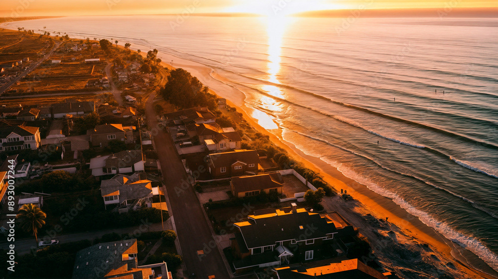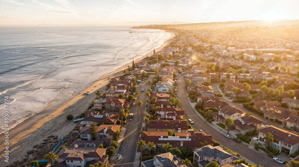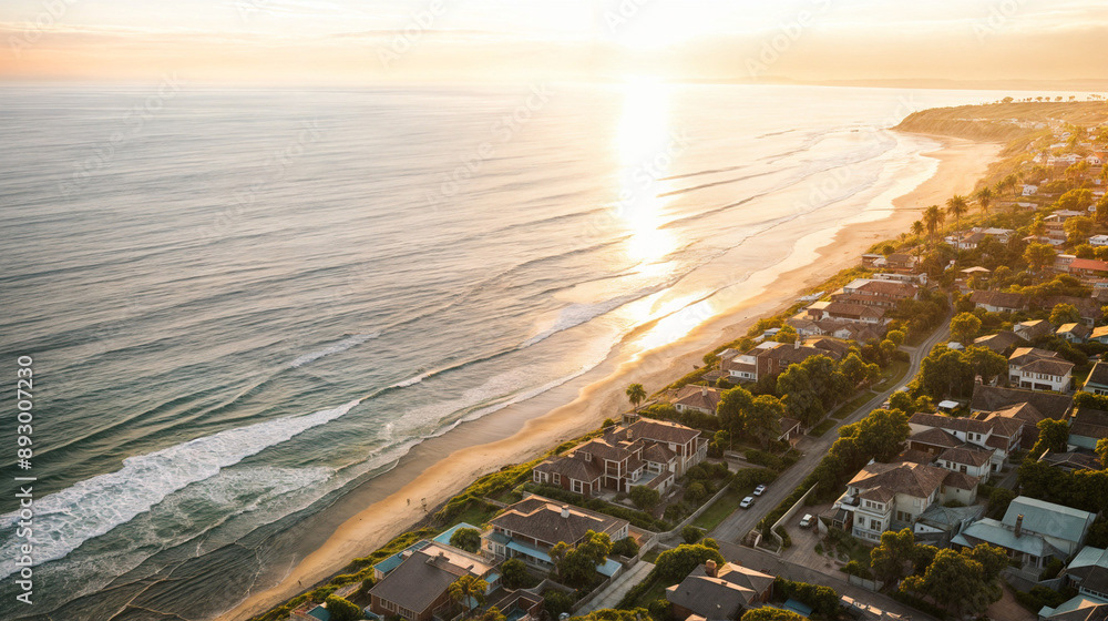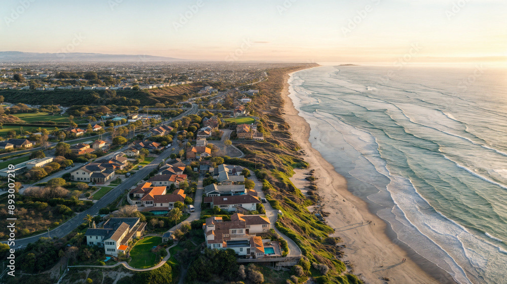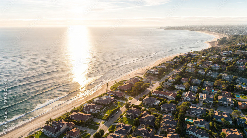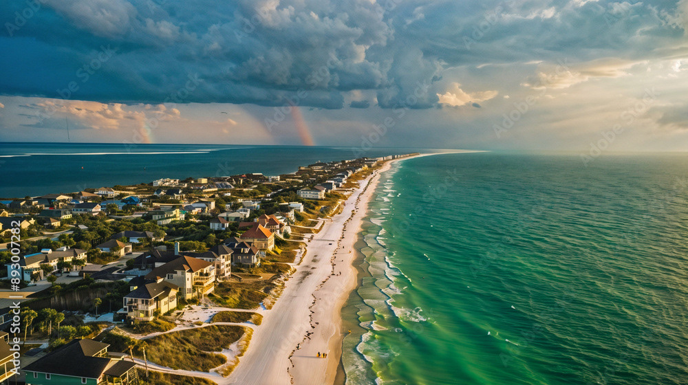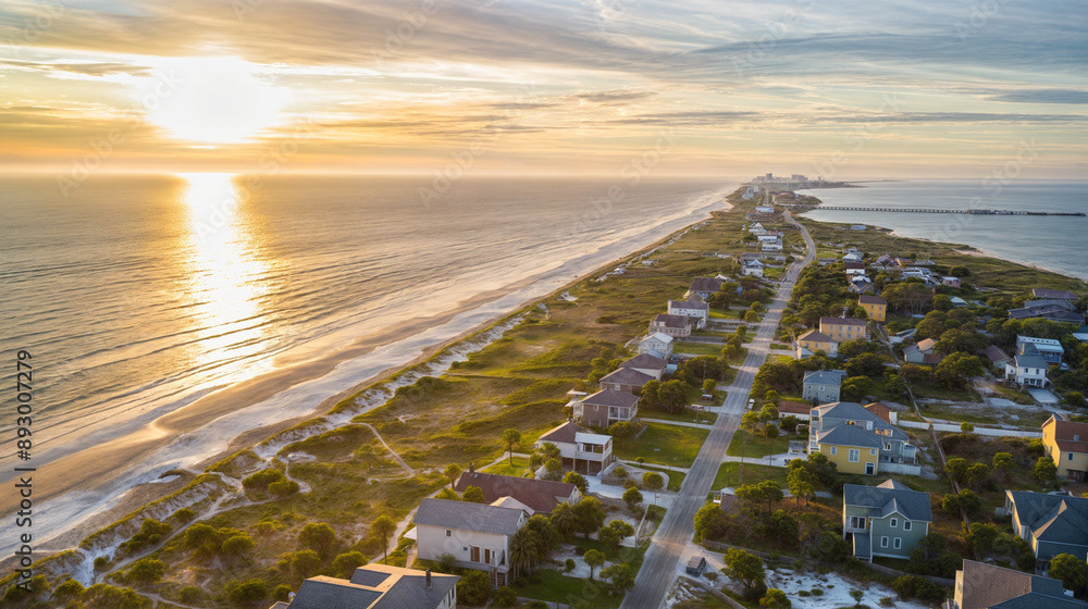 Aerial drone shot of a beautiful beach home community, coastal area with homes, beach, and ocean, natural daylight, clear skies, vibrant colors