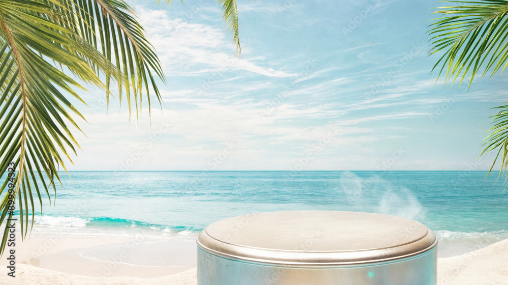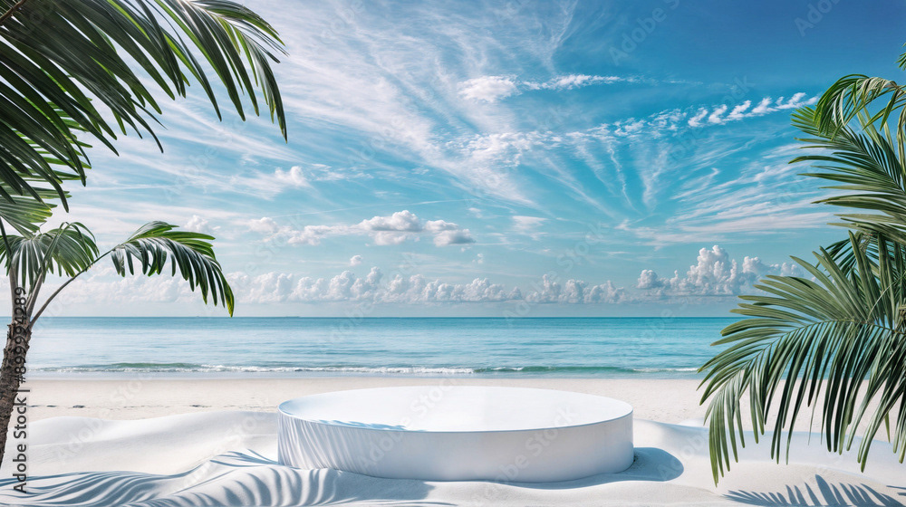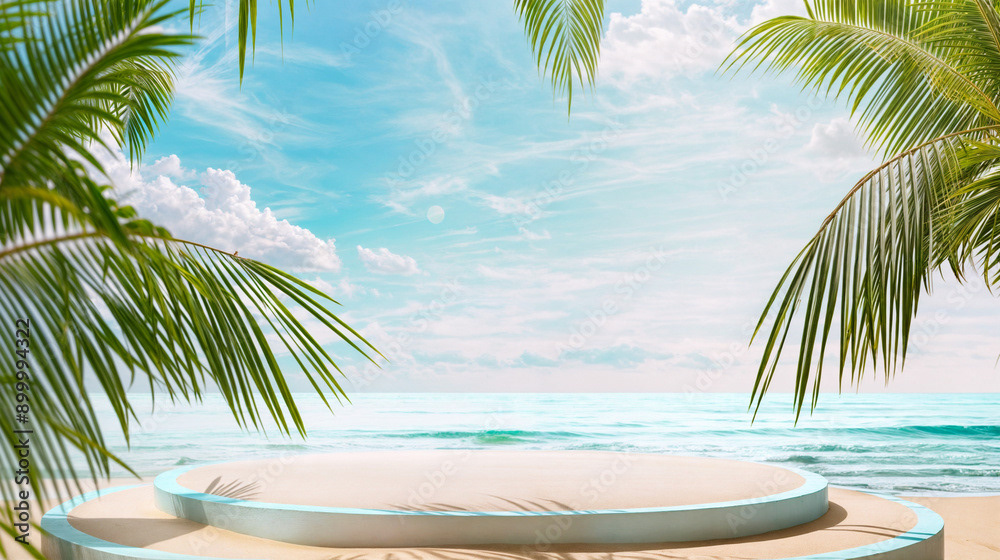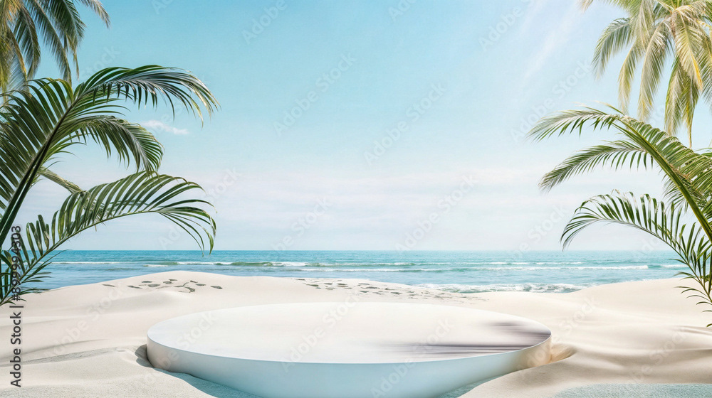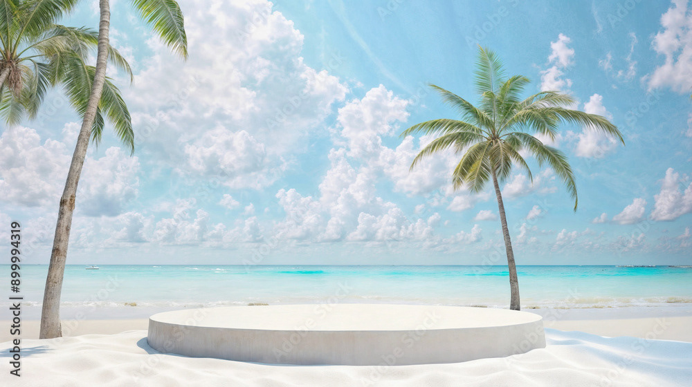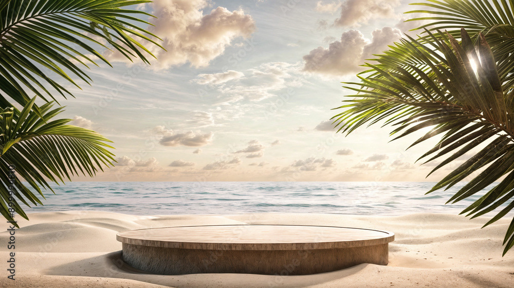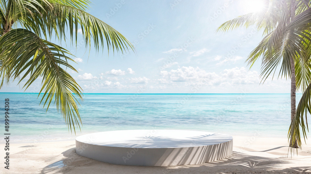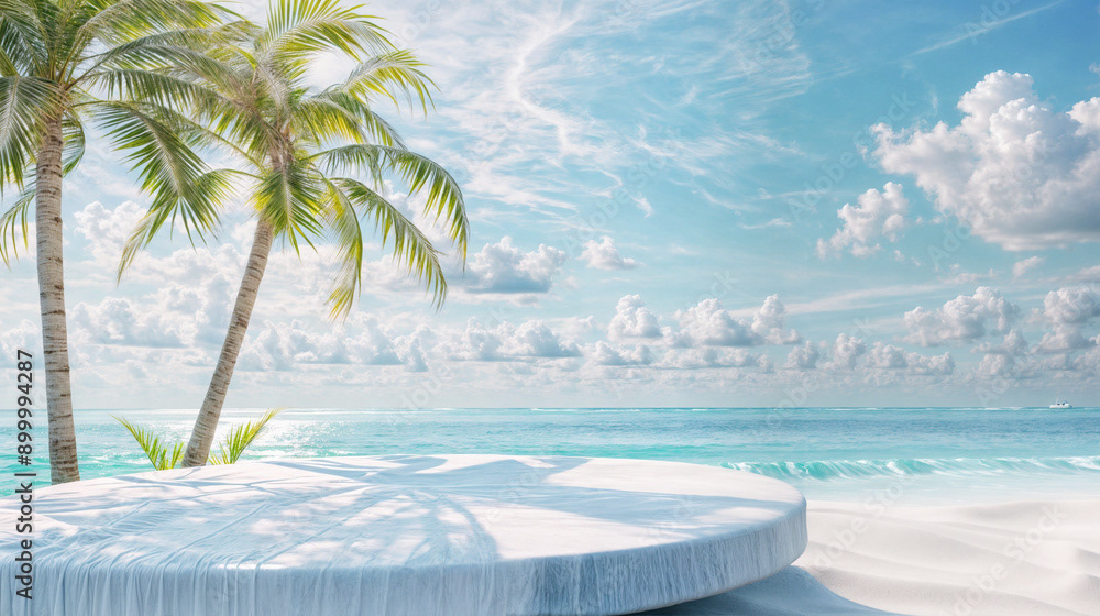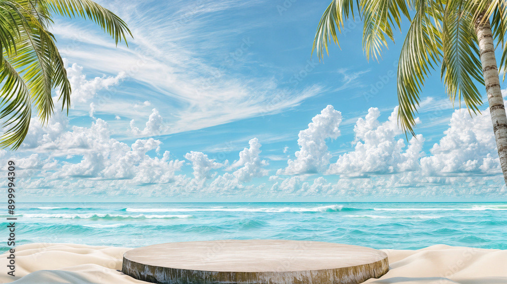 This image presents a tranquil tropical beach scene, perfect for showcasing products or creating a serene, summery atmosphere.