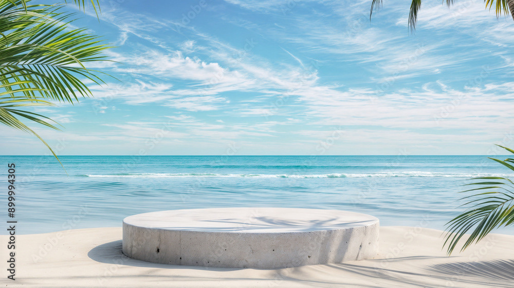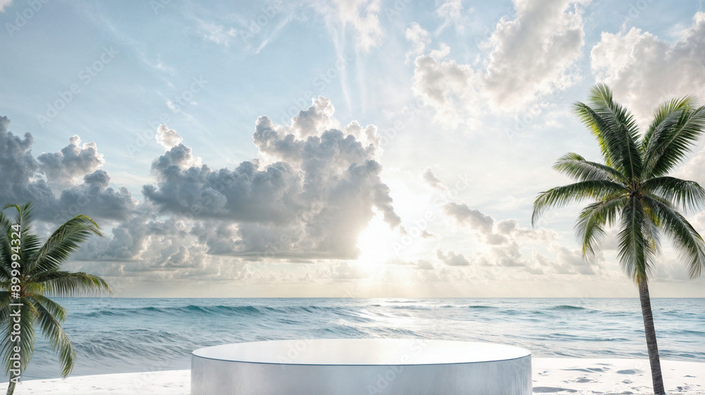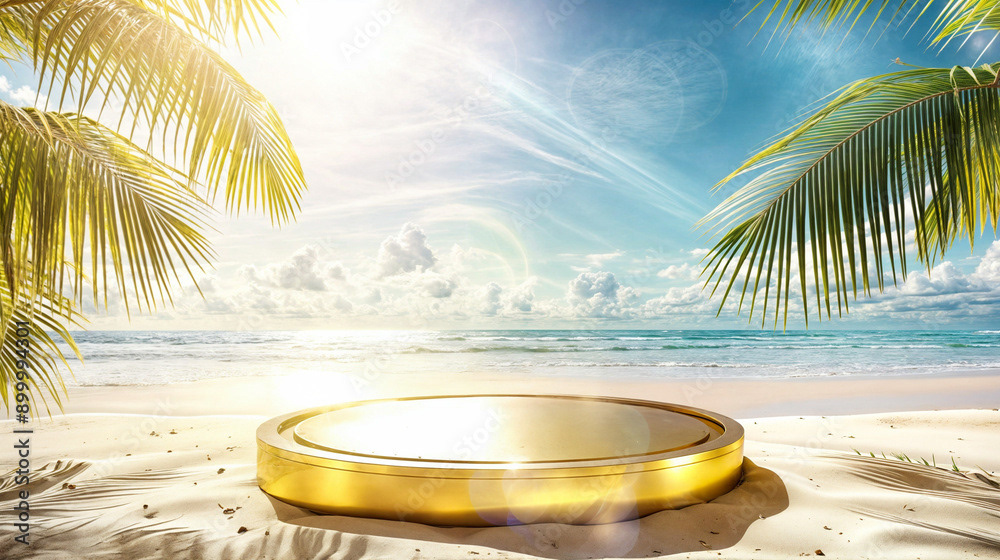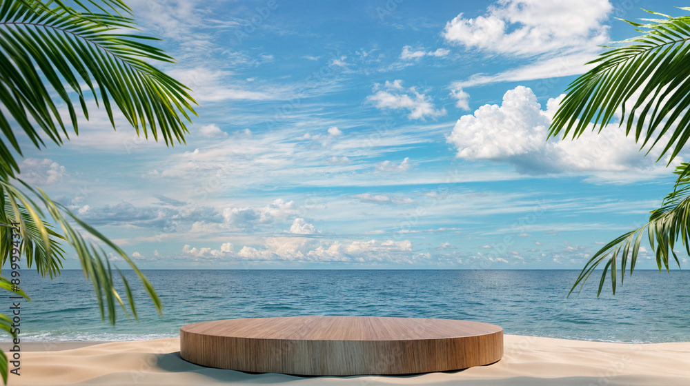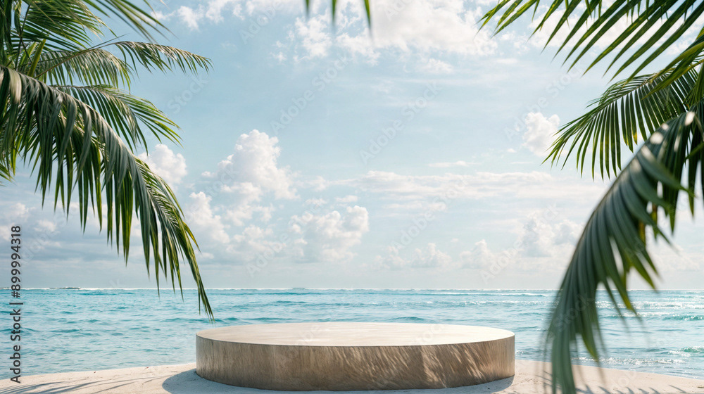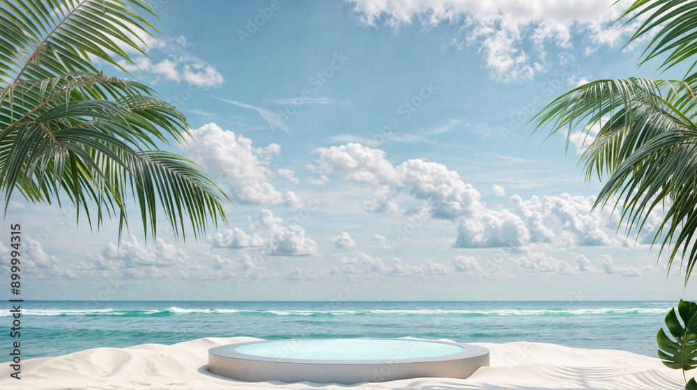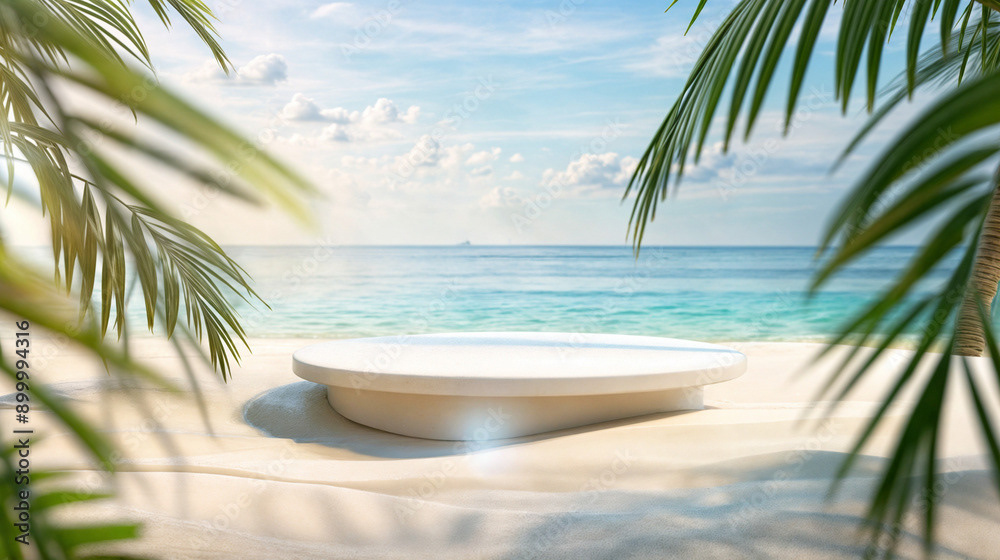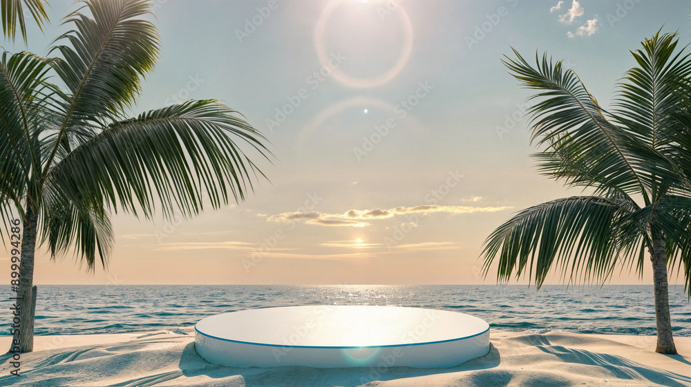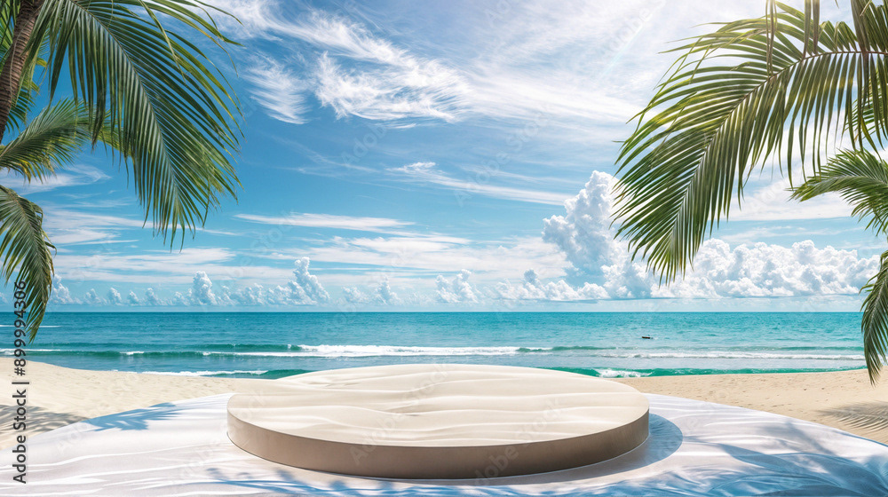 This image presents a tranquil tropical beach scene, perfect for showcasing products or creating a serene, summery atmosphere.