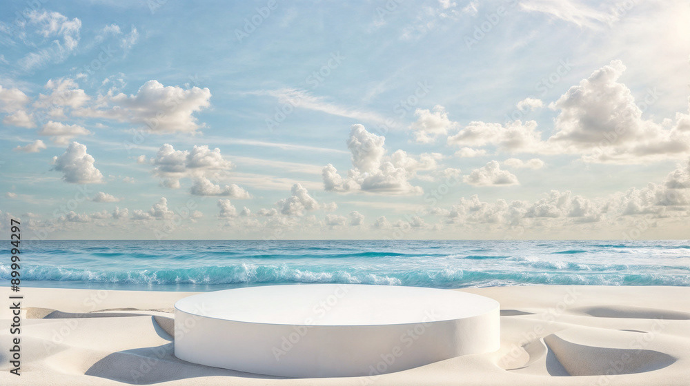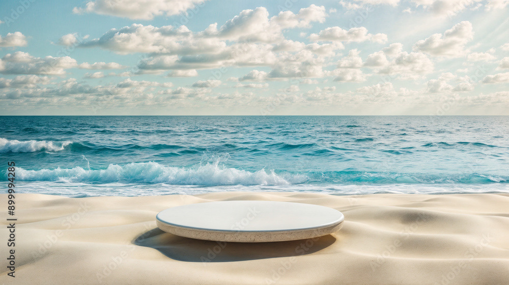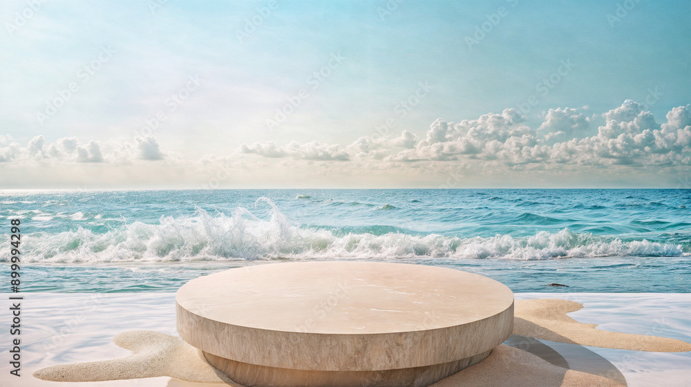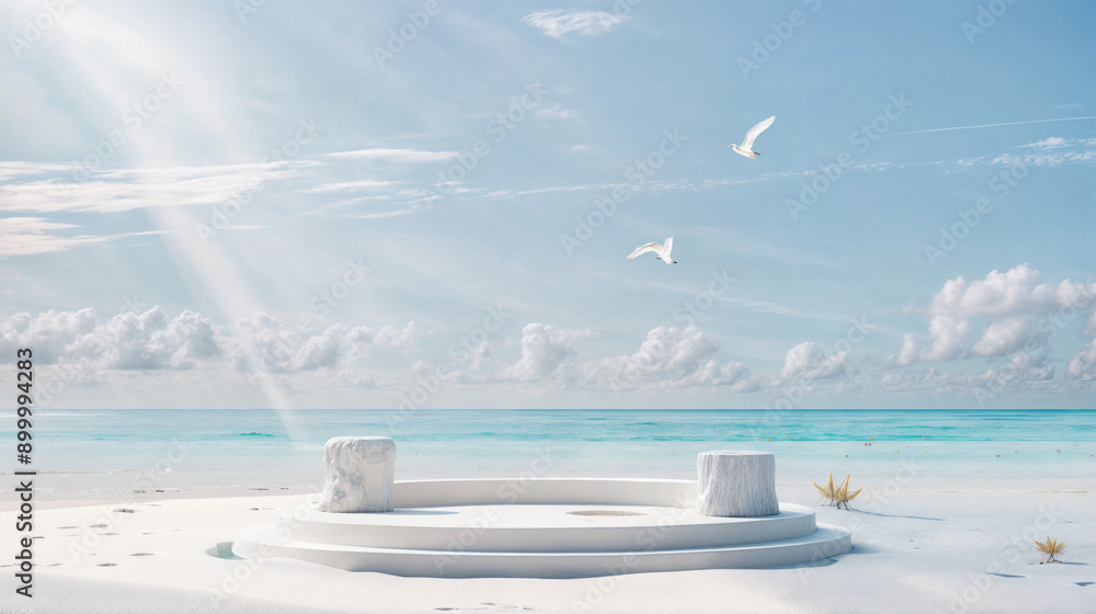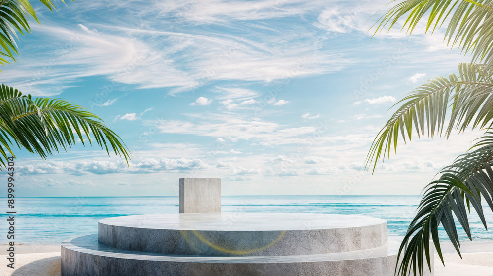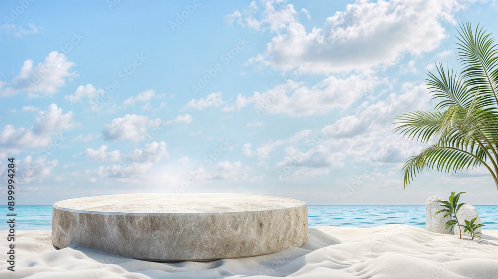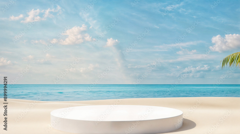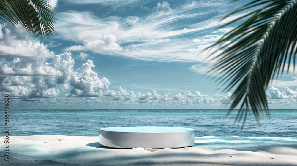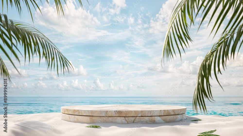 This image presents a tranquil tropical beach scene, perfect for showcasing products or creating a serene, summery atmosphere.