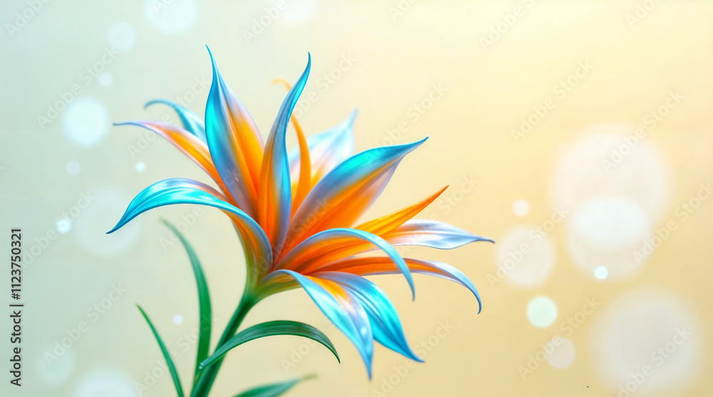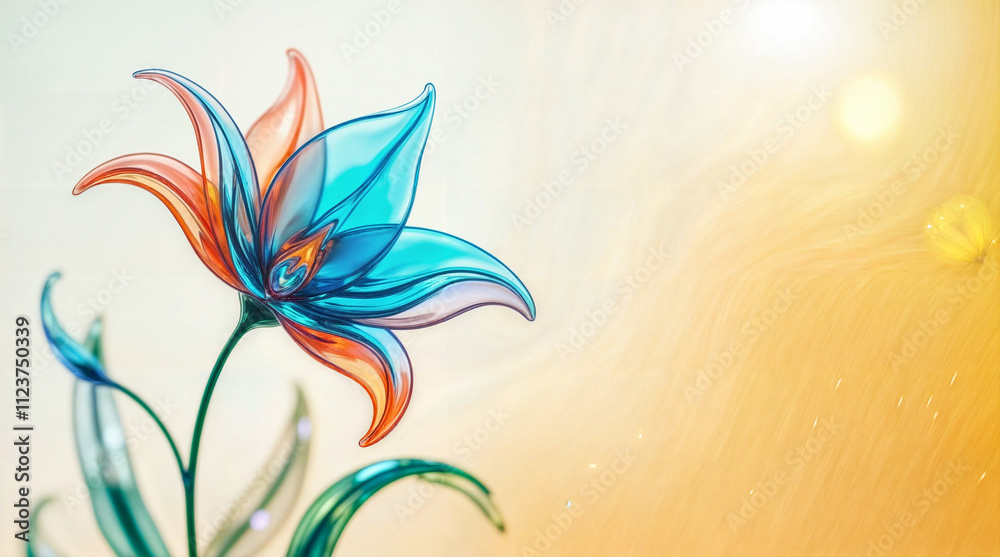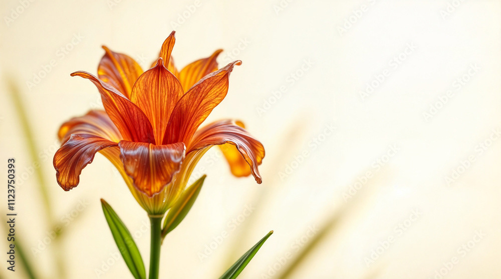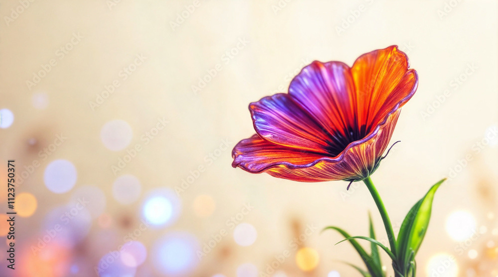A stunning close-up of a vibrant flower with glass-like petals in radiant shades of orange, red, and purple. The luminous, semi-translucent petals reflect light beautifully, showcasing intricate details. The background is softly blurred in a warm beige tone, emphasizing the delicate artistry of the flower.