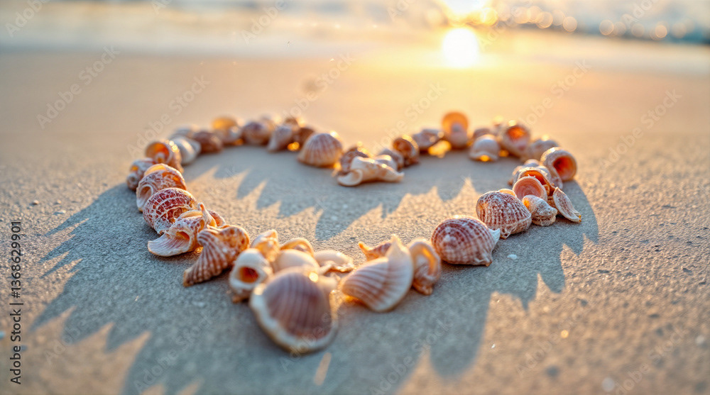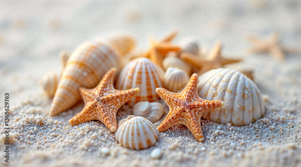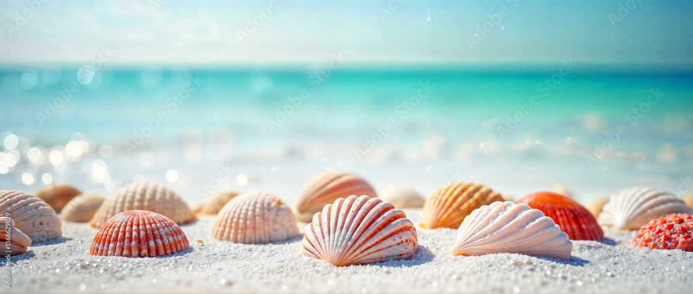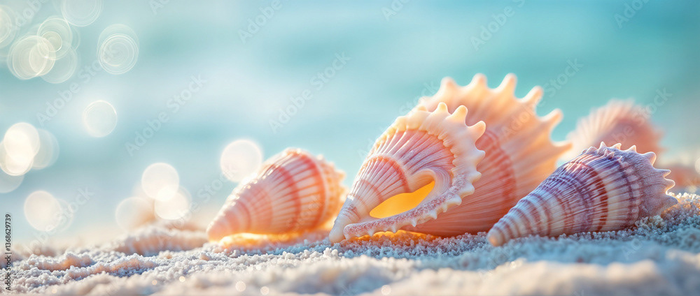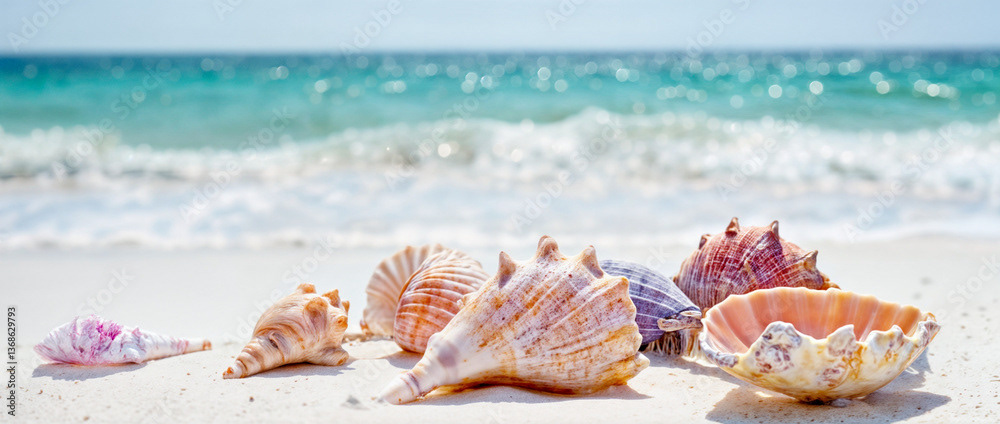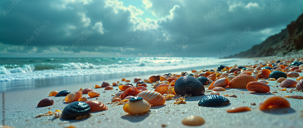 a wide shot of vibrant, glossy seashells clustered on bright white beach sand, with a stormy blue ocean under a glowing sky, dramatic lighting and intense shadows, atmospheric haze and film-like color grading, cinematic vivid style