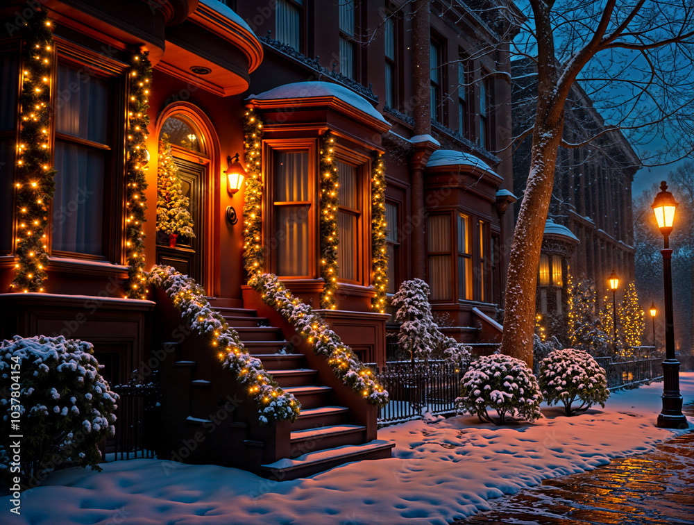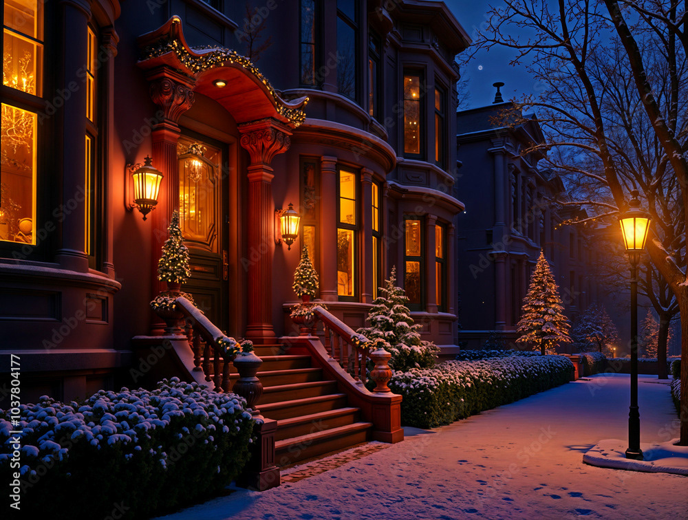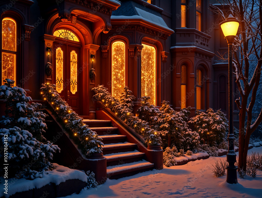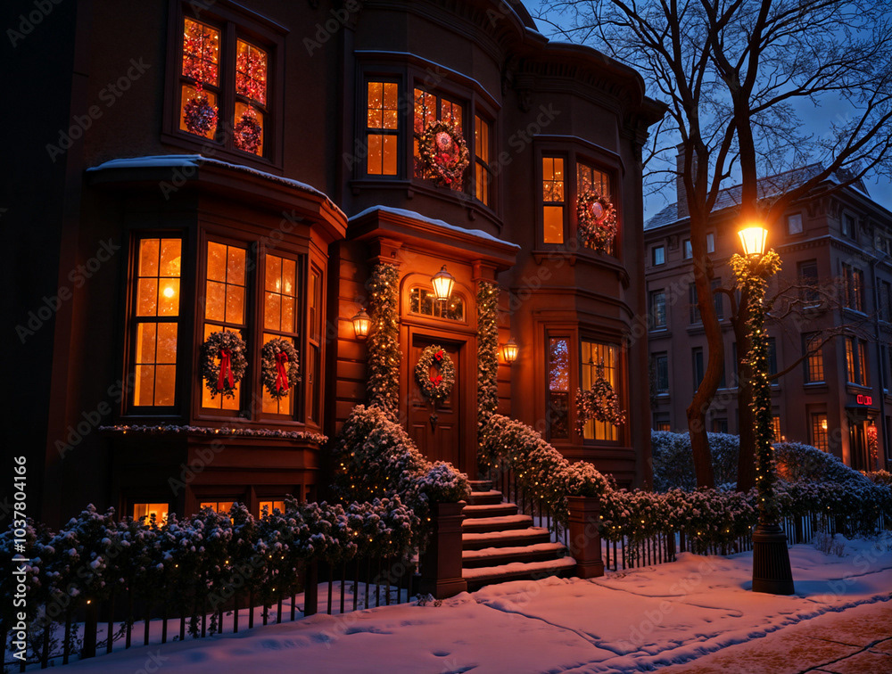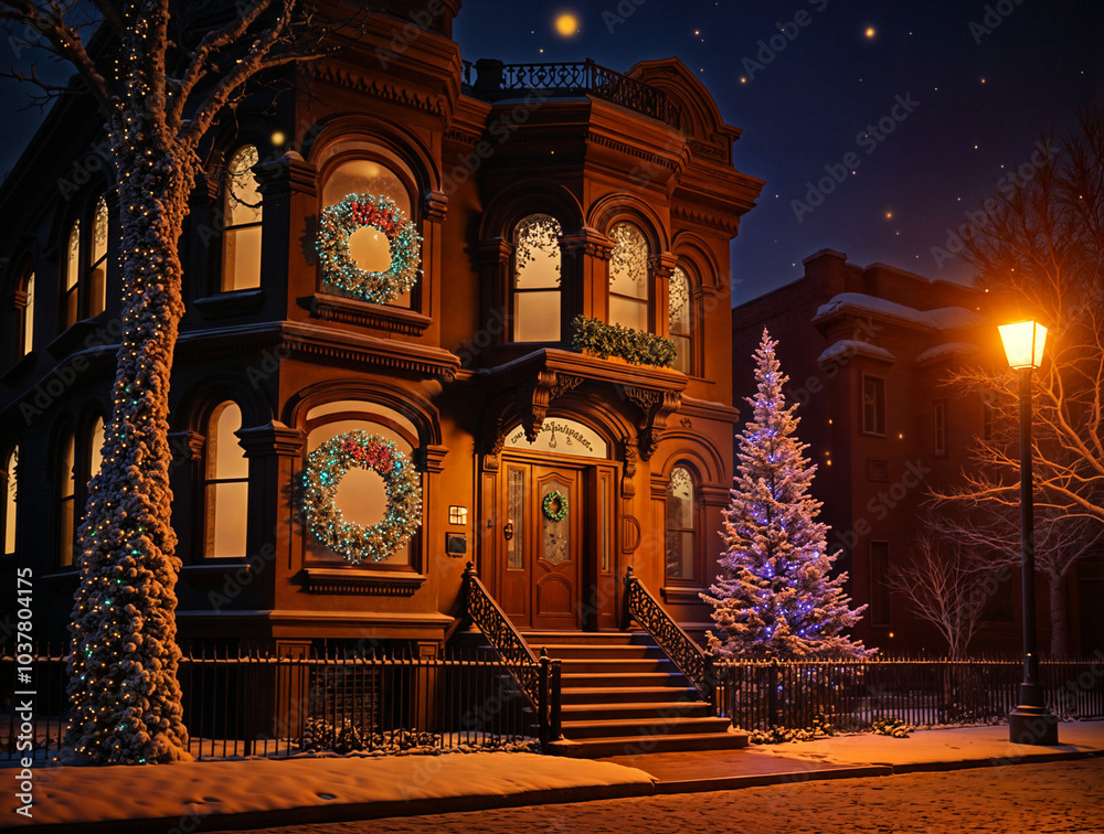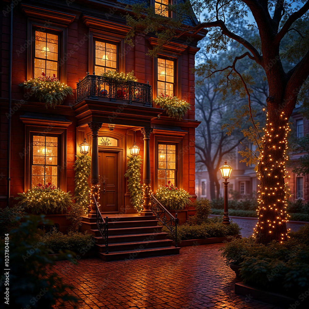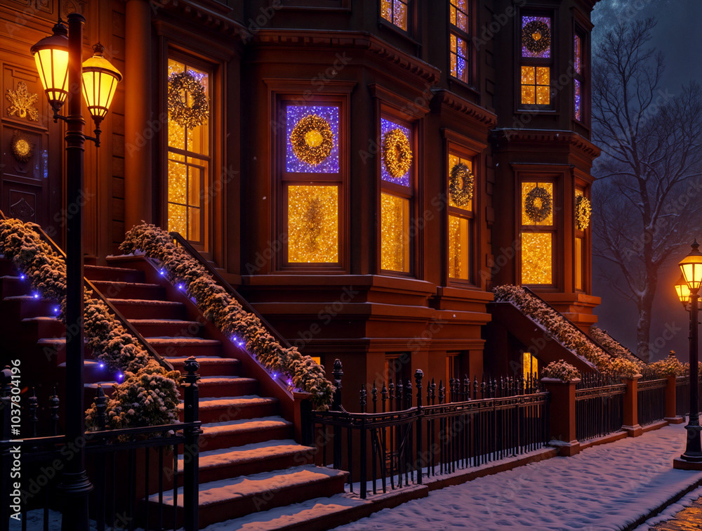 a Victorian brownstone is beautifully illuminated by vibrant Christmas lights.