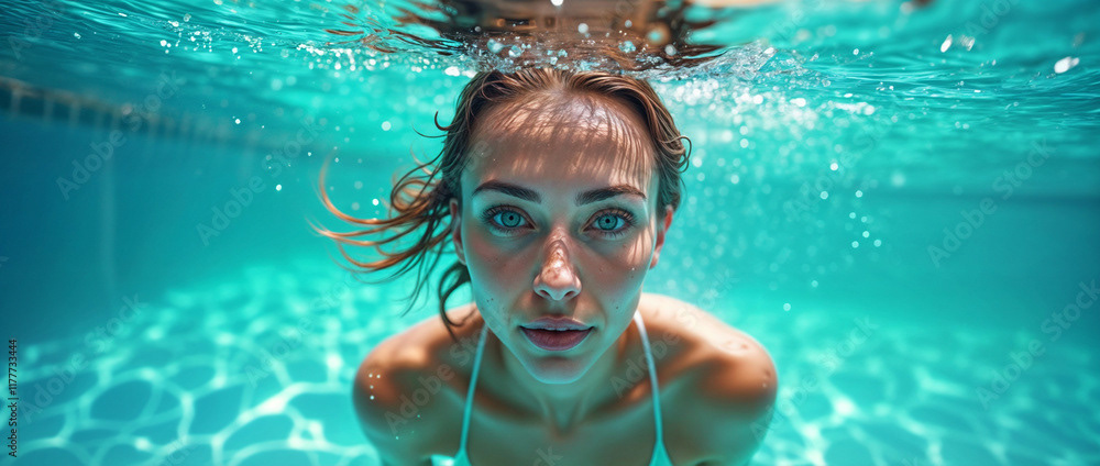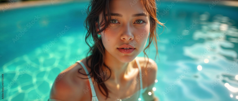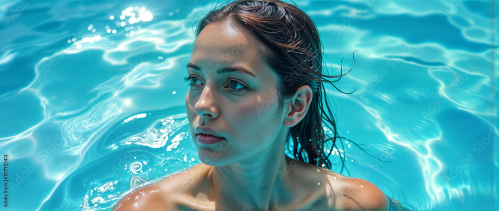 A serene woman enjoying a relaxing moment in a crystal-clear swimming pool under the bright sun.